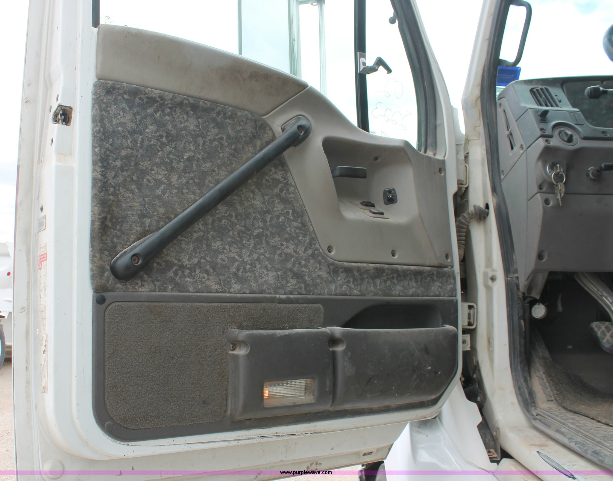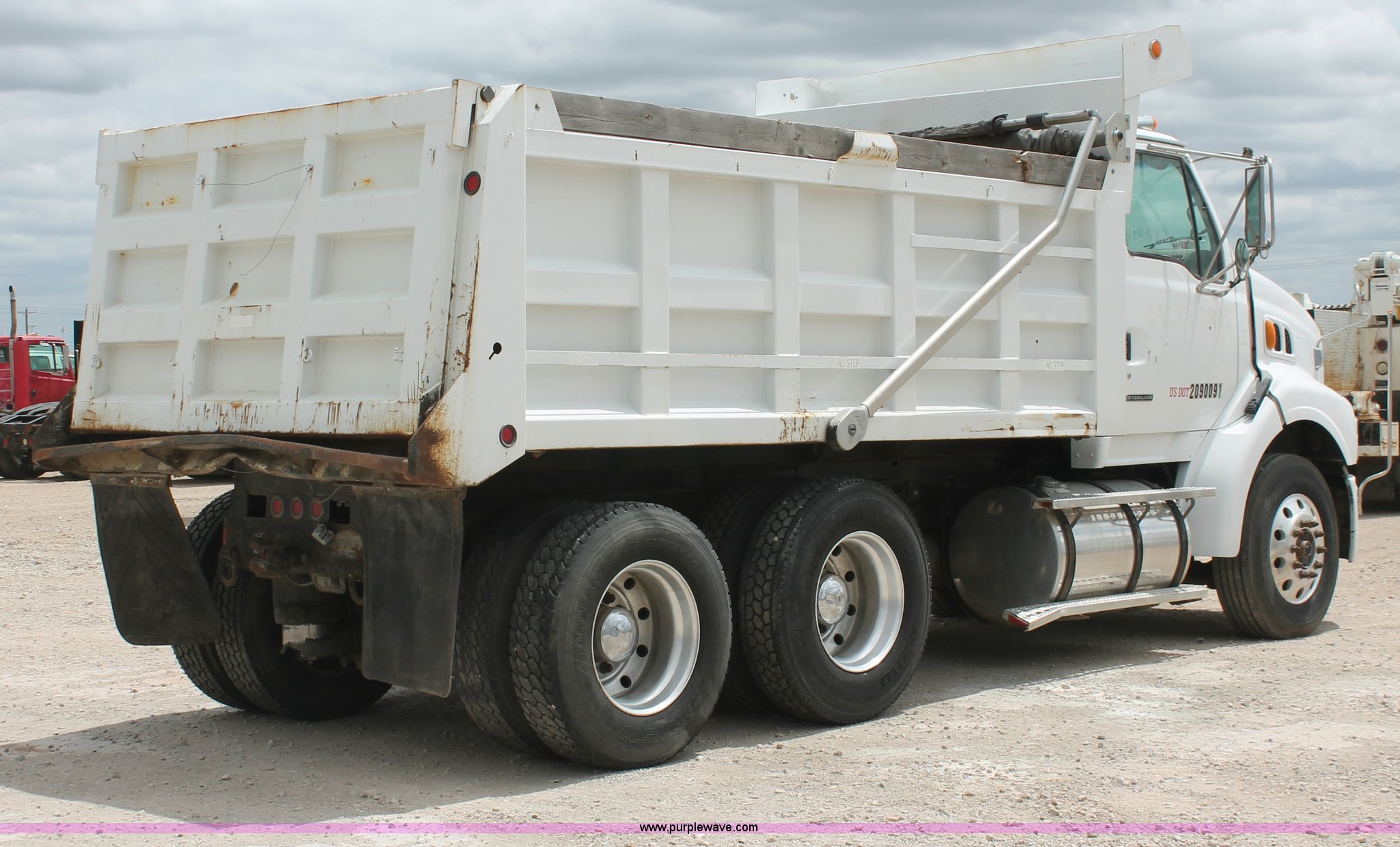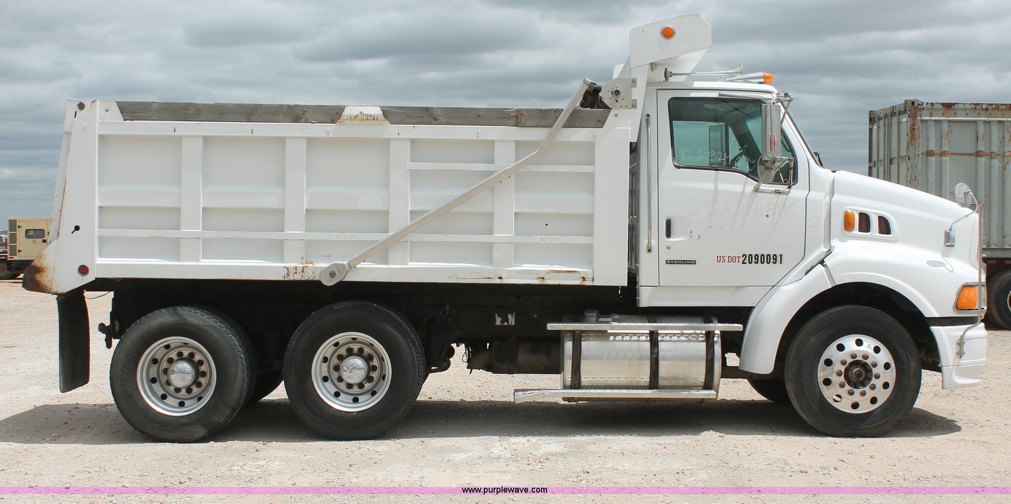 Purple Wave is selling a used Construction Dump Truck in Oklahoma. This item is a 2002 Sterling AT9500 Dump truck with the following: 217,863 miles on odometer, Caterpillar C12 12.0L L6 diesel engine, 370 HP, Serial 2KS72558, Meritor 10 speed manual transmission, AC and heat, Cruise, AM/FM/CD, Power windows and mirrors, Heated mirrors, Air suspension seat, Air ride cab, Axle lock switch, Wheel lock switch, Dump valves, Fifth wheel slide switch, Traction control switch, Trailer brake switch, 170"L x 96"W dump beds, 40"H side boards, Air operated end gate, Single ram two stage hoist, Rollover tarp, Dual fuel tanks, 125 and 50 gallon capacity, PTO, Air suspension, Air brakes, 176" wheelbase, Alloy wheels, 295/75R22.5 tires, GVWR 46,000 lbs, FAWR 12,000 lbs, RAWR 20,000 lbs