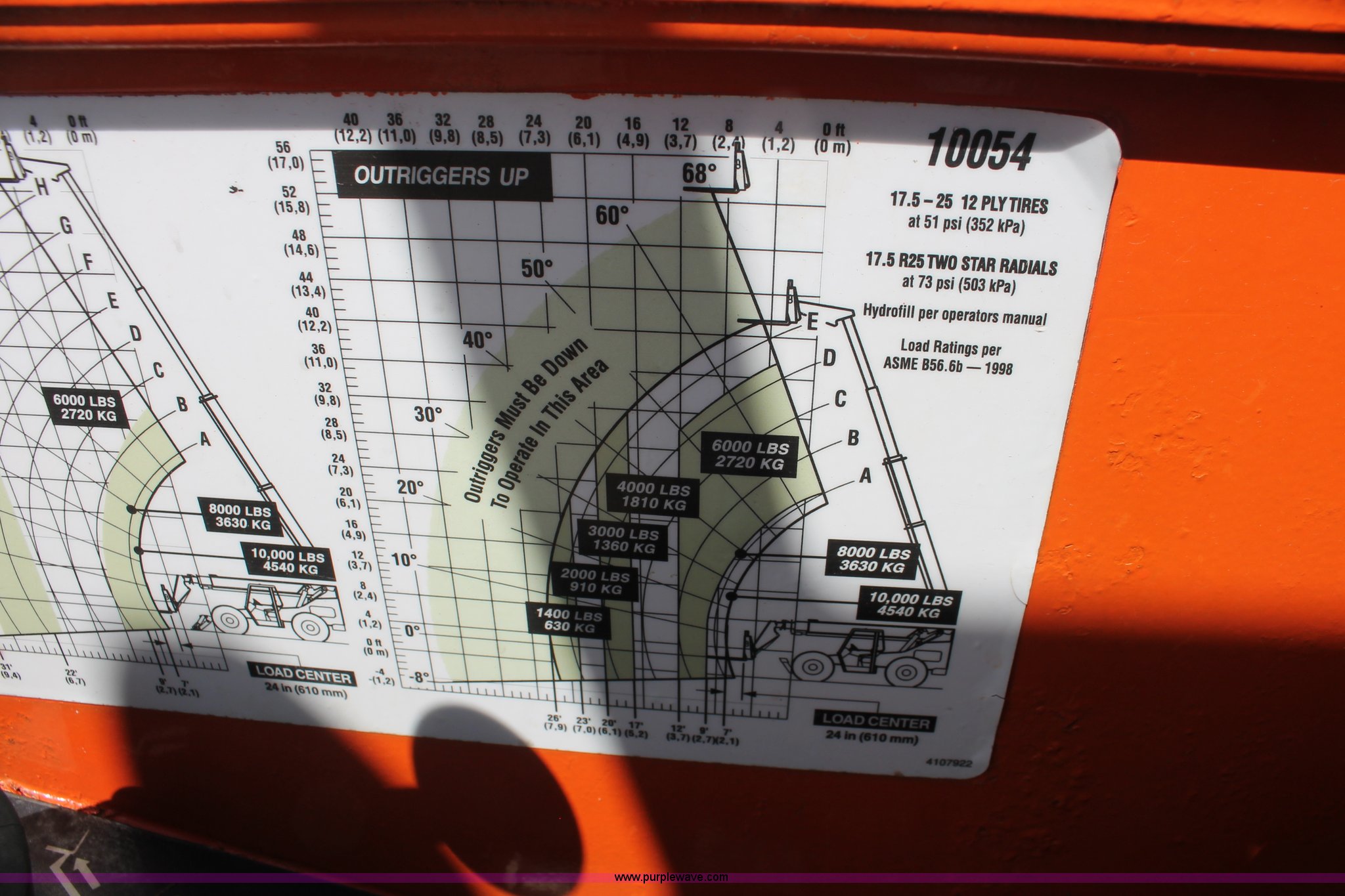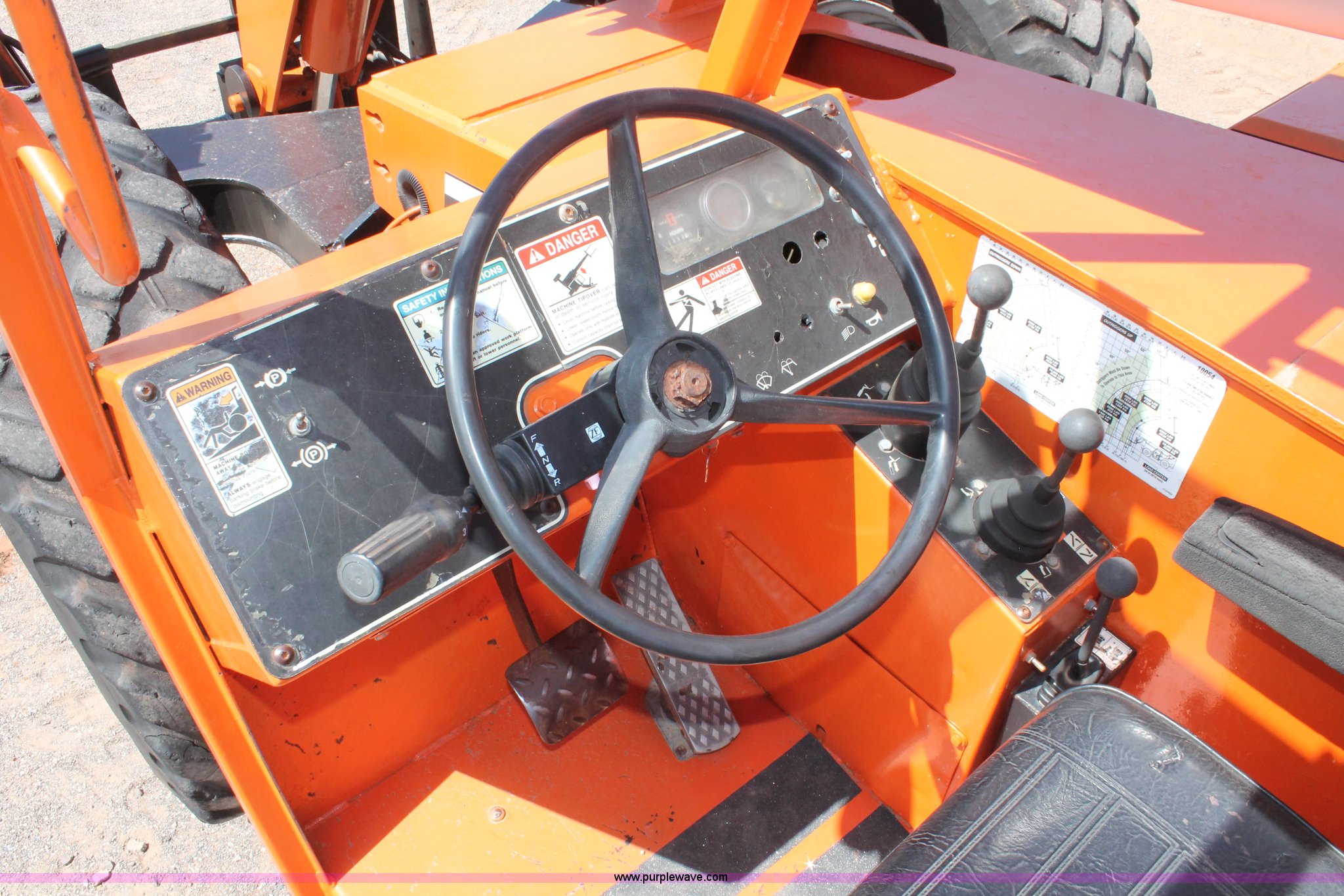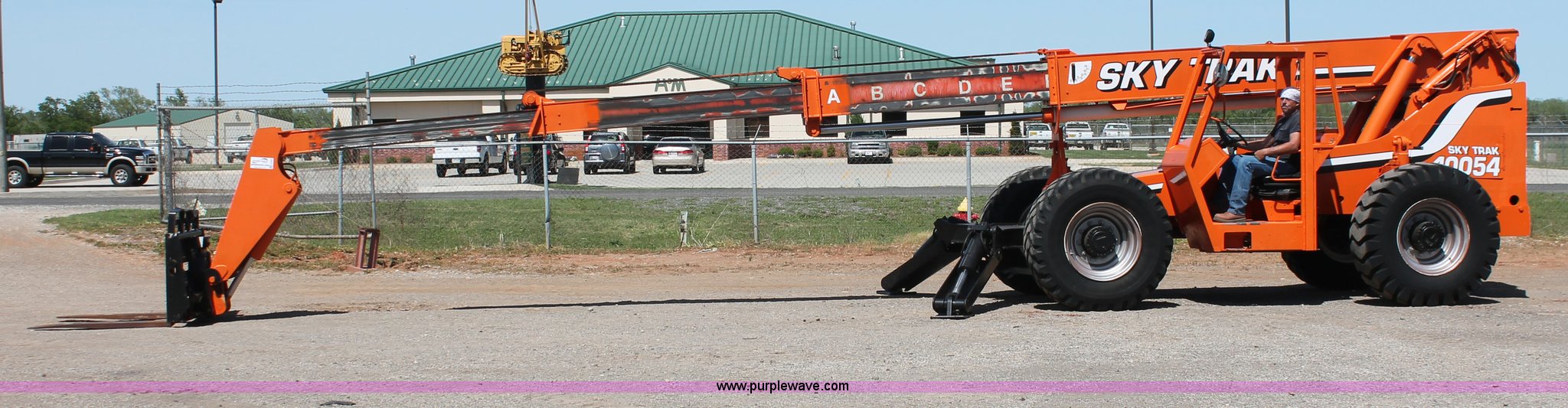 Purple Wave is selling a used Telehandler in Oklahoma. This item is a 1999 SkyTrack 10542 telehandler with the following: 7,258 hours on meter, Cummins B3.9 four cylinder diesel engine, 116 HP, Serial 45889332, Powershift transmission, 4F-4R gears, Four wheel drive, Locking differential, Circle steer, Crab steer, ROPS, Spring suspension seat, Work light, 10,000 lbs maximum lift capacity, 42' maximum lift height, Four boom sections, 48"L x 4.5"W forks, Hydraulic outriggers, Tilt carriage, Rotating carriage, Hydraulic leveling, Quick attach, Michelin 17.5R25 tires, Three tires foam filled, 27,300 lbs. base operating weight, Skytrak 10054 graphics, Serial 10740