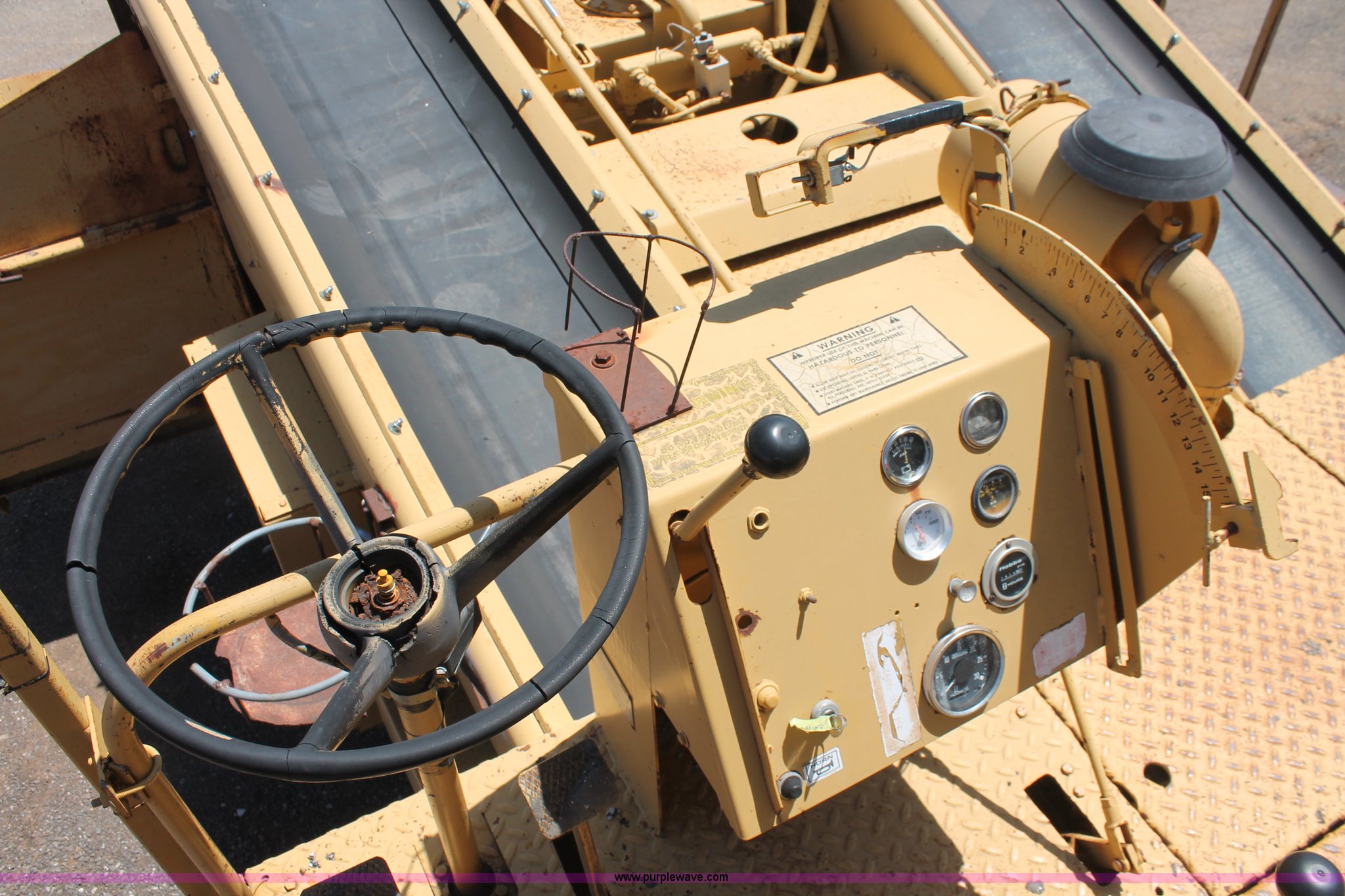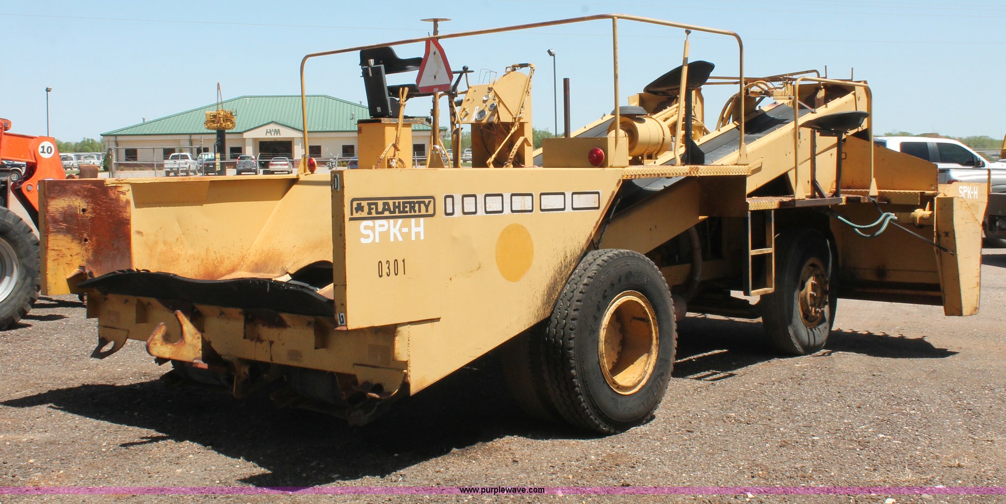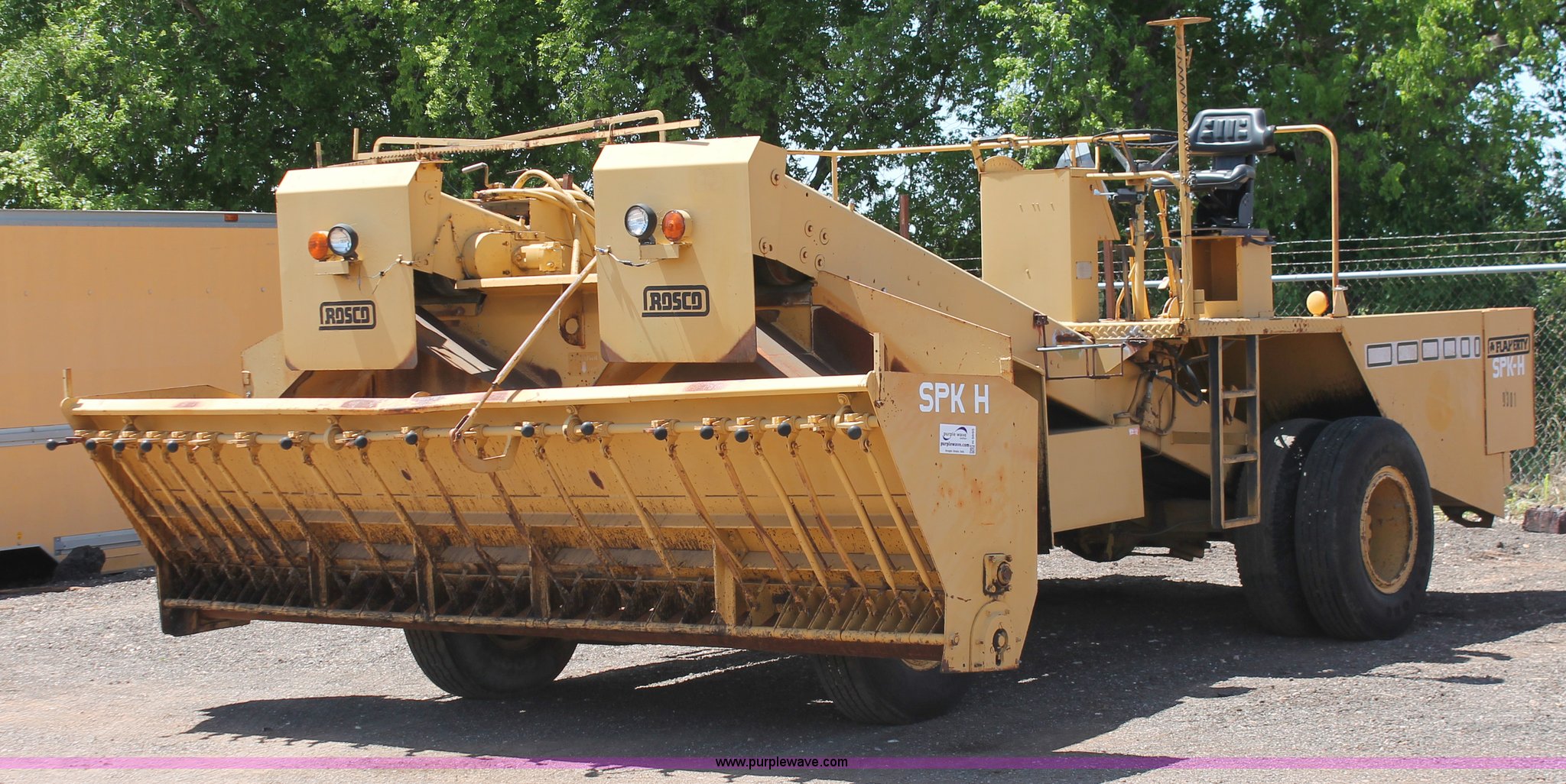 Purple Wave is selling a used Chip Spreader in Oklahoma. This item is a Rosco Flaherty SPK-H chip spreader with the following: 1,412 hours on meter, Allis Chalmers six cylinder diesel engine, Four speed transmission, Hi-Lo, Dual operator's seats, Driver's spring suspension seat, Front work lights, (19) directional slides, 14' header, (2) 20"W rubber conveyors, Firestone 10.00R20 tires, Serial 10015