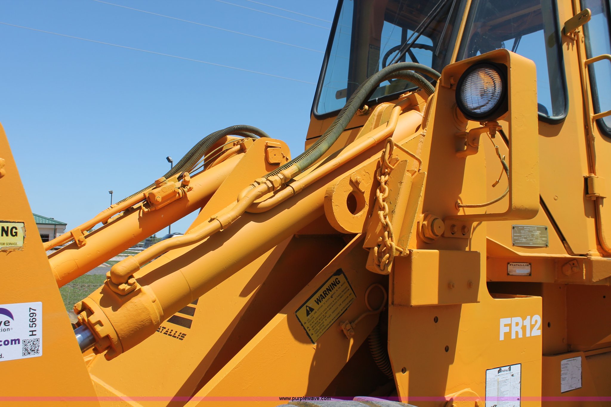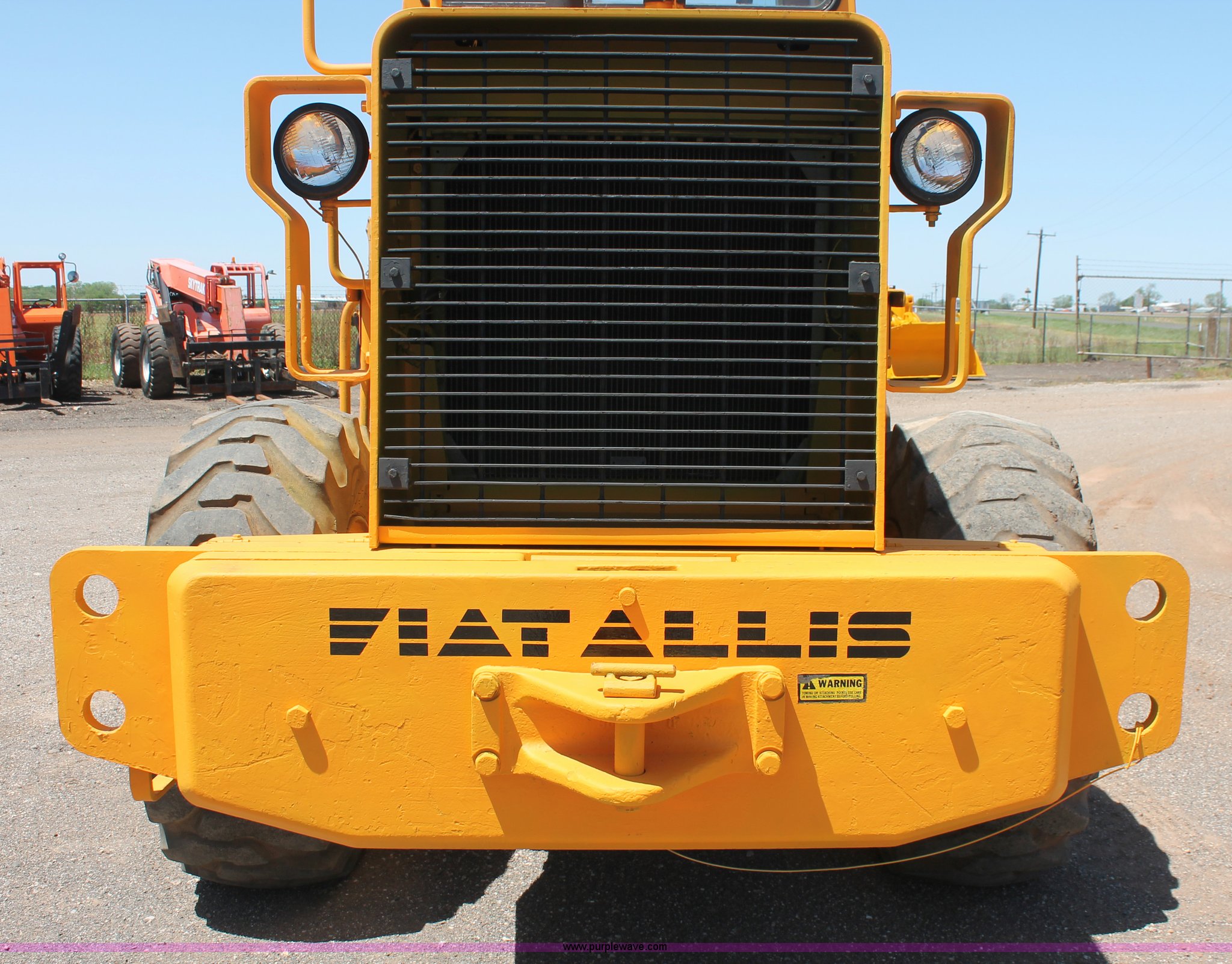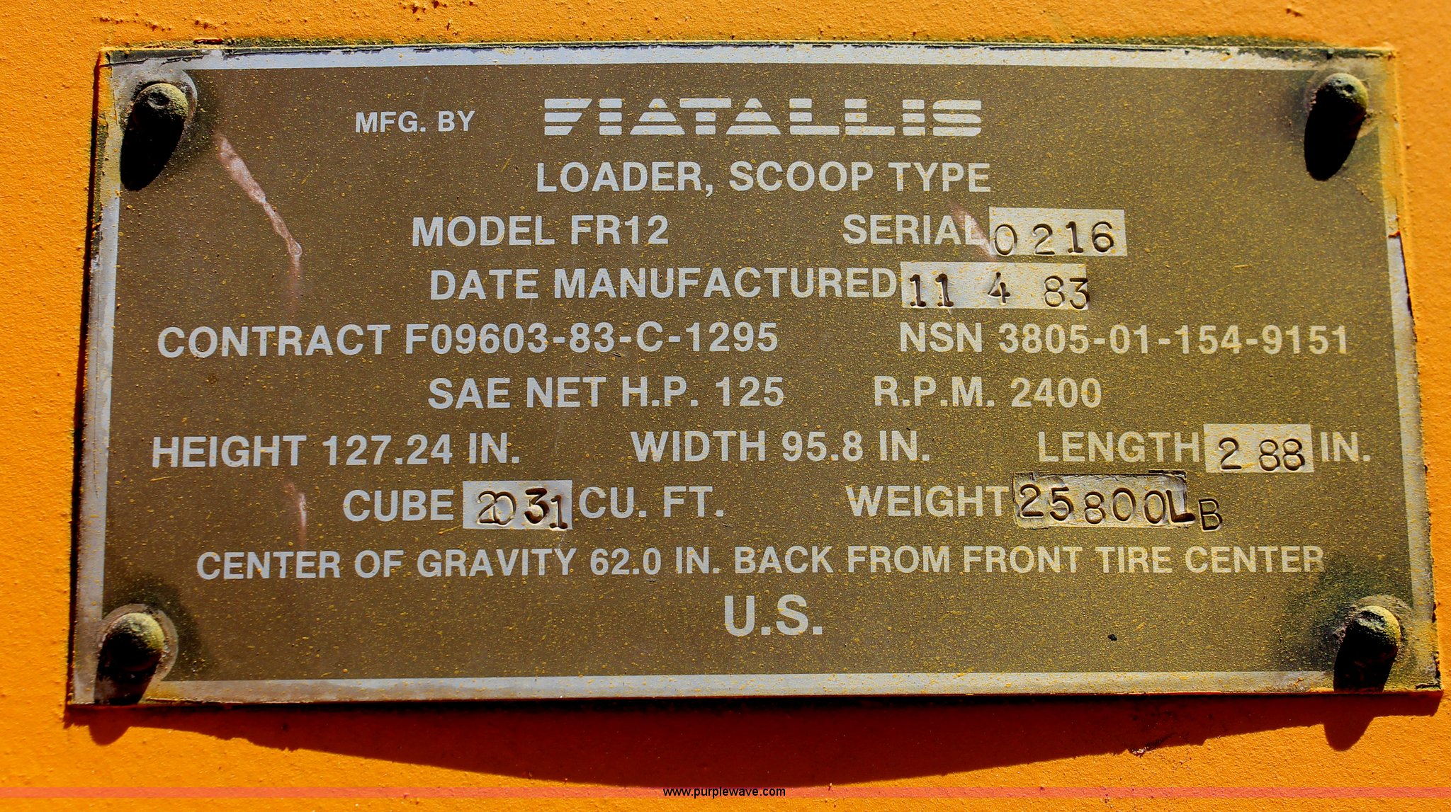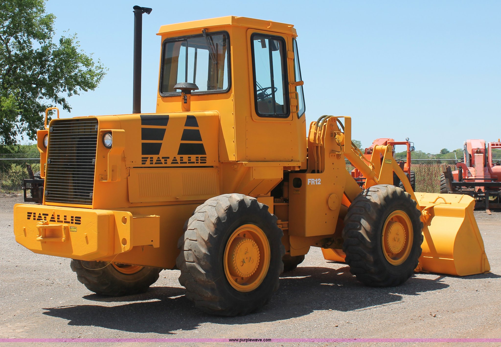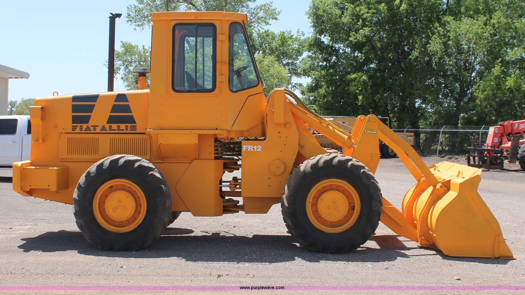 Purple Wave is selling a used Wheel Loader in Oklahoma. This item is a 1984 Fiat-Allis FR12 wheel loader with the following: 4,891 hours on meter, Fiat six cylinder diesel engine, Hi-Lo transmission, EROPS, Fan, Under seat blower, Vinyl seat, Two stick loader control, Front and rear work lights, Front and rear wipers, 96"W bucket, Smooth bolt-on cutting edge, Chain hooks, Rear pin hitch, 112" wheelbase, 17.5-25 tires, Glass cracked, Serial 79M00216