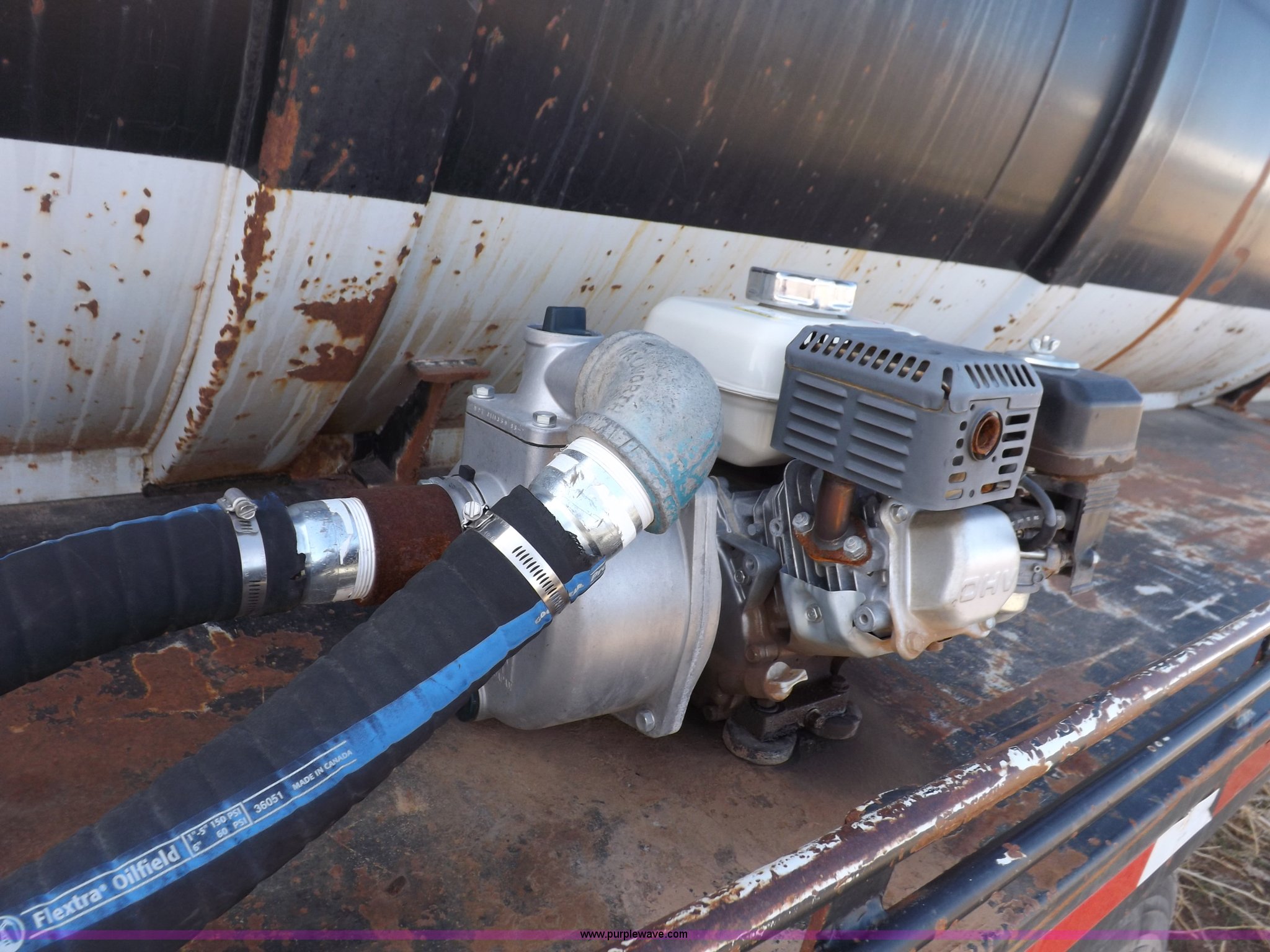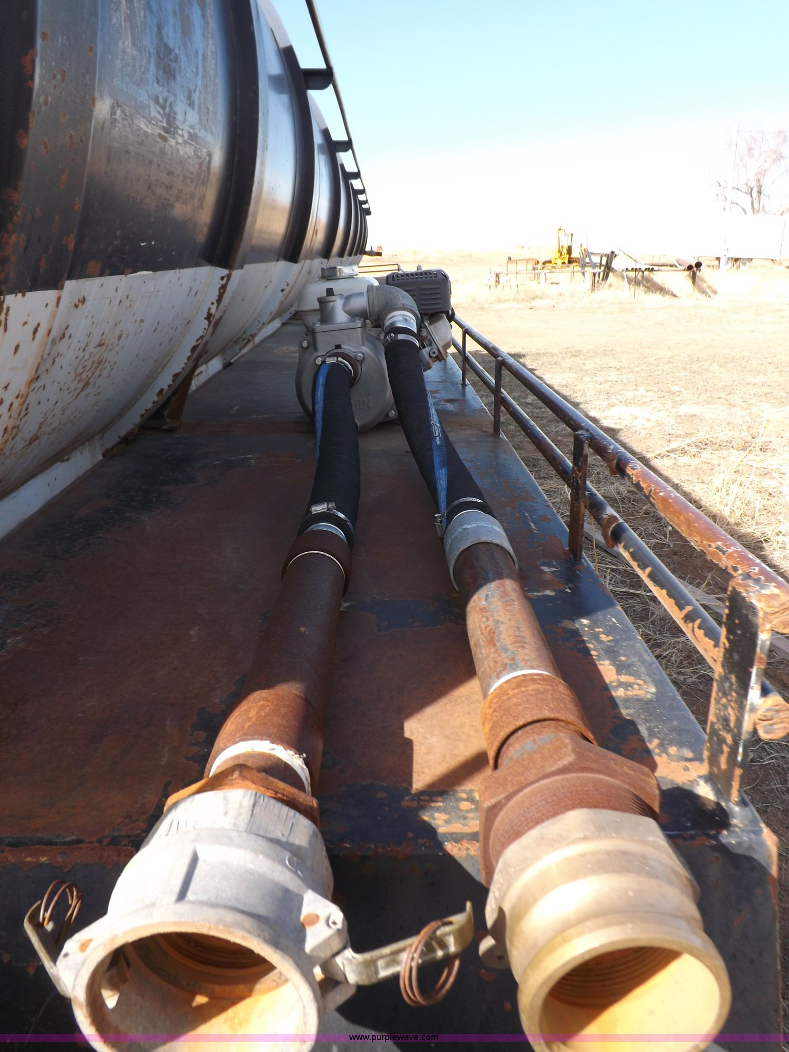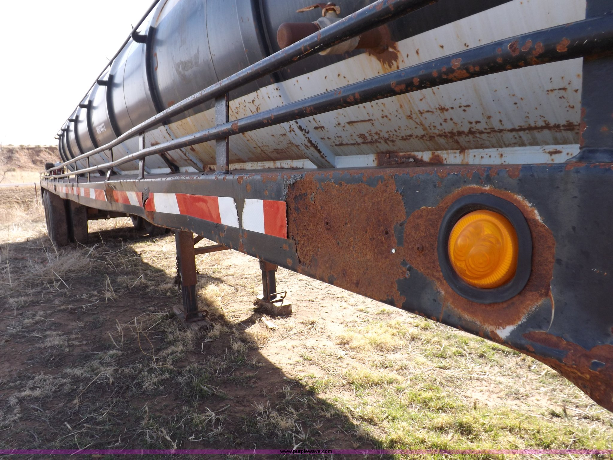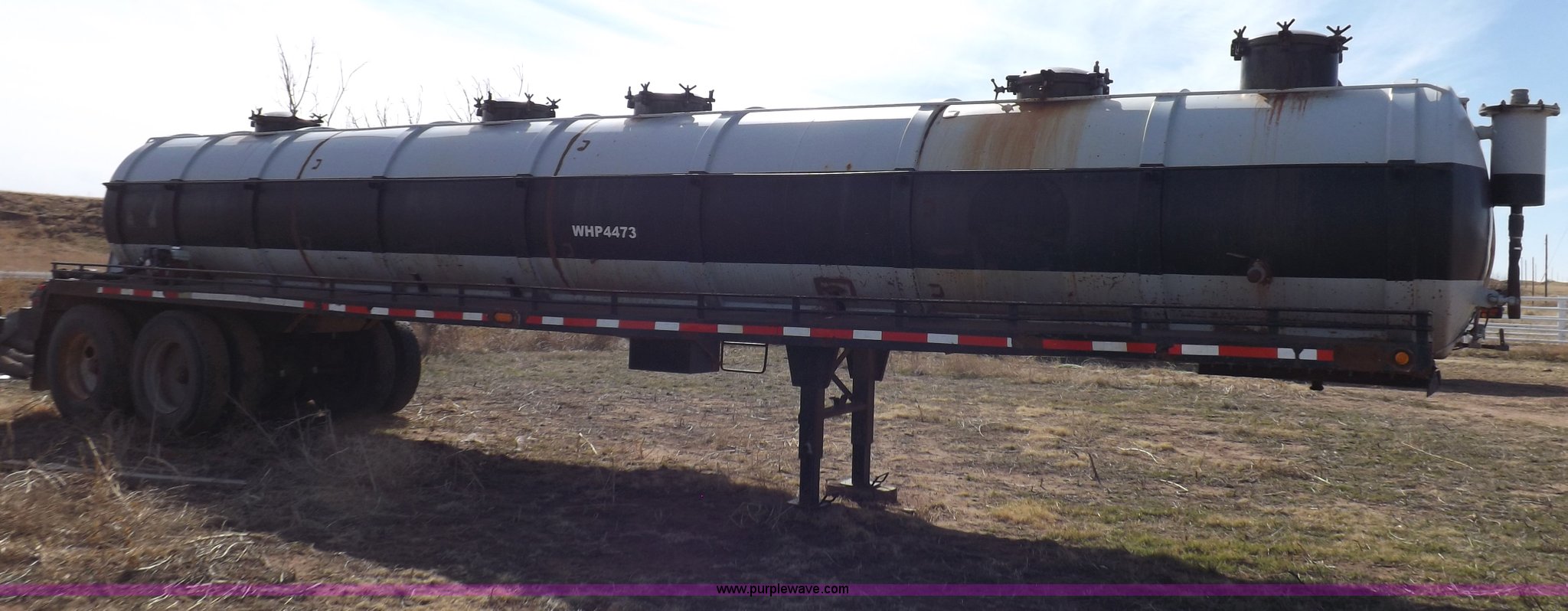 Purple Wave is selling a used Tank Trailer in Oklahoma. This item is a 1981 shop built barrel trailer with the following: 40'L x 8'W x 10'4"H, (5) 21" top man ways, Full length walk ways, Full length fenders, Rear 21" man way, (2) Buterfly valves with outlets, 4" reduced to 3", Rear work lights, Non-operational, Ground cable, Rear tow ring, LED lighting, Koshin centrifugal pump, Honda GX 120 gas engine, Pump plumbed to rear of trailer, Approximately 50'3" vacuum hose, Sight glass, 24"W x 18"D x 18"H storage box, Pin up landing gear, Spring suspension, Air brakes, 11R24.5 tires, Tank leaks, (2) flat tires, Rust