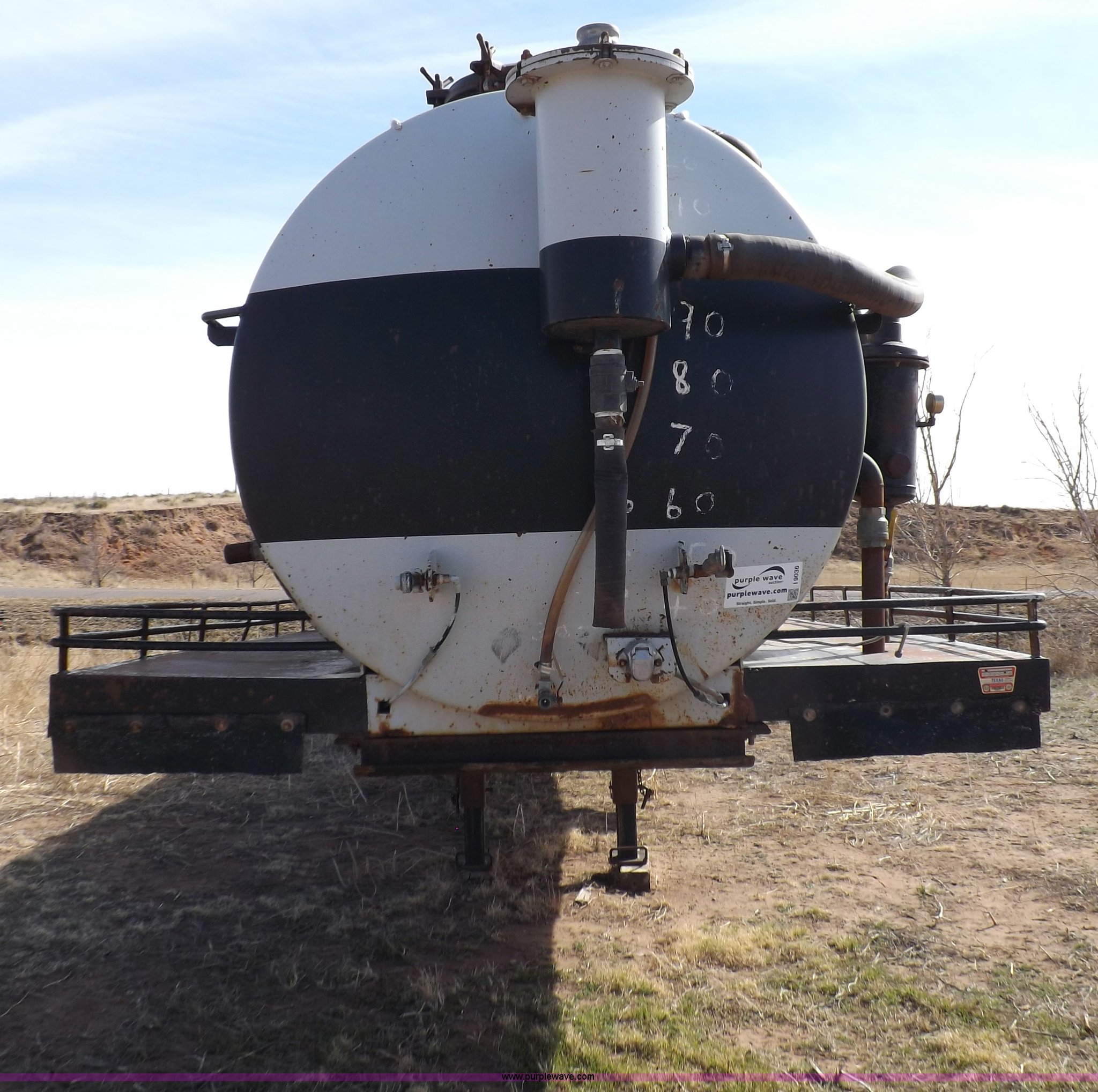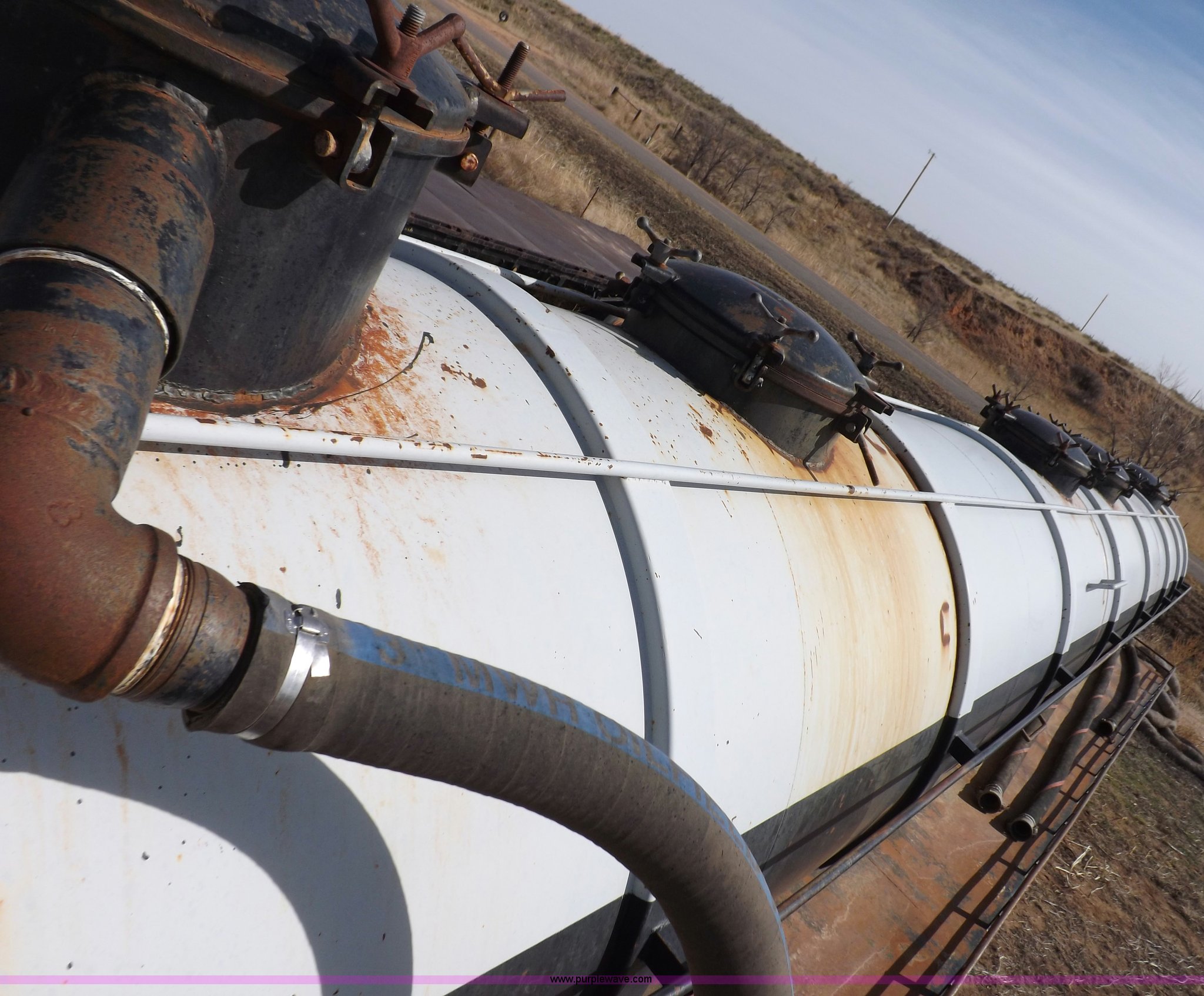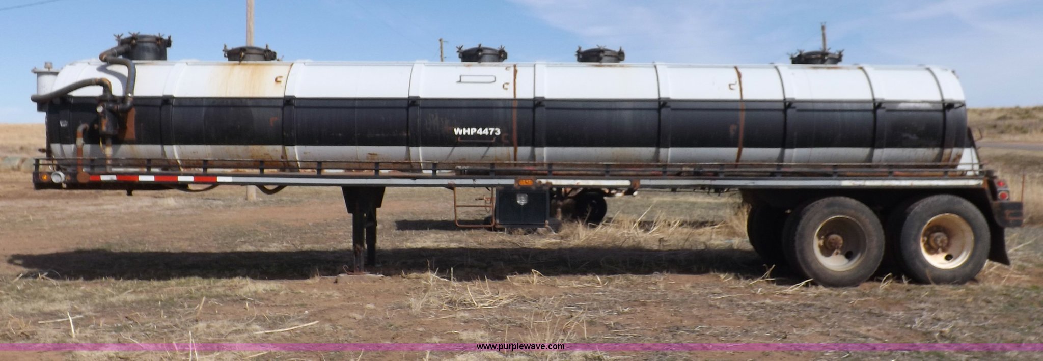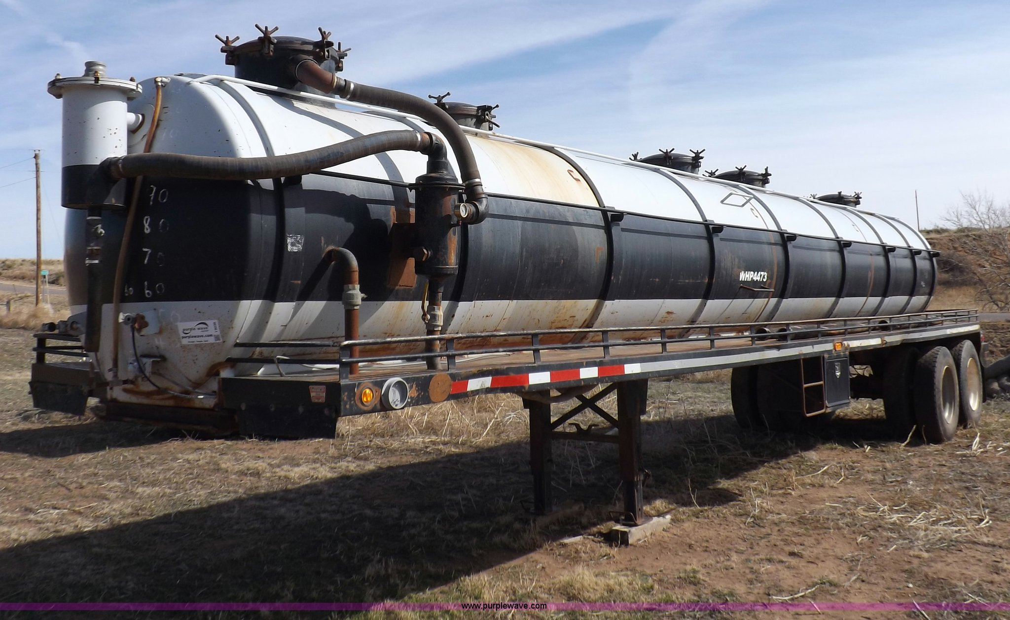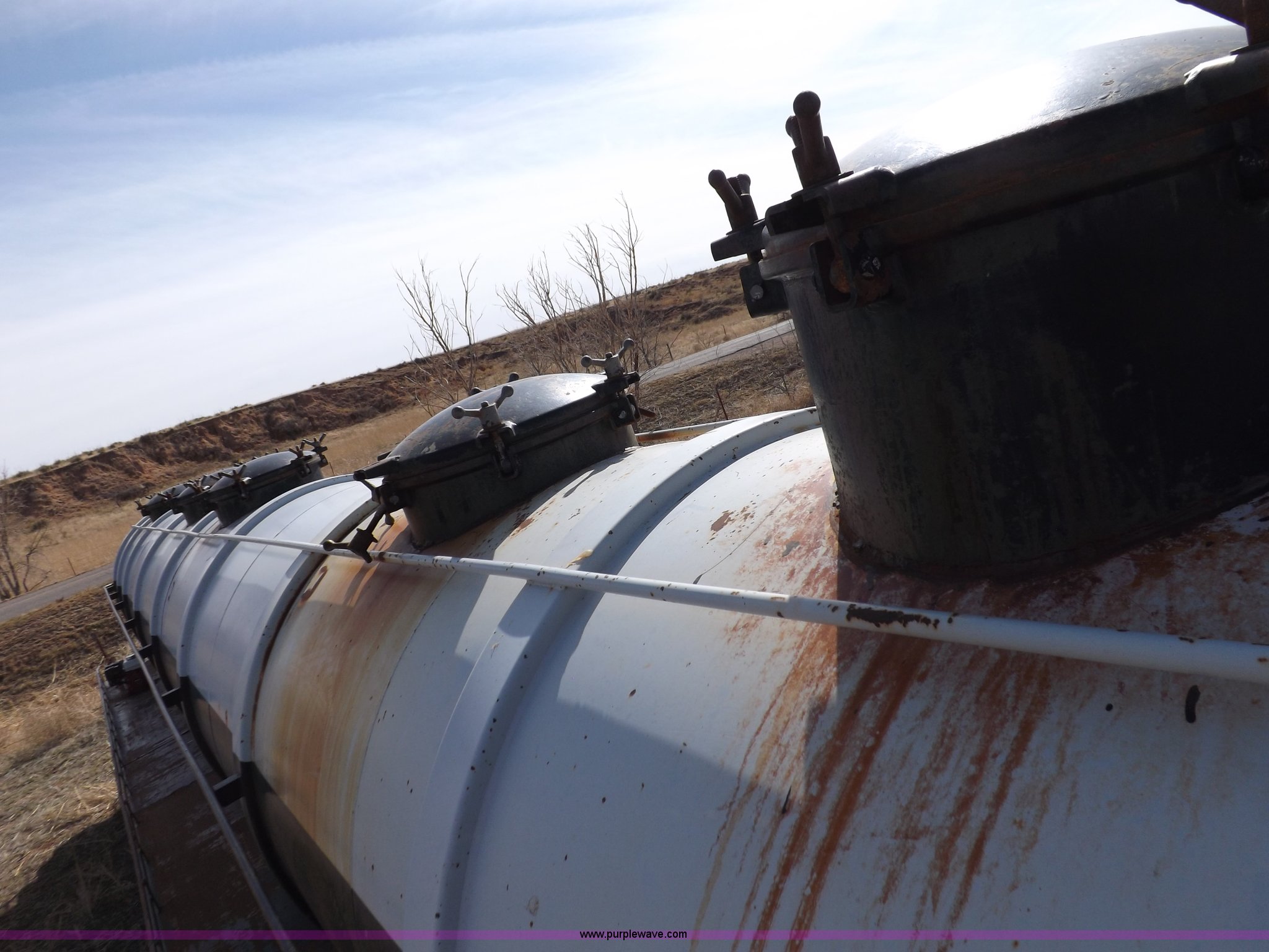 Purple Wave is selling a used Tank Trailer in Oklahoma. This item is a 1981 shop built barrel trailer with the following: 40'L x 8'W x 10'4"H, (5) 21" top man ways, Full length walk ways, Full length fenders, Rear 21" man way, (2) Buterfly valves with outlets, 4" reduced to 3", Rear work lights, Non-operational, Ground cable, Rear tow ring, LED lighting, Koshin centrifugal pump, Honda GX 120 gas engine, Pump plumbed to rear of trailer, Approximately 50'3" vacuum hose, Sight glass, 24"W x 18"D x 18"H storage box, Pin up landing gear, Spring suspension, Air brakes, 11R24.5 tires, Tank leaks, (2) flat tires, Rust
