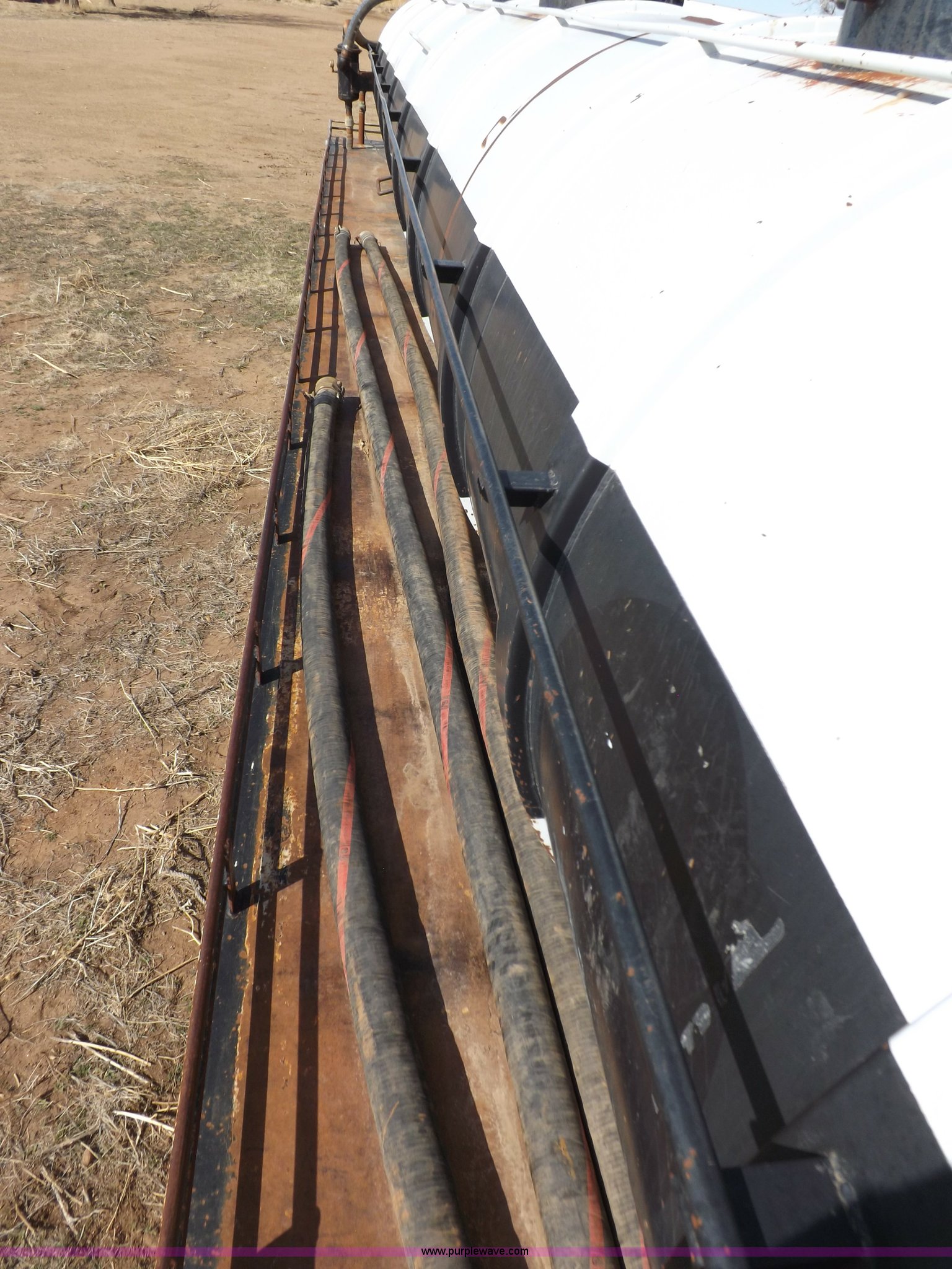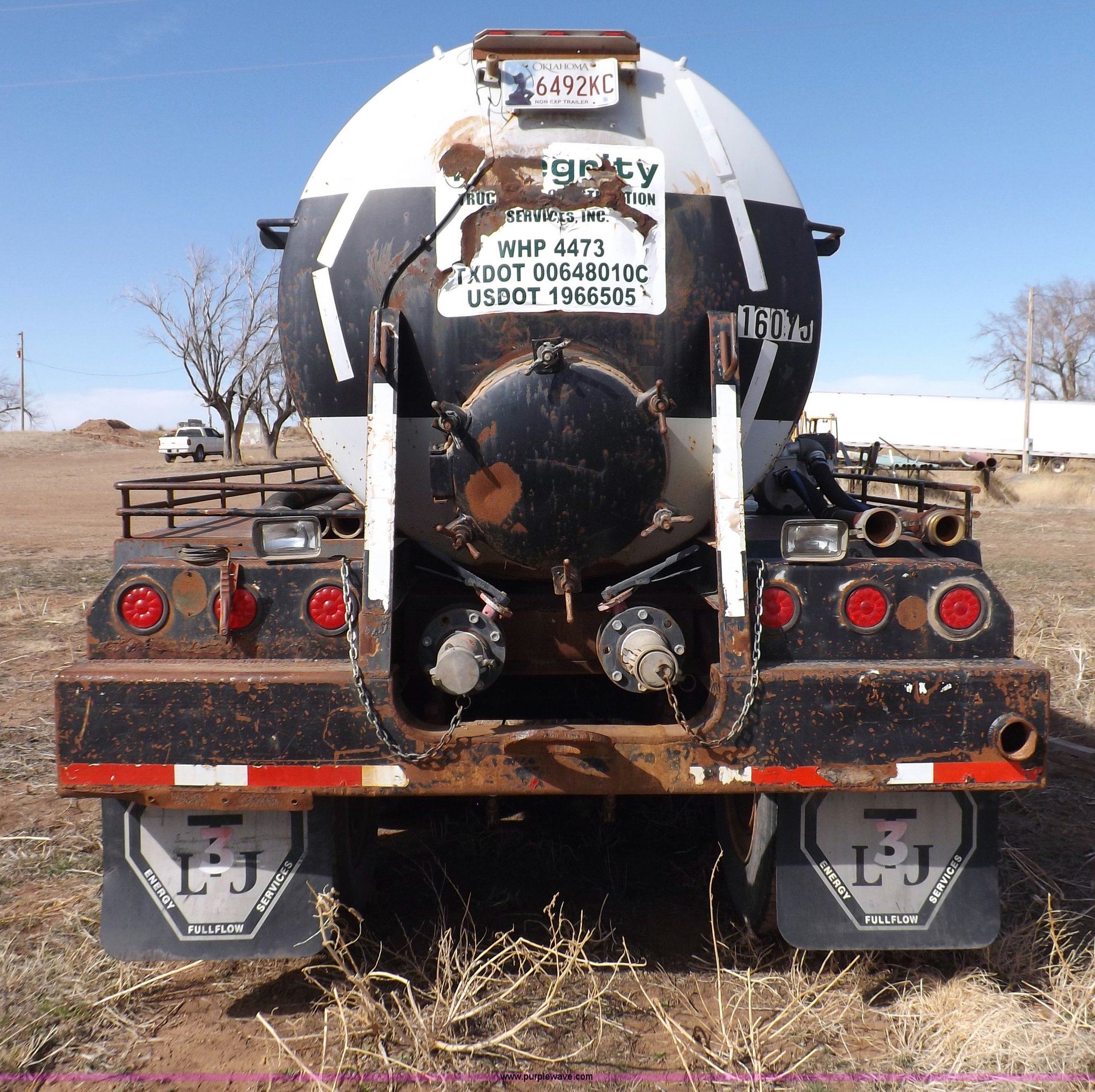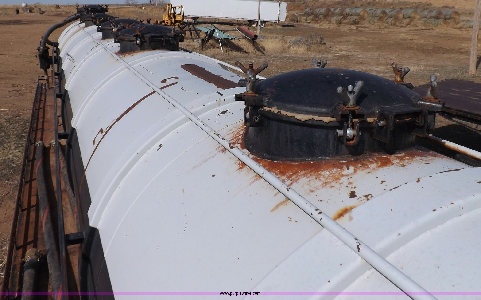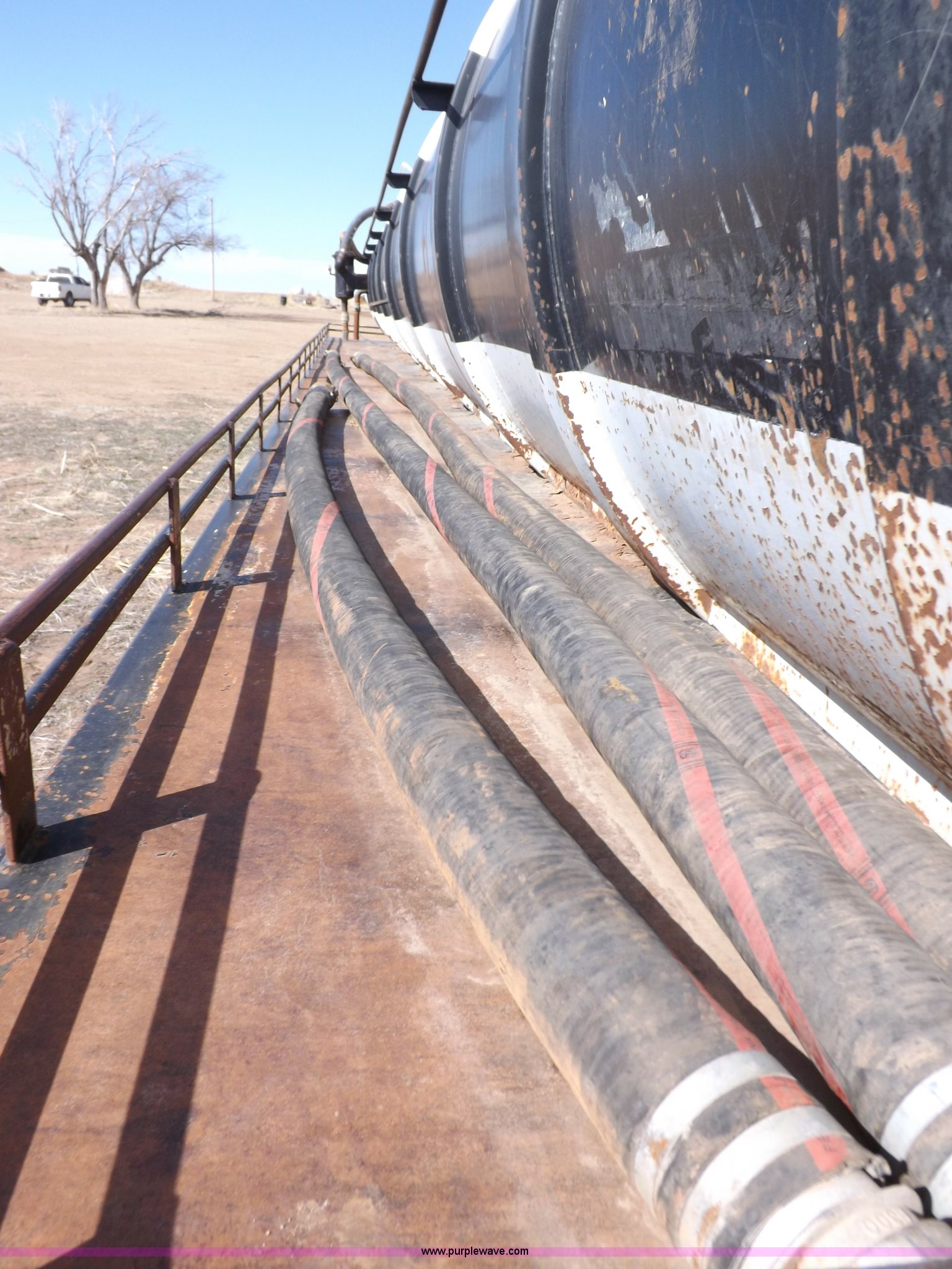 Purple Wave is selling a used Tank Trailer in Oklahoma. This item is a 1981 shop built barrel trailer with the following: 40'L x 8'W x 10'4"H, (5) 21" top man ways, Full length walk ways, Full length fenders, Rear 21" man way, (2) Buterfly valves with outlets, 4" reduced to 3", Rear work lights, Non-operational, Ground cable, Rear tow ring, LED lighting, Koshin centrifugal pump, Honda GX 120 gas engine, Pump plumbed to rear of trailer, Approximately 50'3" vacuum hose, Sight glass, 24"W x 18"D x 18"H storage box, Pin up landing gear, Spring suspension, Air brakes, 11R24.5 tires, Tank leaks, (2) flat tires, Rust