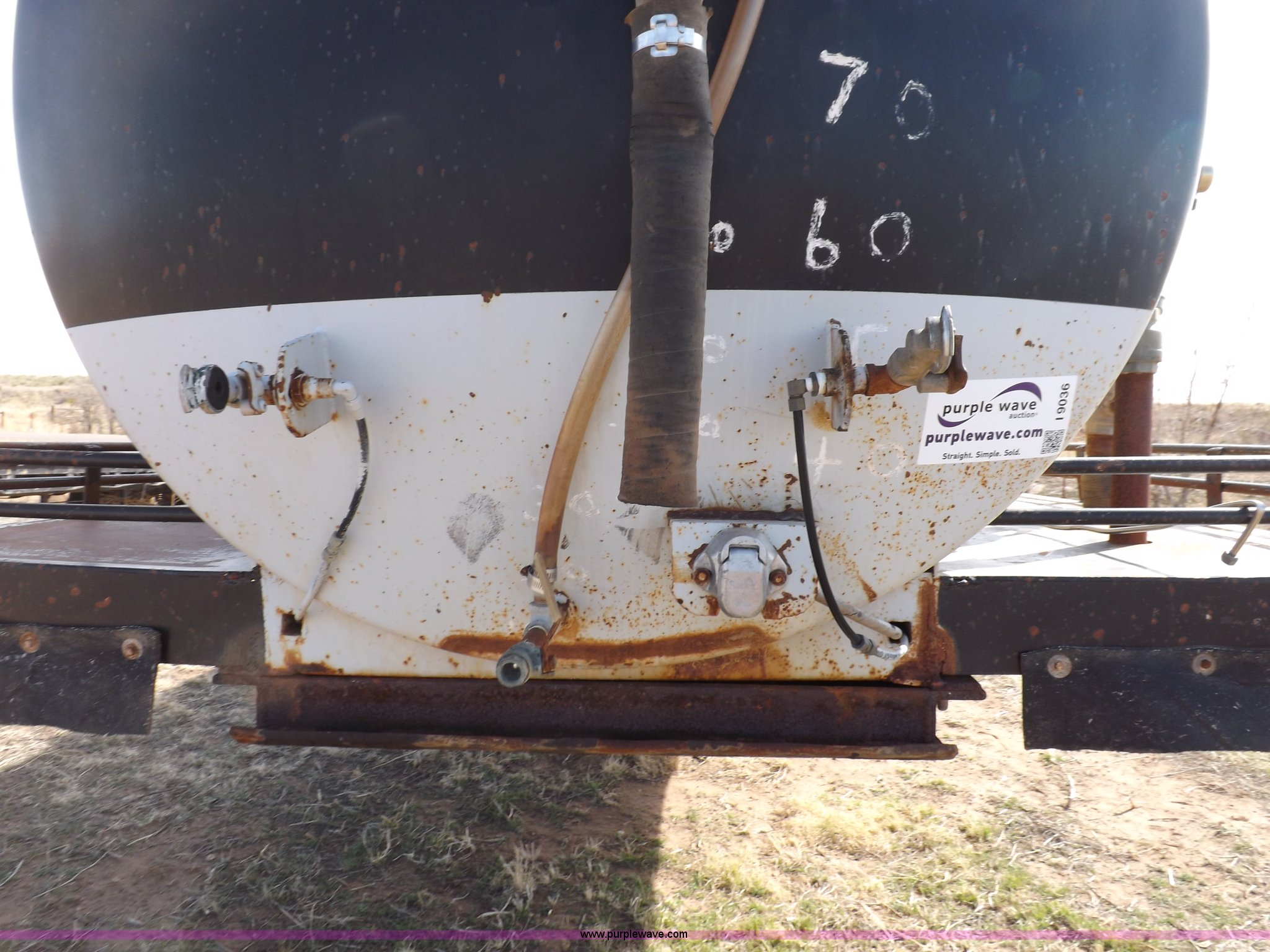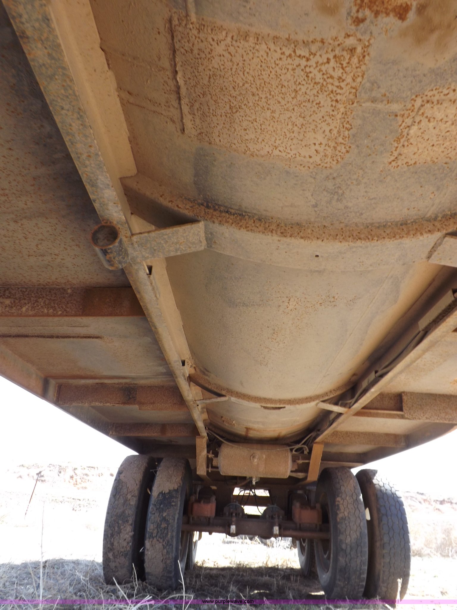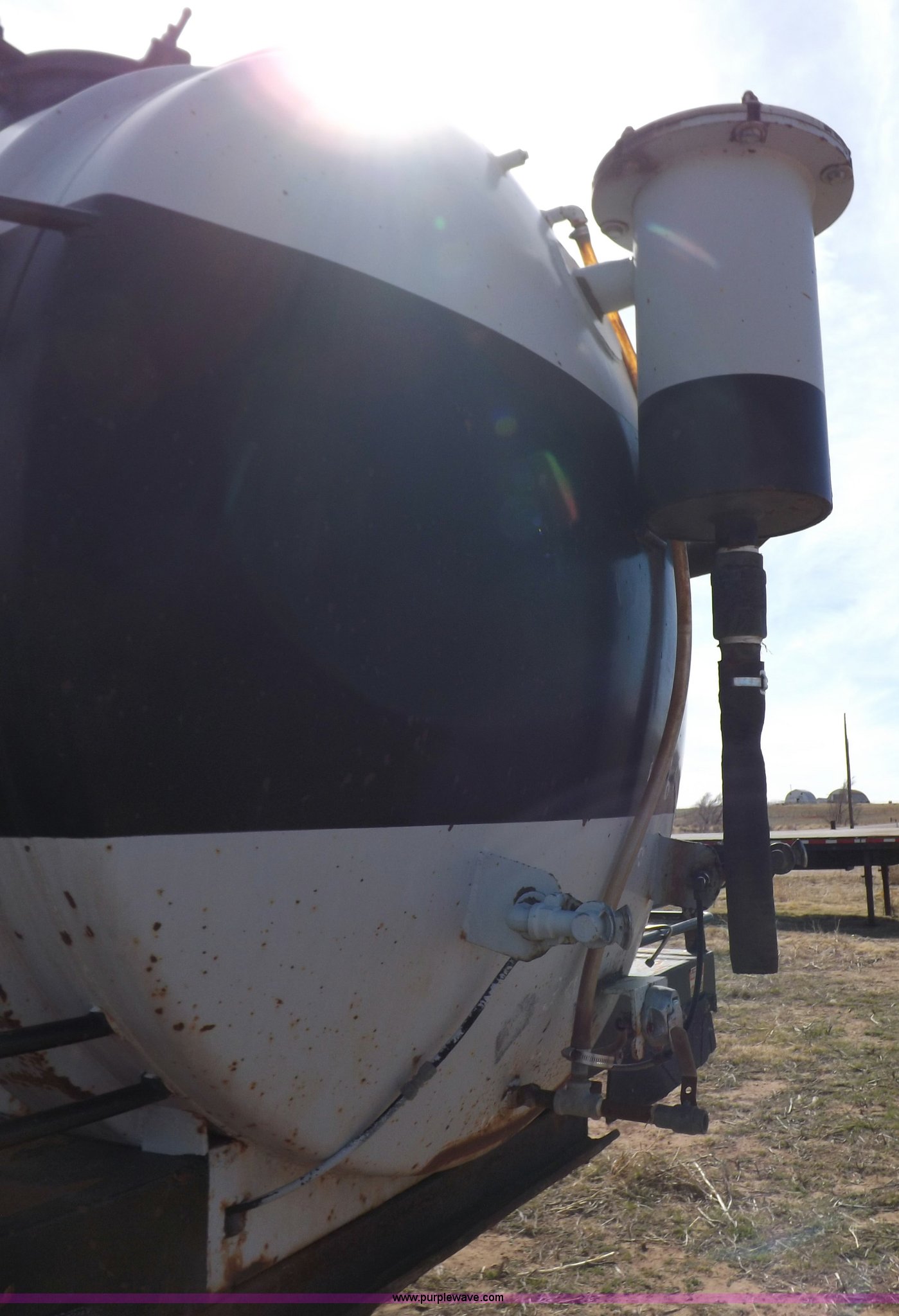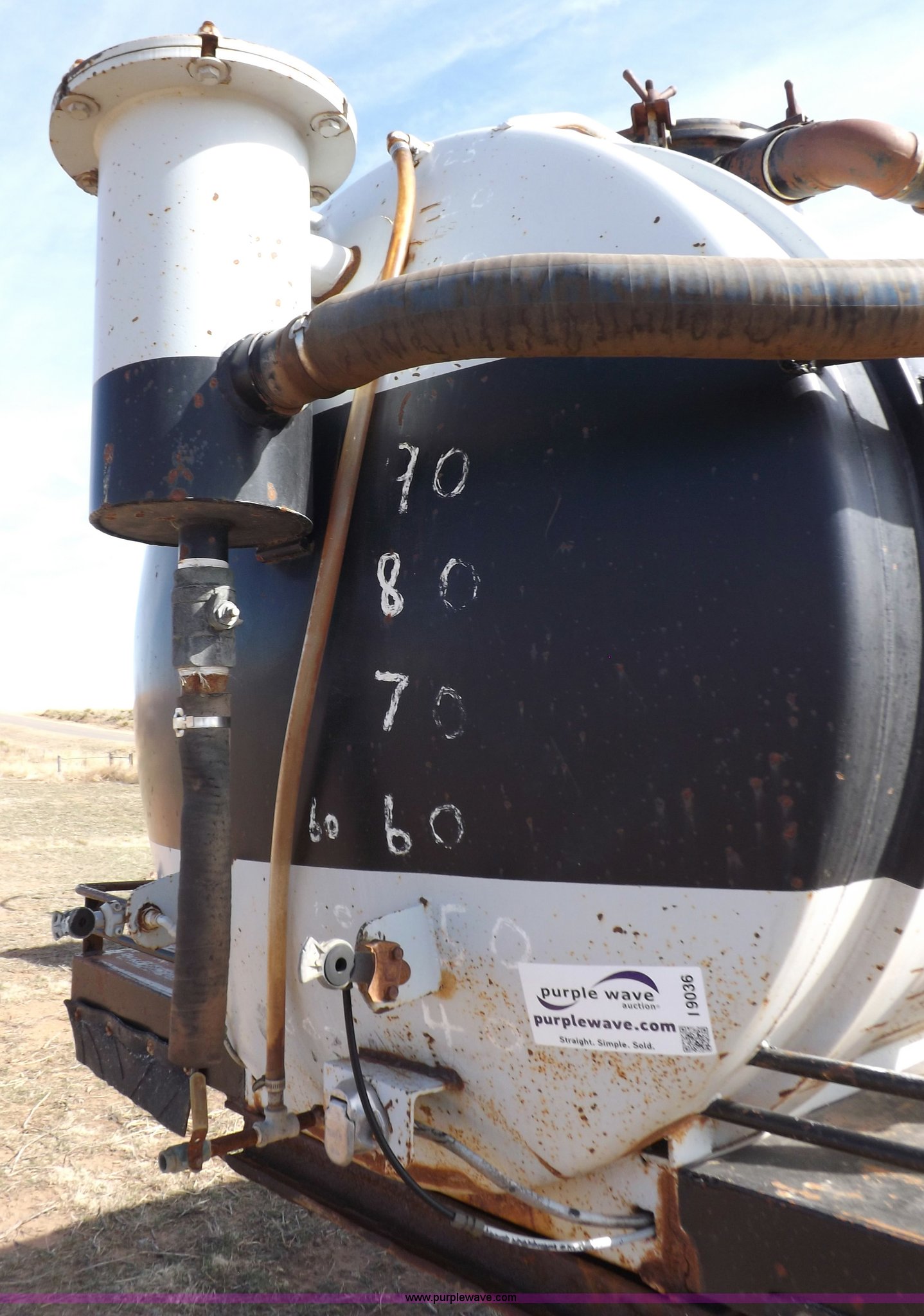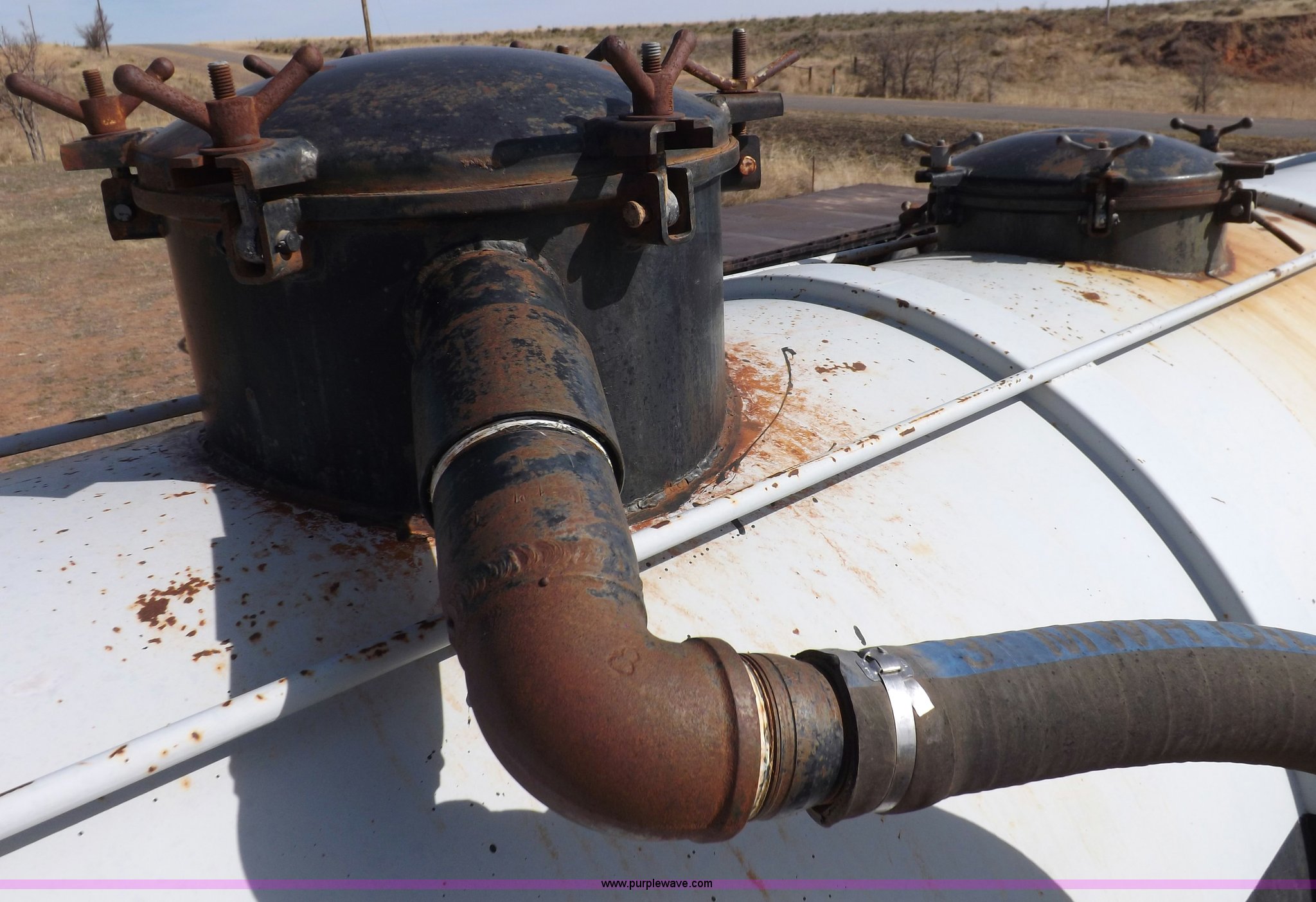 Purple Wave is selling a used Tank Trailer in Oklahoma. This item is a 1981 shop built barrel trailer with the following: 40'L x 8'W x 10'4"H, (5) 21" top man ways, Full length walk ways, Full length fenders, Rear 21" man way, (2) Buterfly valves with outlets, 4" reduced to 3", Rear work lights, Non-operational, Ground cable, Rear tow ring, LED lighting, Koshin centrifugal pump, Honda GX 120 gas engine, Pump plumbed to rear of trailer, Approximately 50'3" vacuum hose, Sight glass, 24"W x 18"D x 18"H storage box, Pin up landing gear, Spring suspension, Air brakes, 11R24.5 tires, Tank leaks, (2) flat tires, Rust