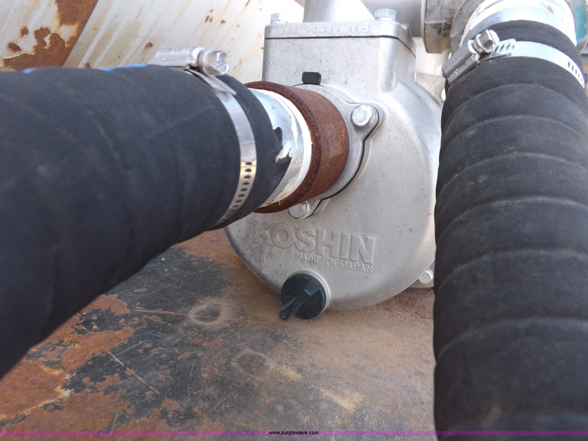 1981 shop built barrel trailer. 40'L x 8'W x 10'4"H, (5) 21" top man ways, Full length walk ways, Full length fenders, Rear 21" man way, (2) Buterfly valves with outlets 4" reduced to 3", Rear work lights Non-operational, Ground cable, Rear tow ring, LED lighting, Koshin centrifugal pump Honda GX 120 gas engine, Pump plumbed to rear of trailer, Approximately 50'3" vacuum hose, Sight glass, 24"W x 18"D x 18"H storage box, Pin up landing gear, Spring suspension, Air brakes, 11R24.5 tires, Tank leaks, (2) flat tires, Rust. Title distribution may be delayed up to 14 days from verification of funds. TR146923. Cobalt Construction Inc.. NS129.5 EW 15. Beaver, OK 73932