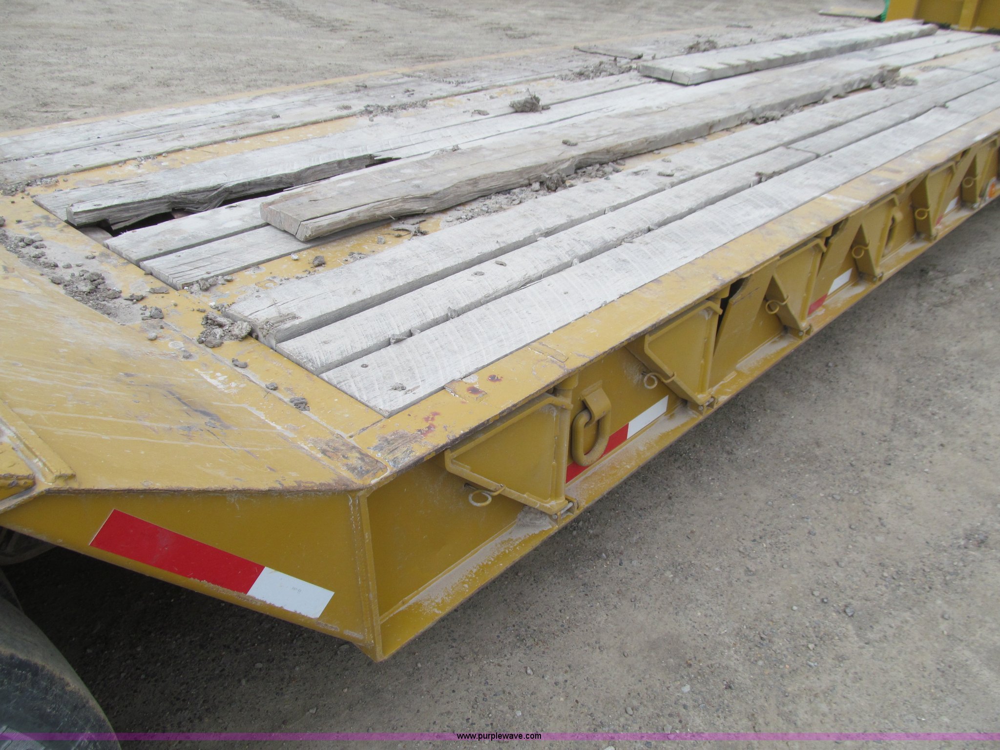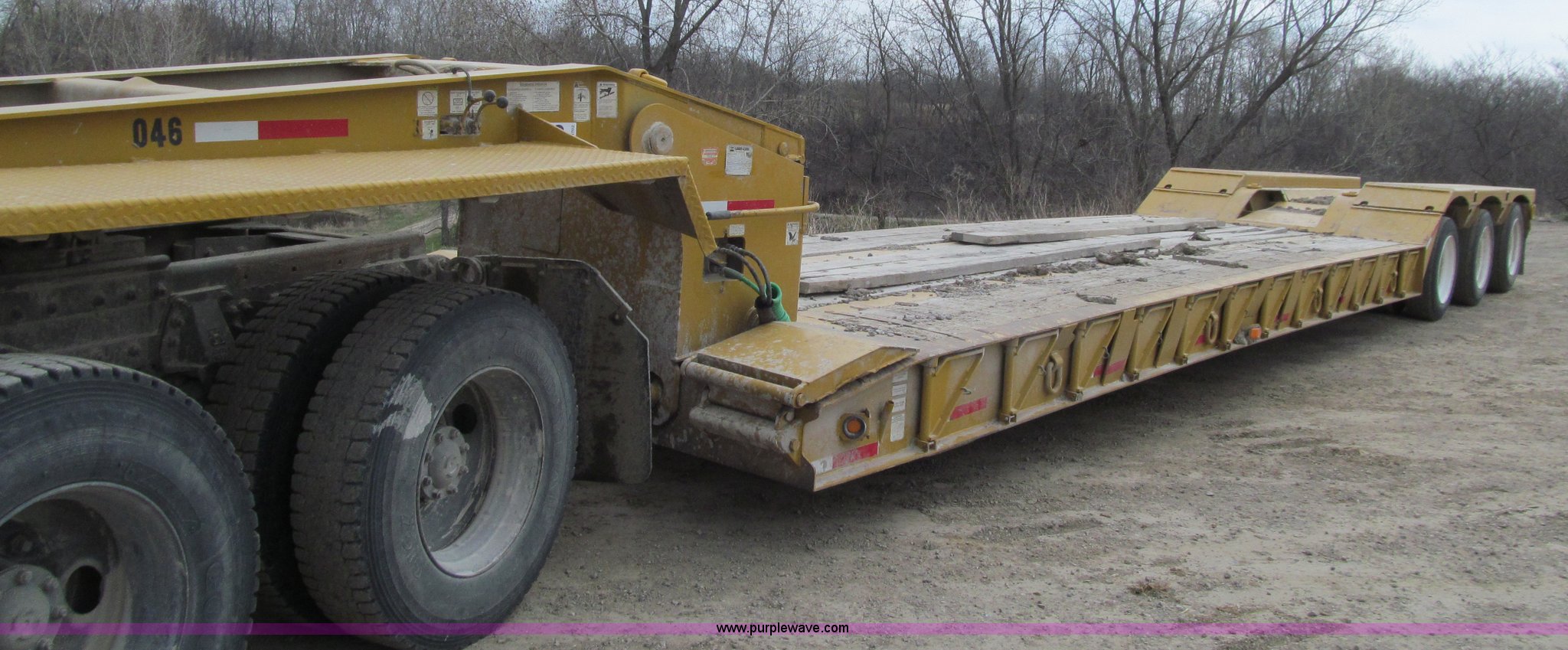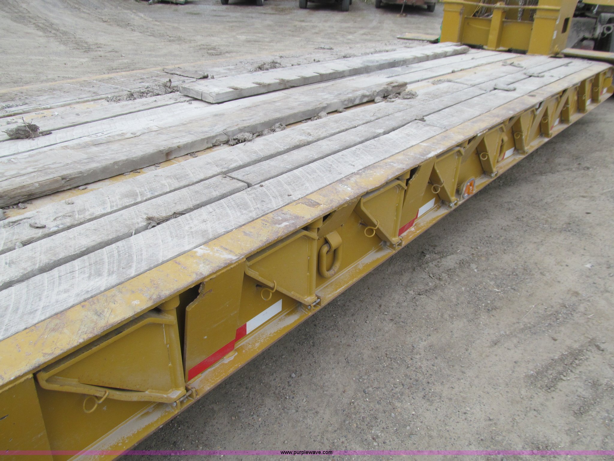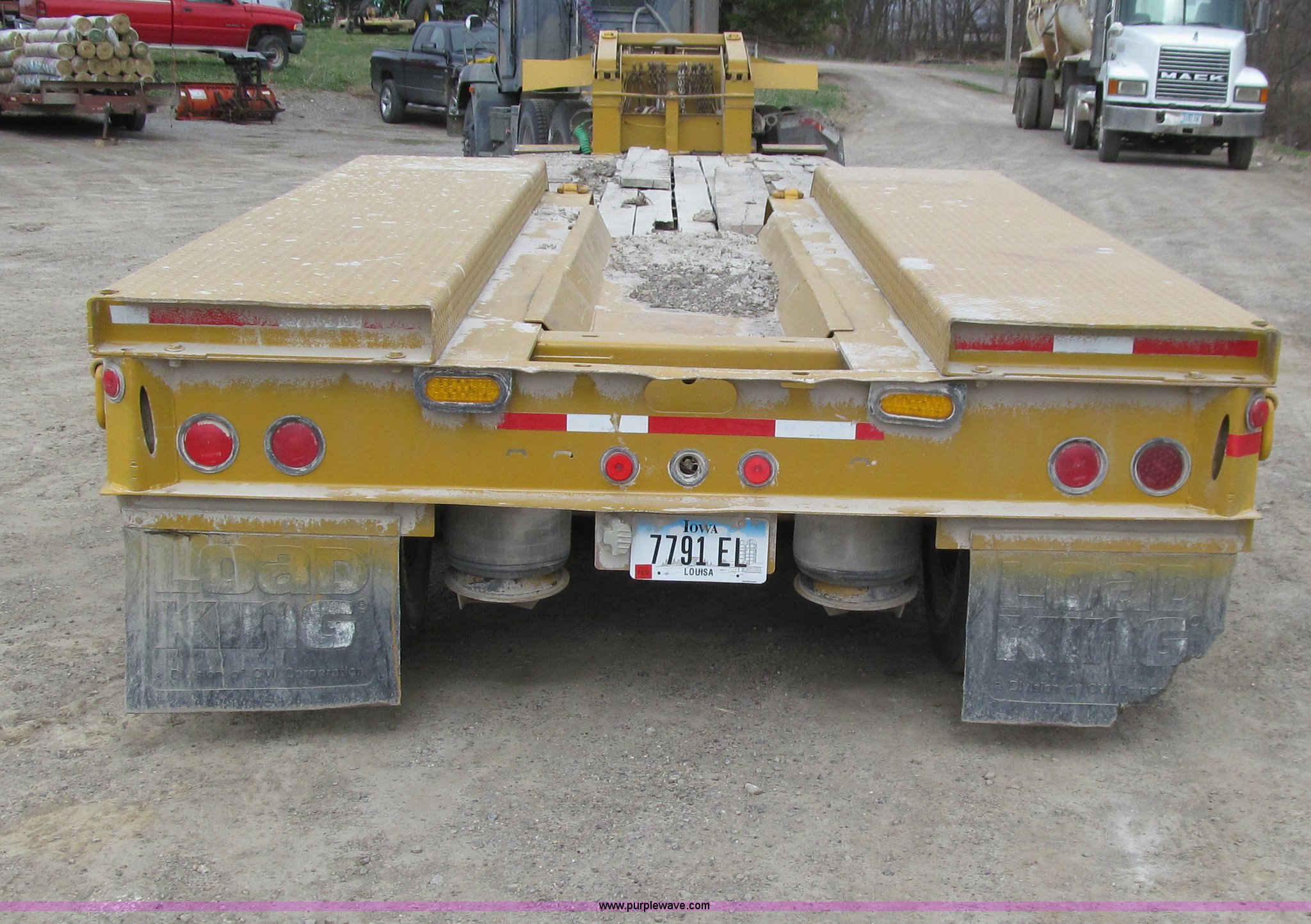 Purple Wave is selling a used Equip. Trailer in Iowa. This item is a 2005 Load King 553SS triple axle lowboy trailer with the following: 23.5'L x 102"W clear deck, Wood deck inserts, Rear bucket pocket, Front loading ramps, (12) swing away outrigger brackets per side, (4) lashing rings at back of clear deck, (2) lashing rings at back of clear deck, Hydraulic removable gooseneck, Non-ground engaging, Front diamond tread steel fenders, Full length removable steel fender over rear triple axle assembly, Air suspension, 225/70R22.5 tires, 16 ply, GVWR 130,060 lbs, GAWR 20,280 lbs