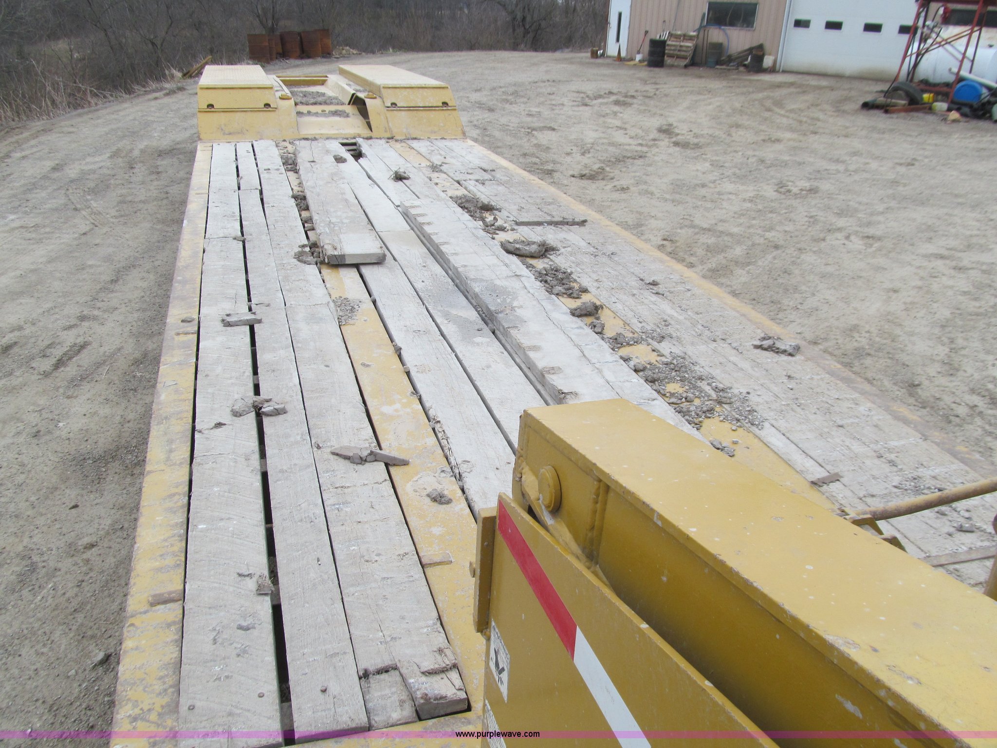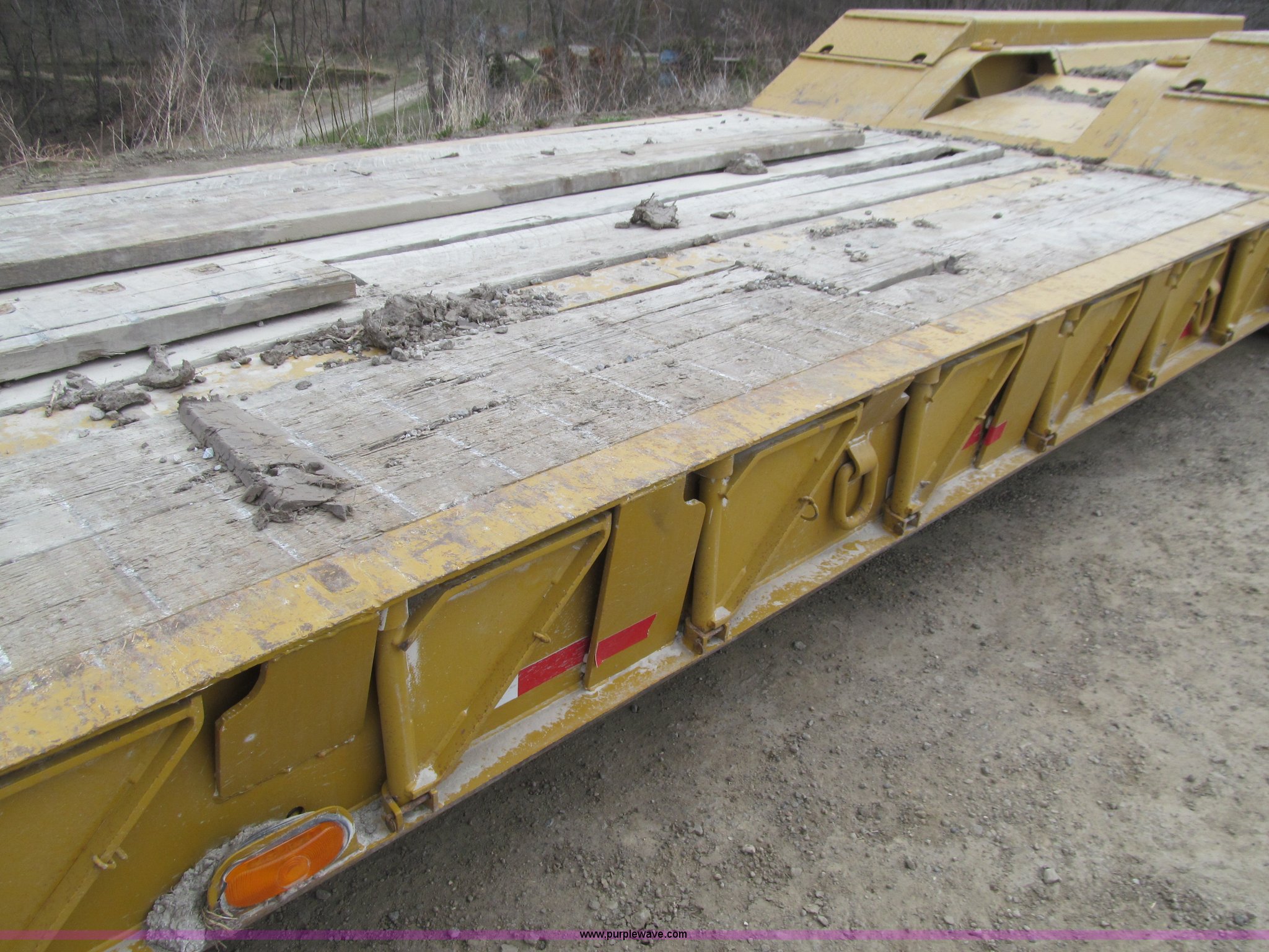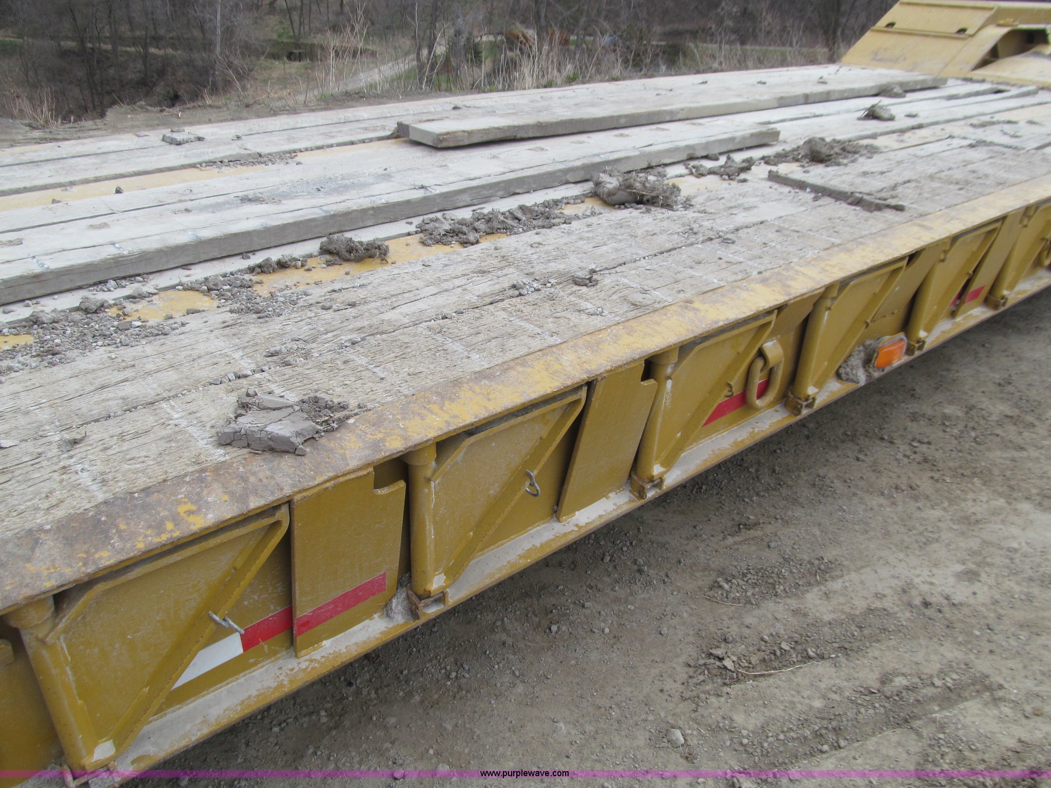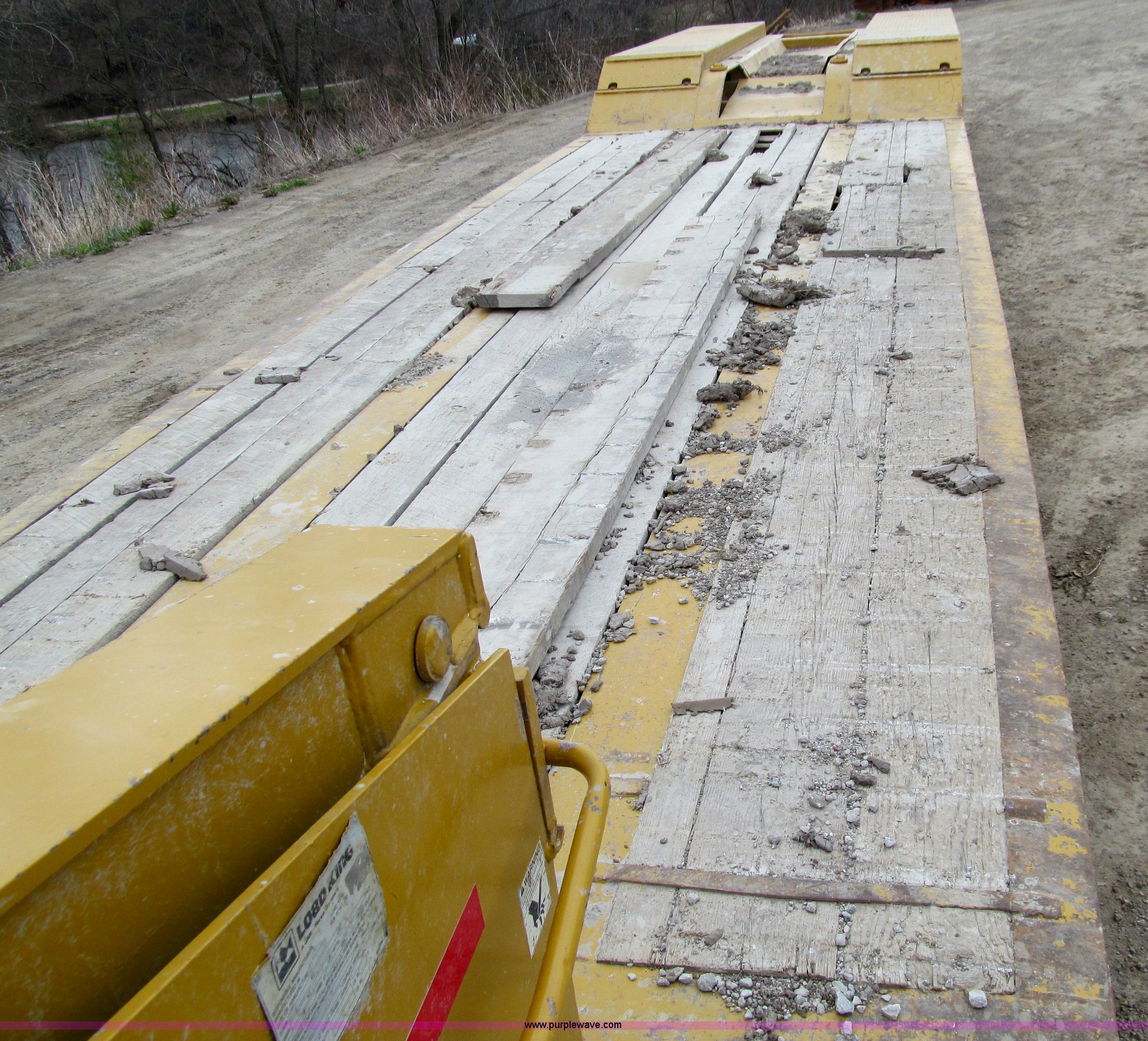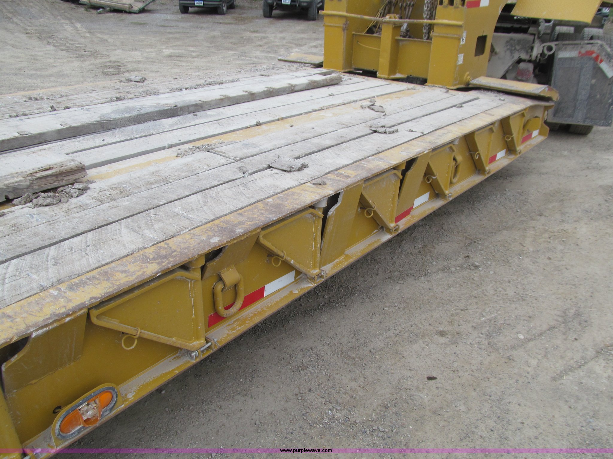 Purple Wave is selling a used Equip. Trailer in Iowa. This item is a 2005 Load King 553SS triple axle lowboy trailer with the following: 23.5'L x 102"W clear deck, Wood deck inserts, Rear bucket pocket, Front loading ramps, (12) swing away outrigger brackets per side, (4) lashing rings at back of clear deck, (2) lashing rings at back of clear deck, Hydraulic removable gooseneck, Non-ground engaging, Front diamond tread steel fenders, Full length removable steel fender over rear triple axle assembly, Air suspension, 225/70R22.5 tires, 16 ply, GVWR 130,060 lbs, GAWR 20,280 lbs