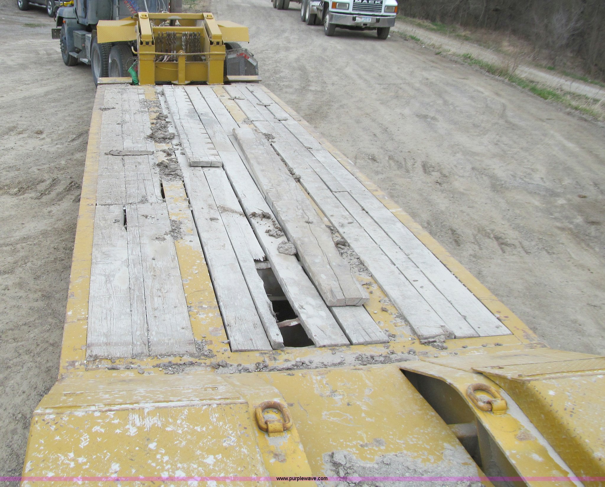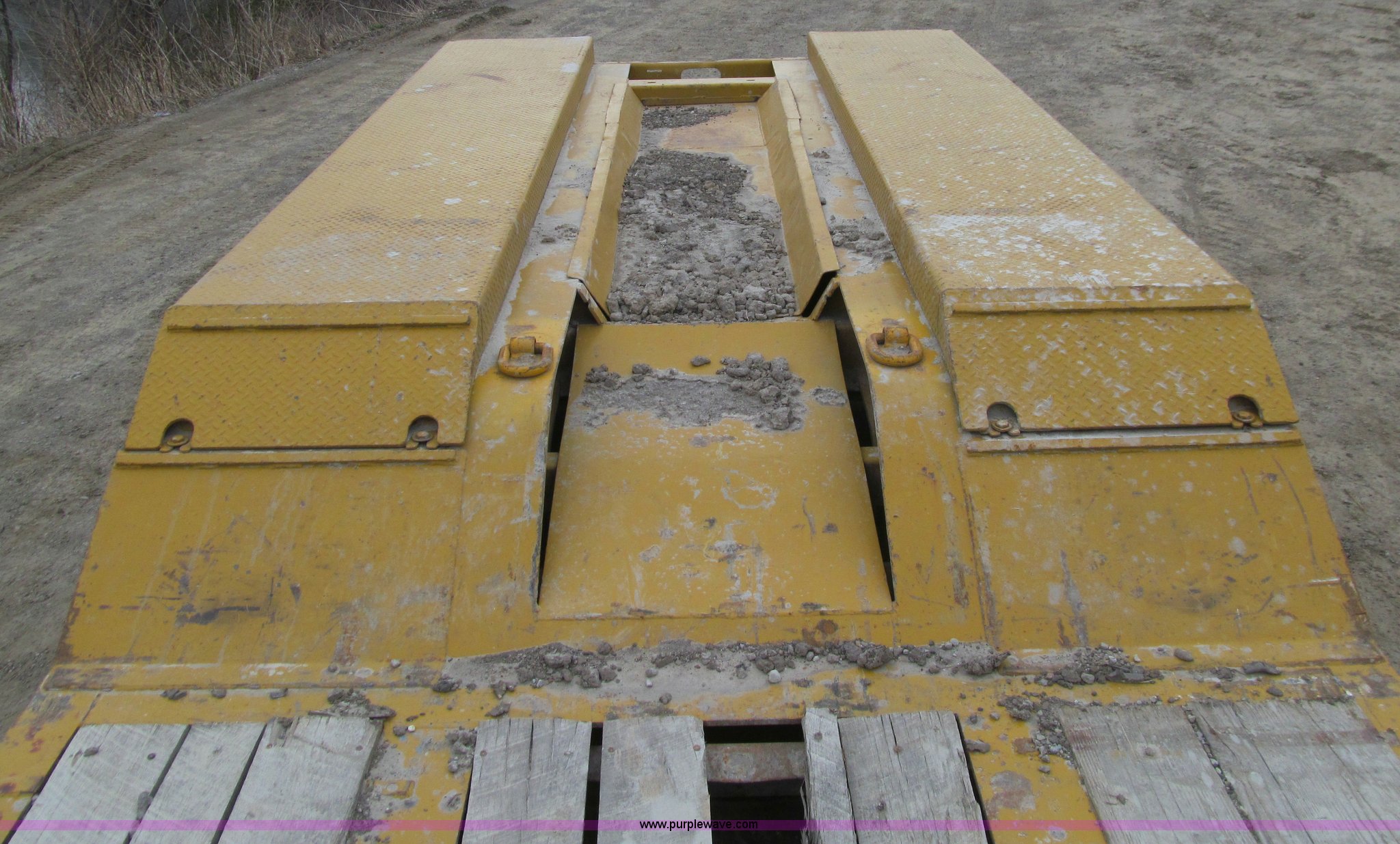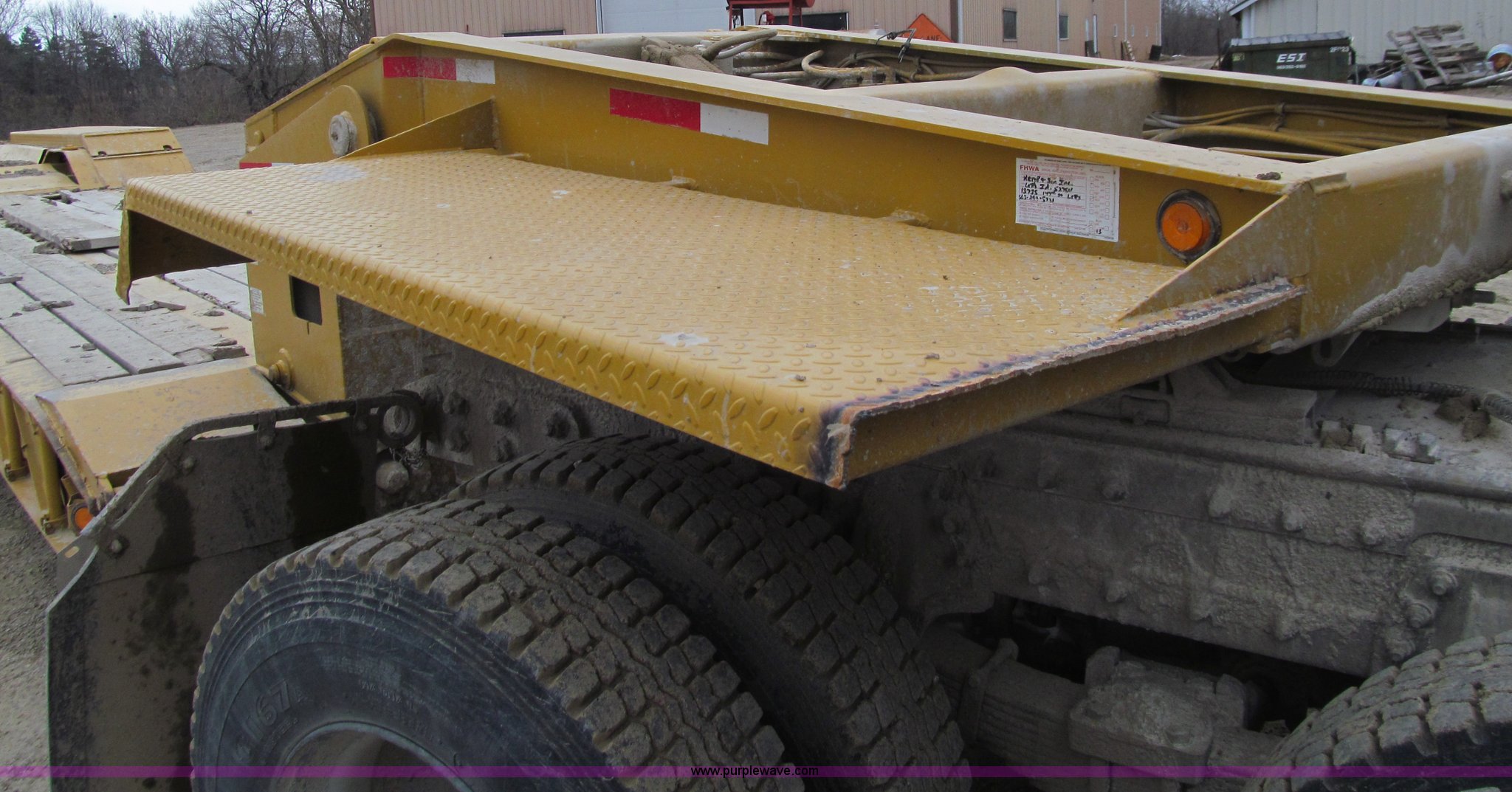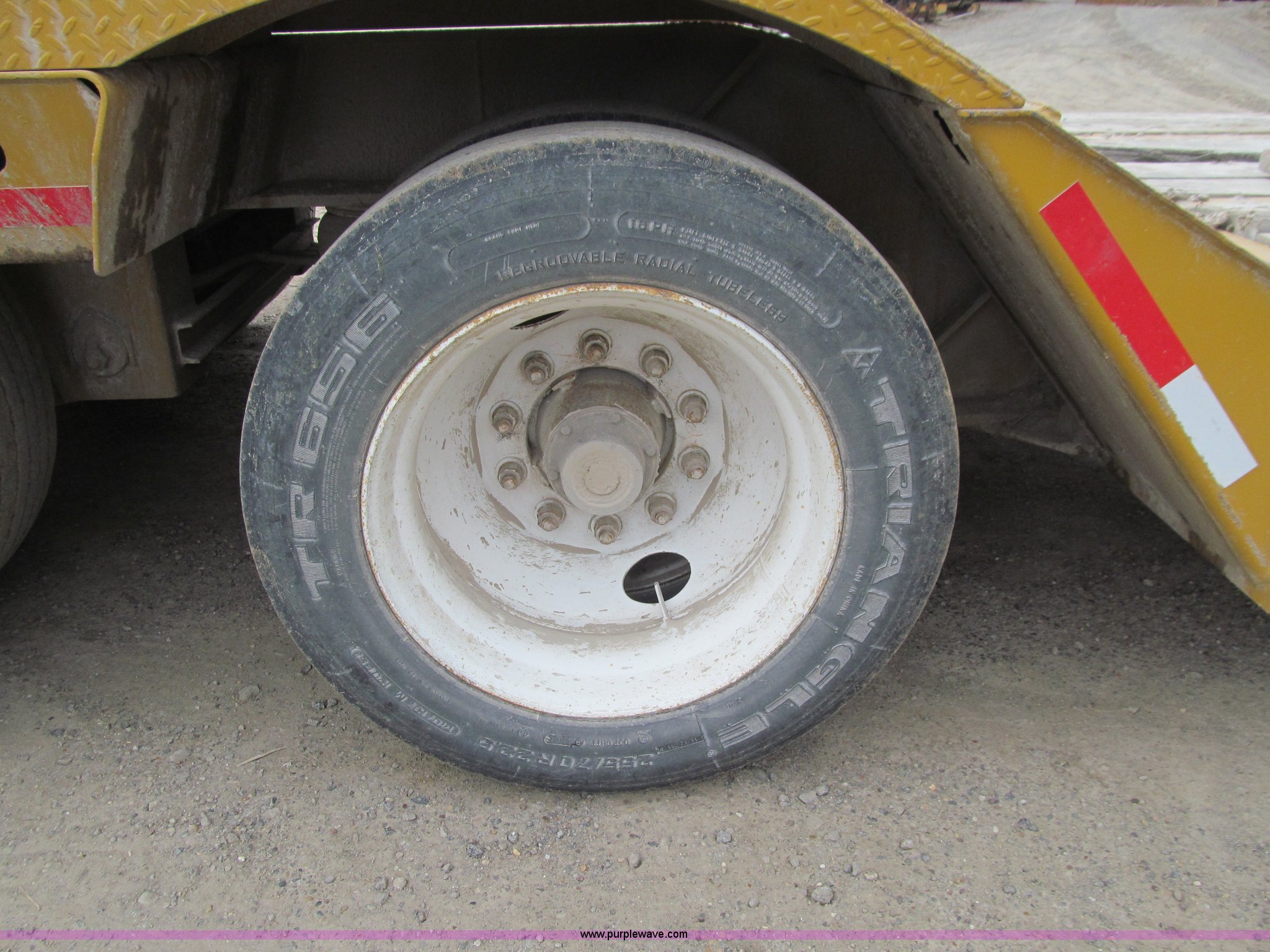 Purple Wave is selling a used Equip. Trailer in Iowa. This item is a 2005 Load King 553SS triple axle lowboy trailer with the following: 23.5'L x 102"W clear deck, Wood deck inserts, Rear bucket pocket, Front loading ramps, (12) swing away outrigger brackets per side, (4) lashing rings at back of clear deck, (2) lashing rings at back of clear deck, Hydraulic removable gooseneck, Non-ground engaging, Front diamond tread steel fenders, Full length removable steel fender over rear triple axle assembly, Air suspension, 225/70R22.5 tires, 16 ply, GVWR 130,060 lbs, GAWR 20,280 lbs