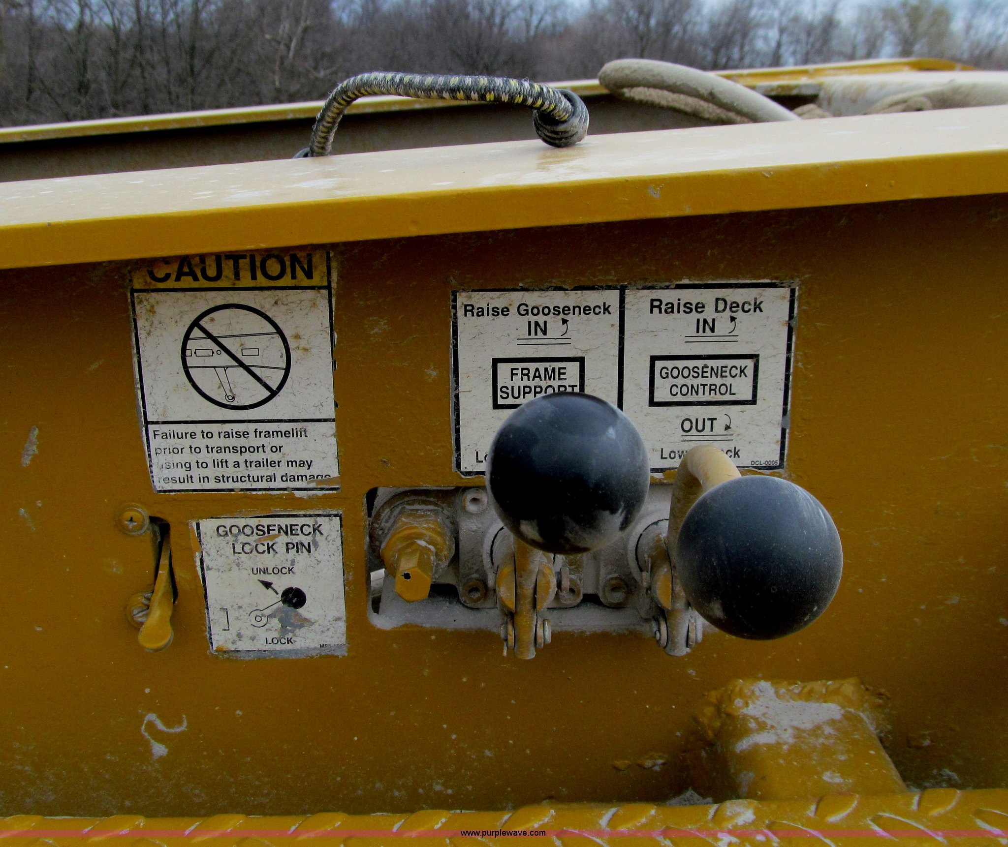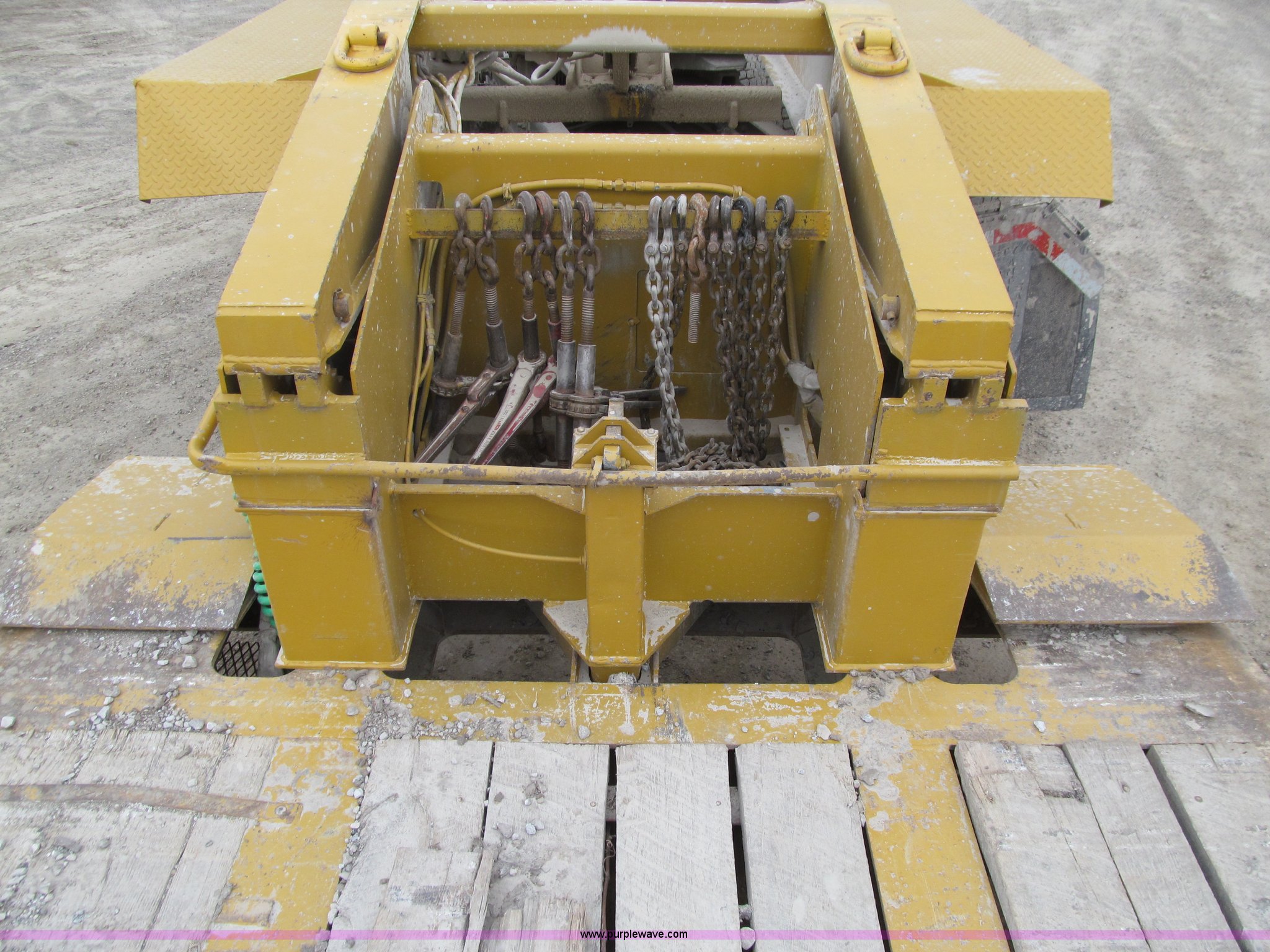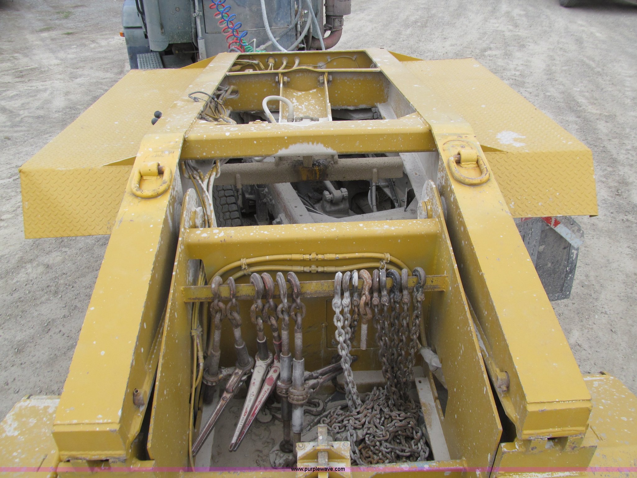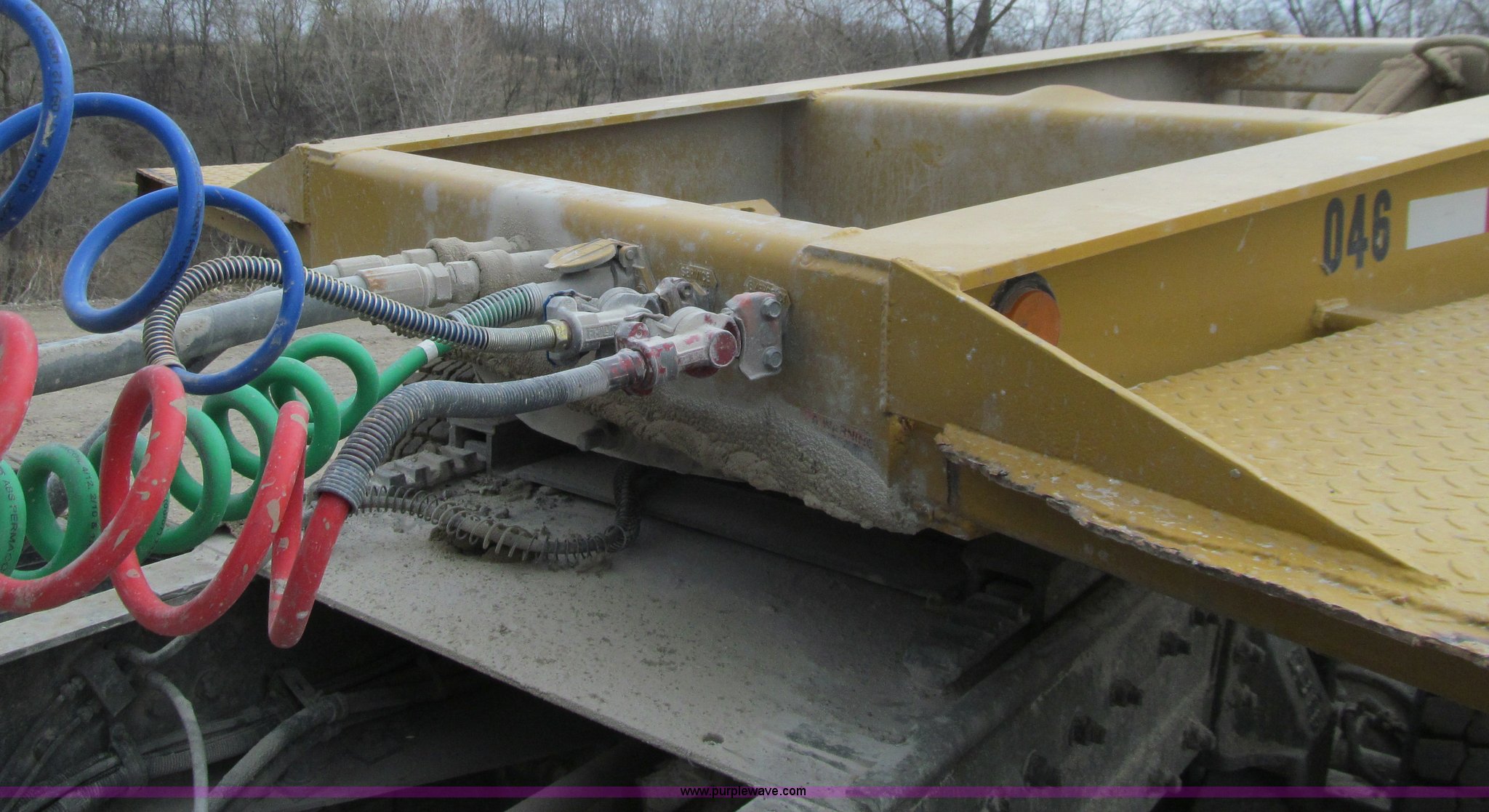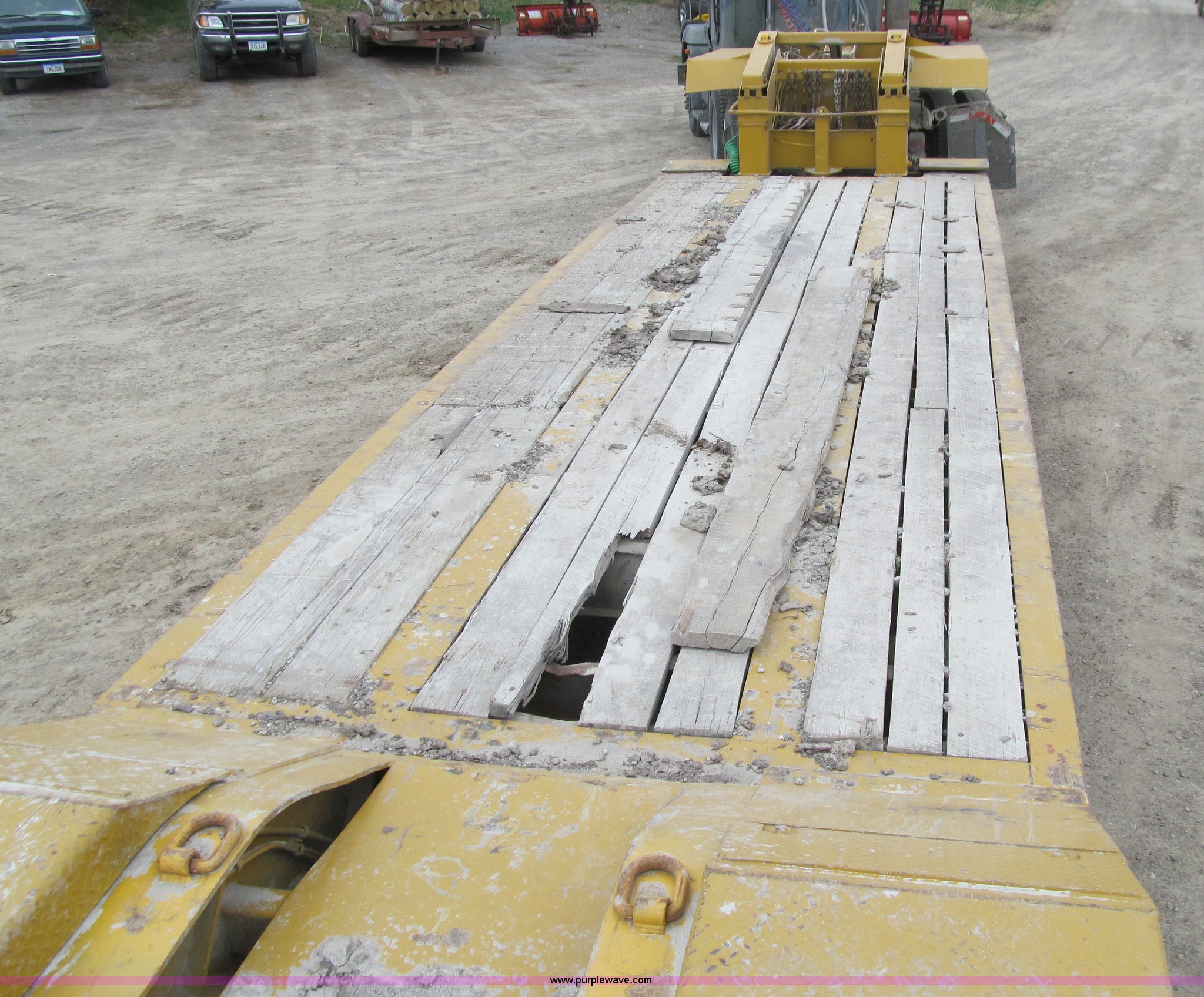 Purple Wave is selling a used Equip. Trailer in Iowa. This item is a 2005 Load King 553SS triple axle lowboy trailer with the following: 23.5'L x 102"W clear deck, Wood deck inserts, Rear bucket pocket, Front loading ramps, (12) swing away outrigger brackets per side, (4) lashing rings at back of clear deck, (2) lashing rings at back of clear deck, Hydraulic removable gooseneck, Non-ground engaging, Front diamond tread steel fenders, Full length removable steel fender over rear triple axle assembly, Air suspension, 225/70R22.5 tires, 16 ply, GVWR 130,060 lbs, GAWR 20,280 lbs