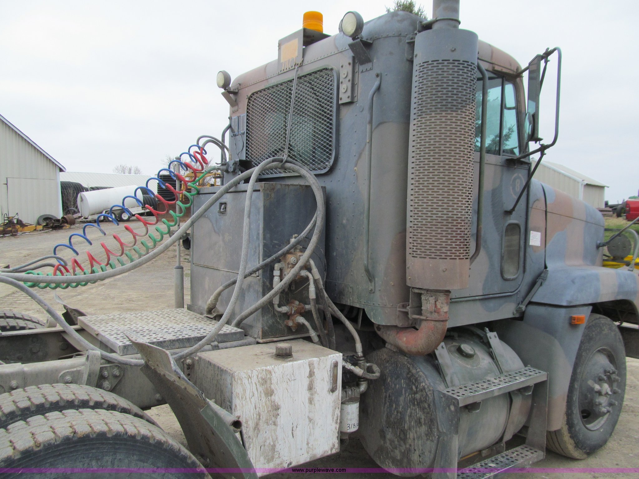 Purple Wave is selling a used Truck Tractor in Iowa. This item is a 1992 Freightliner M915A2 semi truck with the following: 62,609 miles on odometer, Detroit Diesel Series 60 12.7L L6 diesel engine, 400 HP, Allison HT-740 automatic transmission, Inter-axle differential lock, Heat, Air suspension seats, Passenger daylight door, 80 gallon fuel tank, Single rear exhaust stack, Aluminum deck plate, Grille over rear cab window, Tow hooks, Pintle hitch, Tow eye and air lines to rear of frame, PTO, Wet kit, Spring suspension, Air brakes, Jake brake, 4:56 gear ratio, 158" wheelbase, 11R22.5 tires, GVWR 52,000 lbs, FAWR 12,000 lbs, IAWR 20,000 lbs, RAWR 20,000 lbs, Cab contents not included, Speedometer inoperable