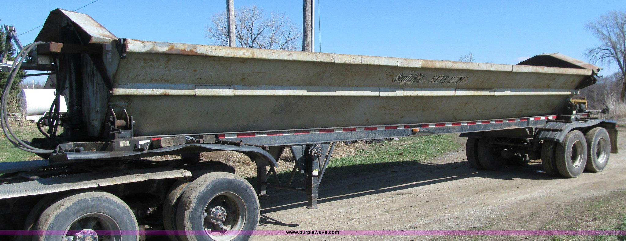Purple Wave is selling a used Side Tilt Dump Trailer in Iowa. This item is a 1995 Smithco 5C1 side dump trailer with the following: 34'L x 102"W, Tarp, Spring suspension, Air brakes, 11R22.5 tires, GAWR 20,000 lbs, Patches down both sides of tub, Front hydraulic cylinder leaks, Right side landing gear inoperable