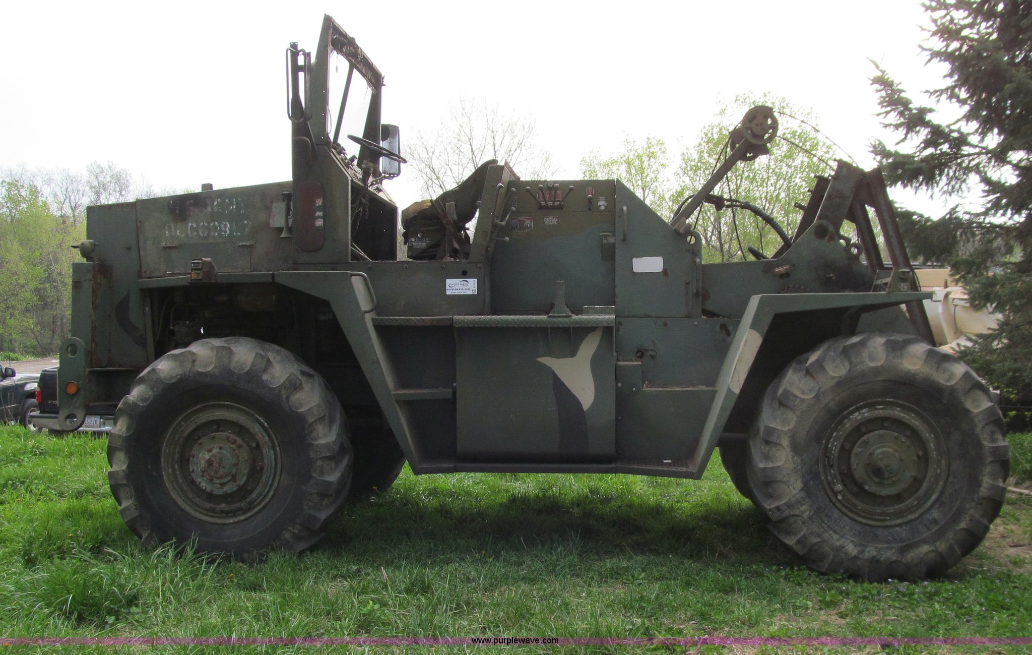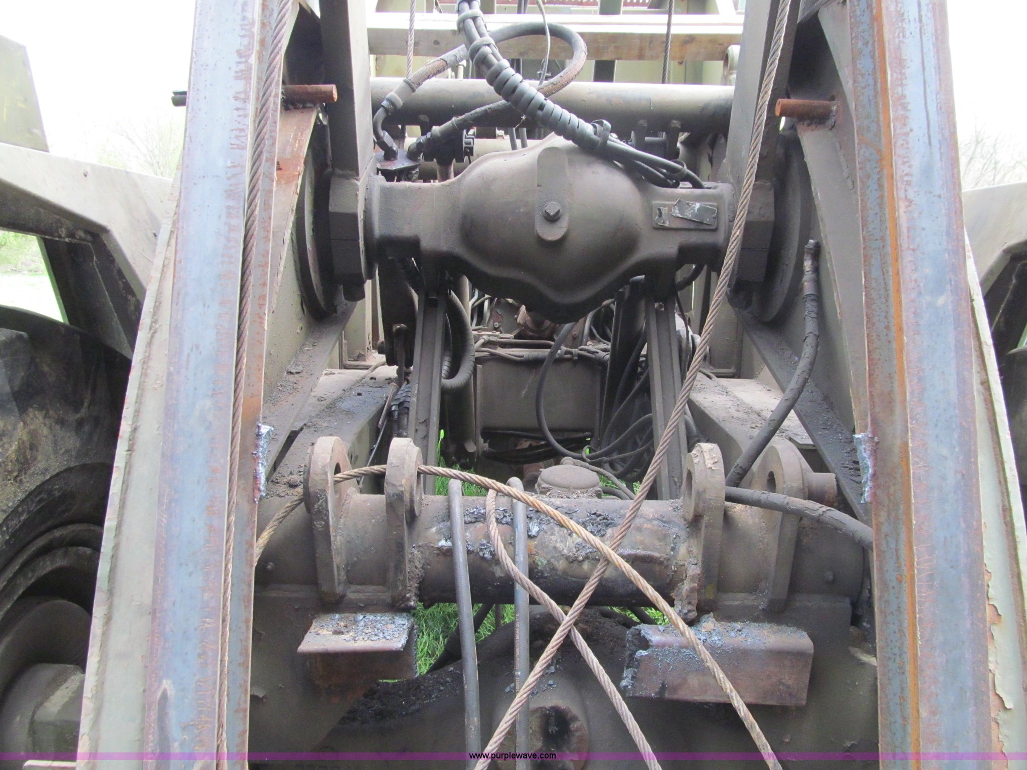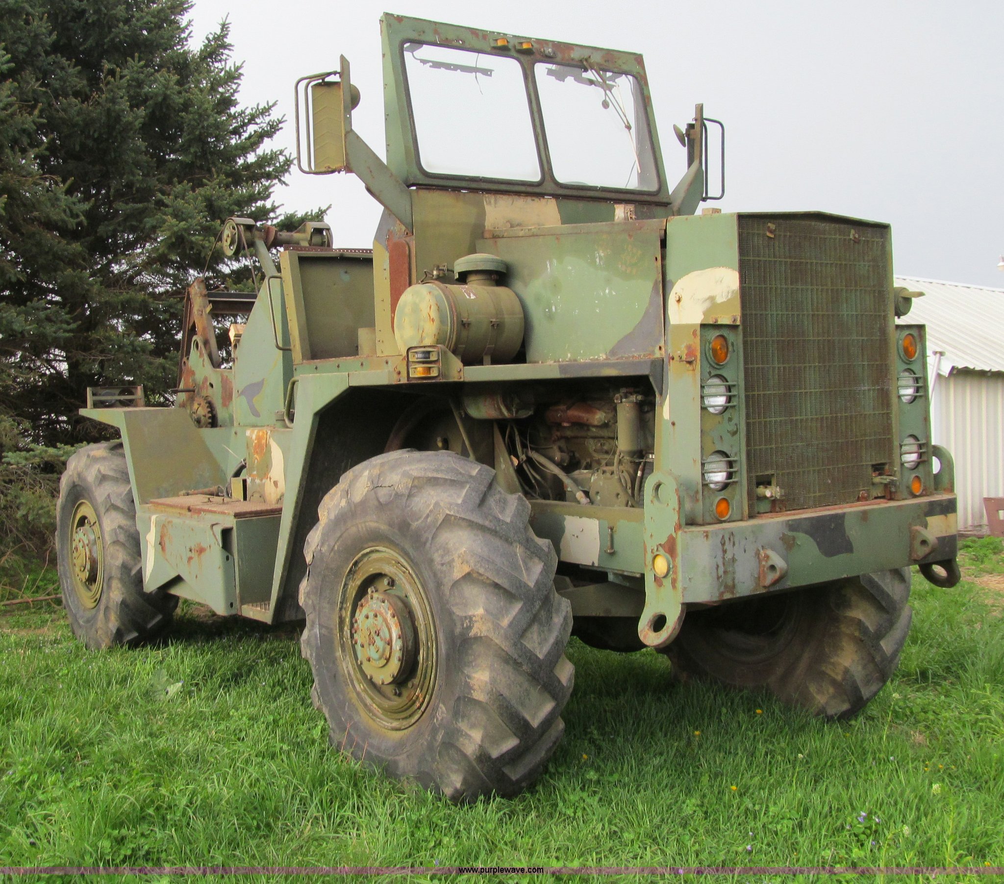 U.S. Army power unit. 149 hours on meter, Detroit Diesel V6 diesel engine, Power shift transmission 6F-1R gears, Four wheel drive, Shaft driven gearbox to power trencher wheel Hydraulic height adjustment, Air lines to the front of chassis, Requisition No. 08C69967, FSN No. 3805-50-4638, Air brakes, 18.00-25 tires Weathering and sidewall cuts, Serial 023. Kemp & Son, Inc.. 13735 175th St. Letts, IA 52754