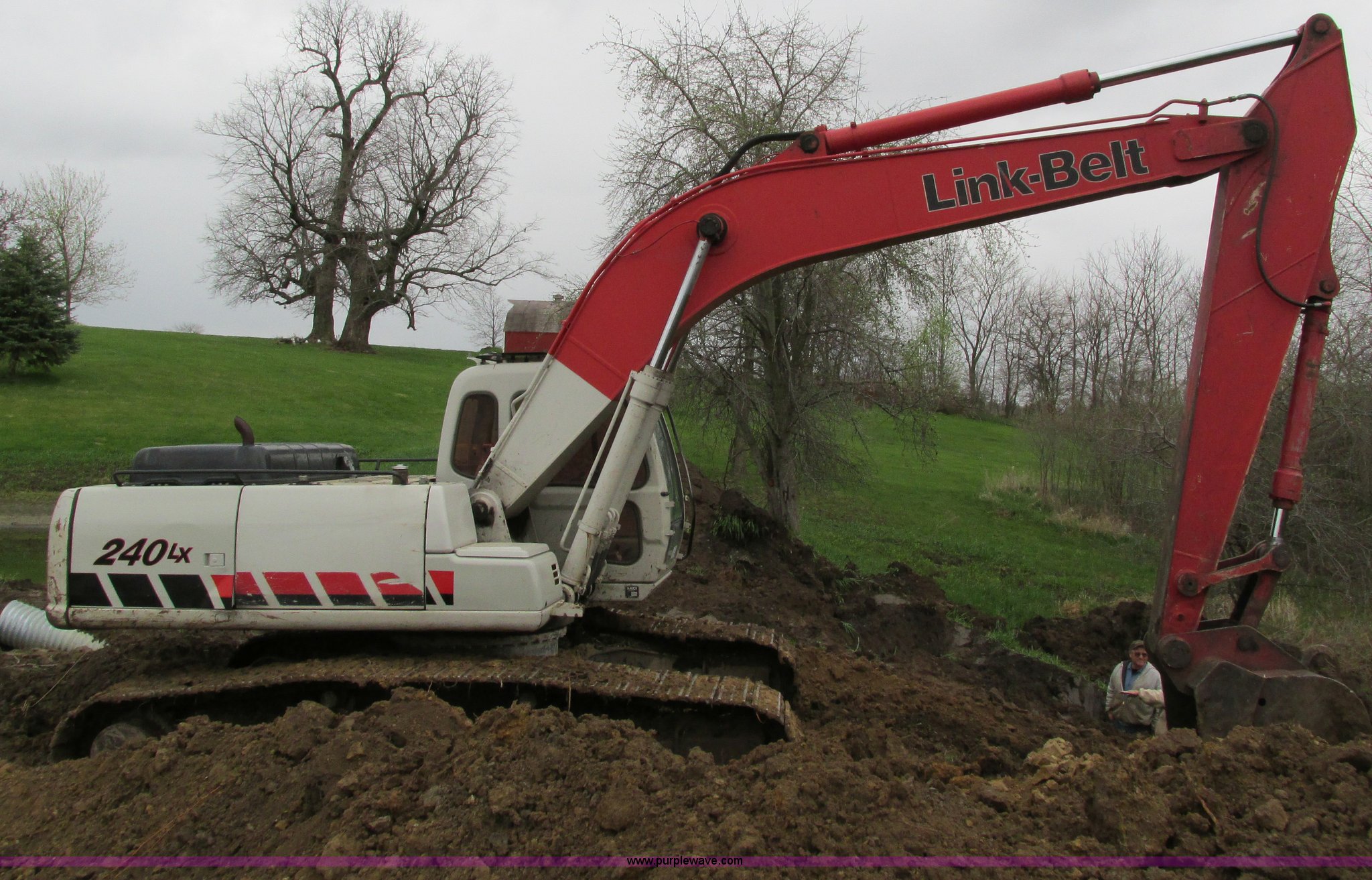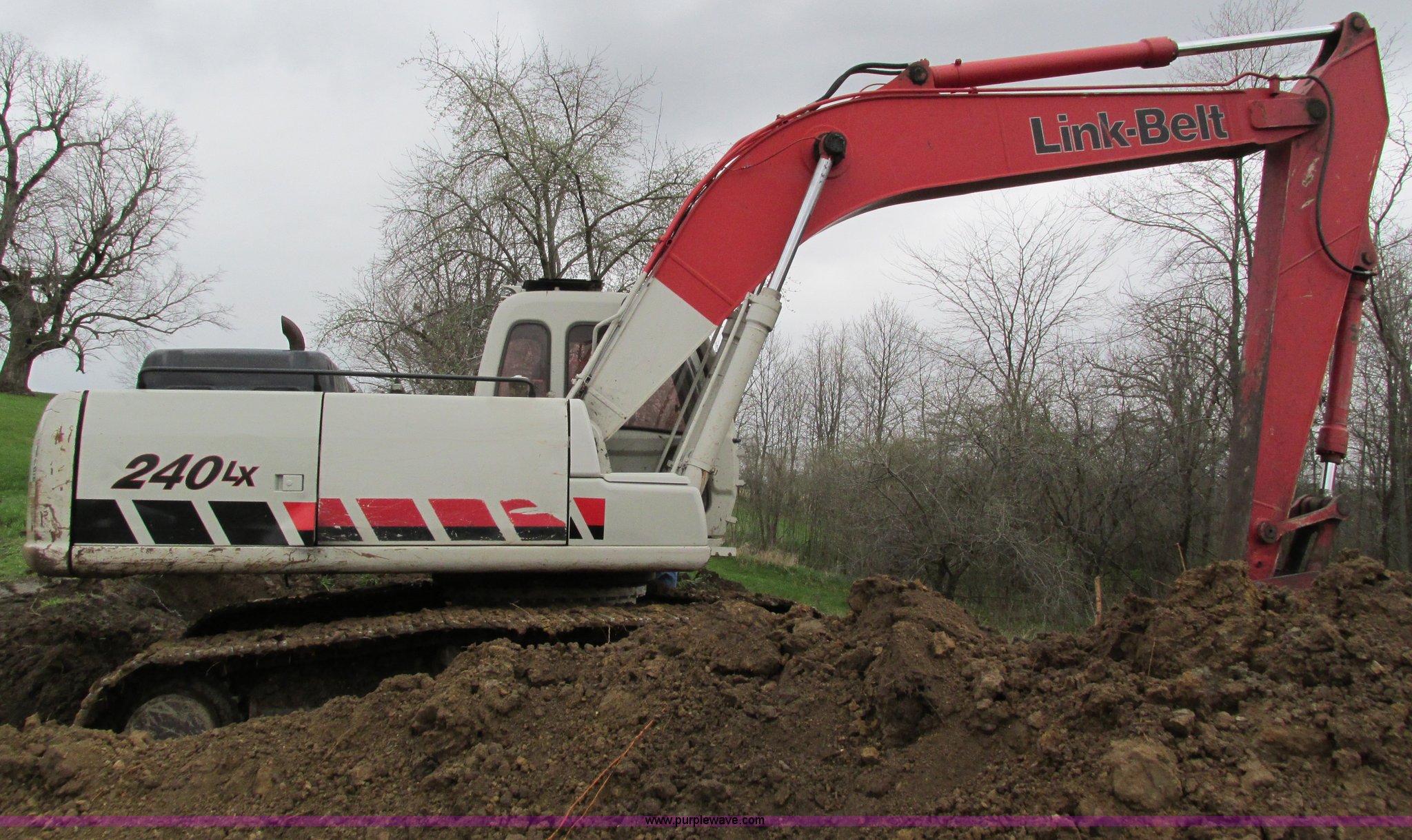 Purple Wave is selling a used Hydraulic Excavator in Iowa. This item is a 2005 Link Belt 240LX excavator with the following: 5,747 hours on meter, Hours may vary, unit is still in use, Isuzu BB-6BG1T 396 C.I.D. six cylinder turbo diesel engine, 162 HP, Hydrostatic transmission, Two speed travel, Single pedal travel, AC and heat, AM/FM, Spring suspension seat, LCD in-cab monitor, Electronic engine control, Auto power up, Joystick controls, Pattern changer, 11'7" stick, Two speed boom and arm, Esco 42"W five tooth bucket, 1.43 cubic yard capacity, Travel alarm, Nine bottom rollers, 31.5"W steel triple grouser track pads, 52,700 lbs. base operating weight, Rails, sprockets, top and bottom rollers, front and rear idlers replaced August 2013, Serial K4J5-0385