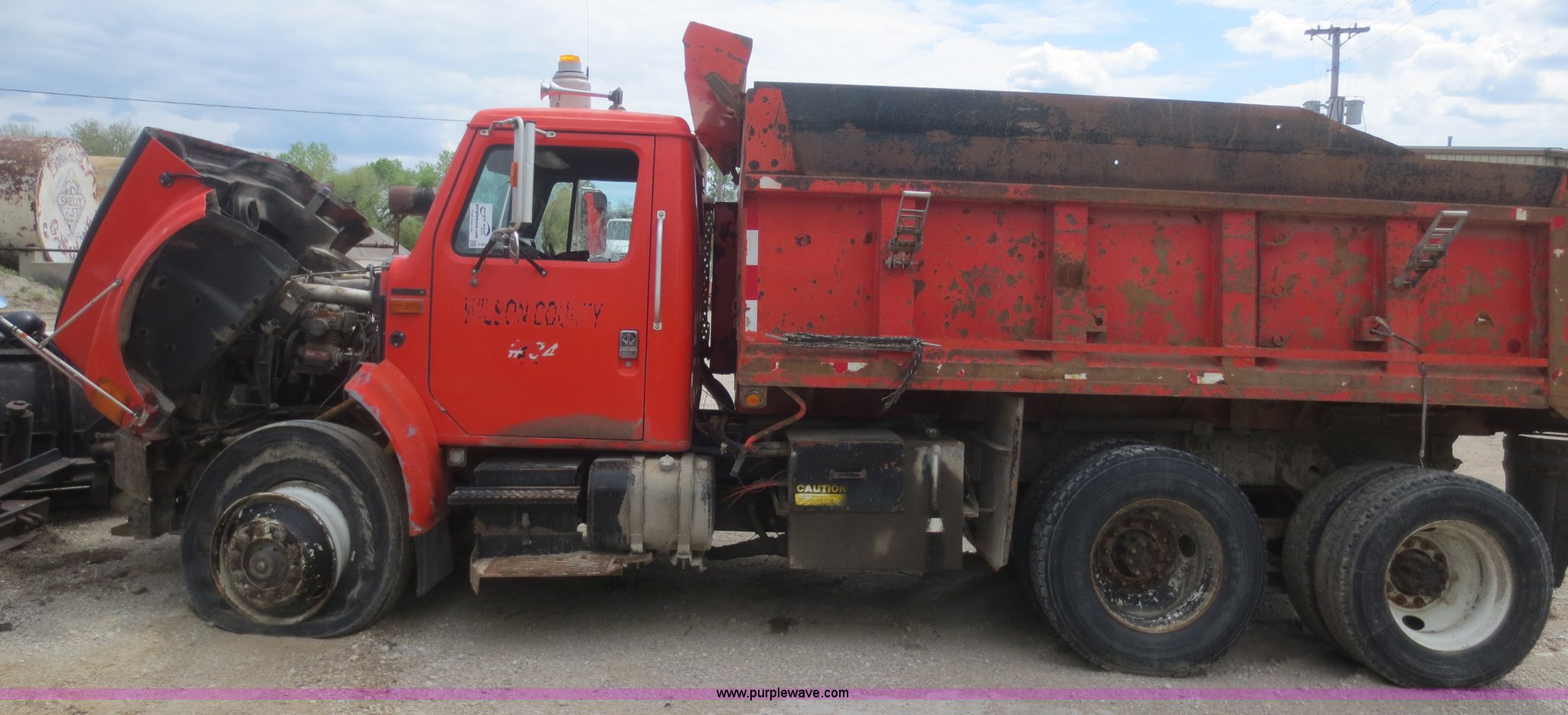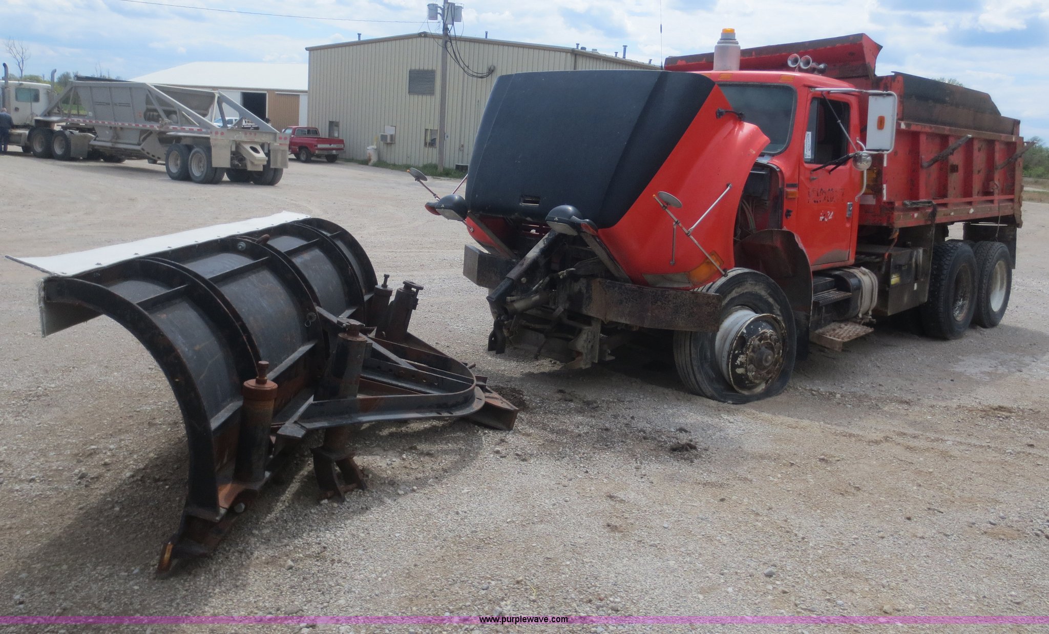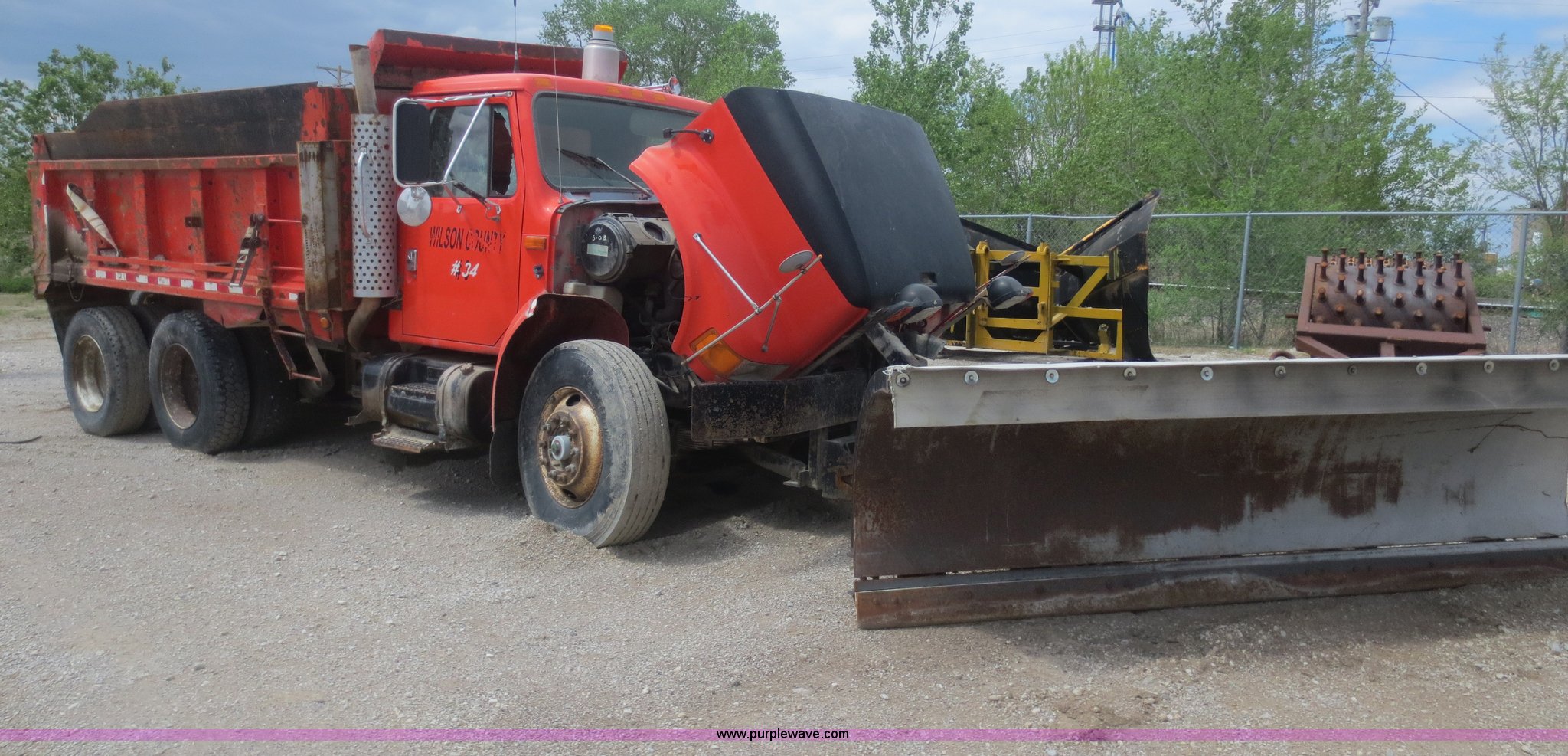 1993 International 4900 dump truck. 351,522 miles on odometer, 17,122 hours on meter, International DT466 7.6L L6 diesel engine, Automatic transmission, Twin screw, AC and heat, AM/FM/cassette, Air suspension seat, Heated mirrors, 13' dump bed Air end gate, Single ram hoist, Balk STB-11 plow 11', PTO, Air suspension, Air brakes, 176" wheelbase, 295/75R22.5 tires, Two way radio will be removed , Wreck damage, Non-operational, Unit# 34. 1HTSHN2RXPH482677. Wilson County Road and Bridge. 10990 Harper Rd. Fredonia, KS 66736