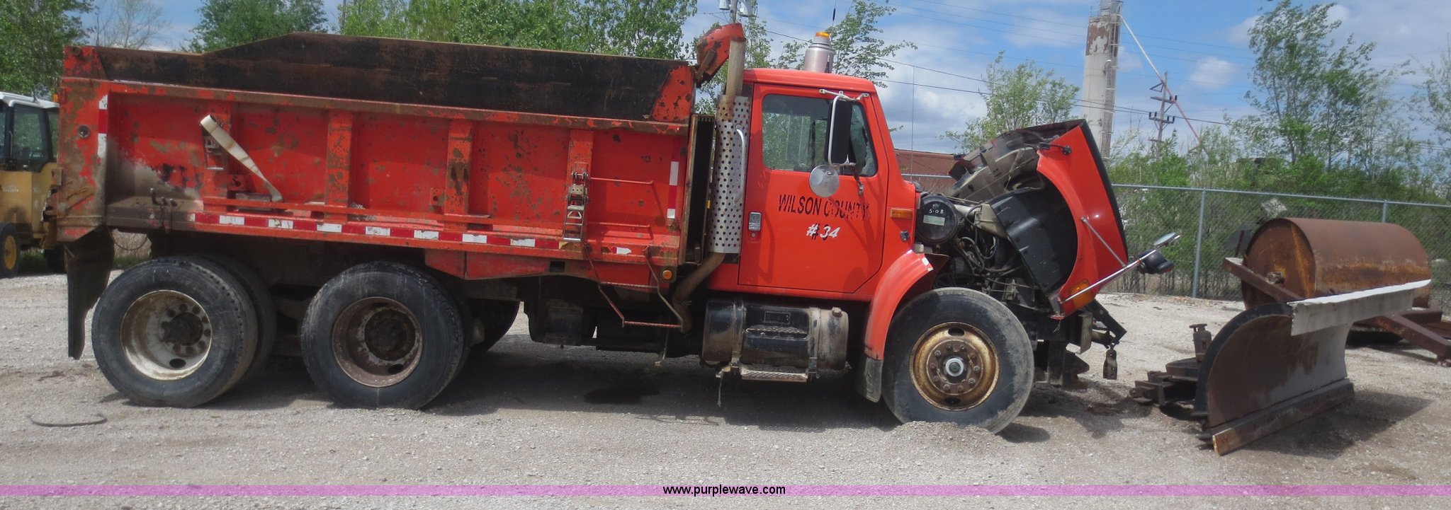 Purple Wave is selling a used Construction Dump Truck in Kansas. This item is a 1993 International 4900 dump truck with the following: 351,522 miles on odometer, 17,122 hours on meter, International DT466 7.6L L6 diesel engine, Automatic transmission, Twin screw, AC and heat, AM/FM/cassette, Air suspension seat, Heated mirrors, 13' dump bed, Air end gate, Single ram hoist, Balk STB-11 plow, 11', PTO, Air suspension, Air brakes, 176" wheelbase, 295/75R22.5 tires, Two way radio will be removed, Wreck damage, Non-operational, Unit# 34