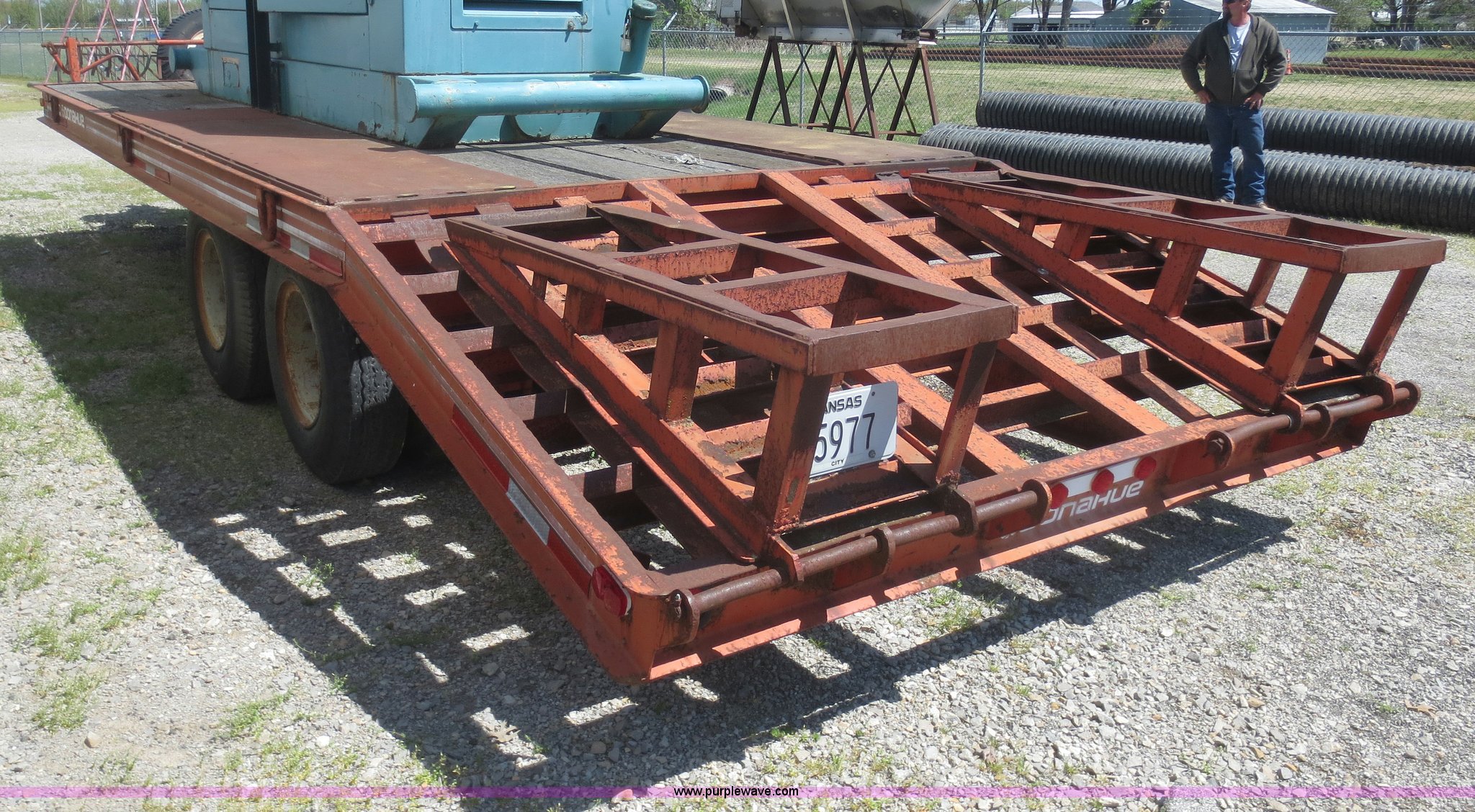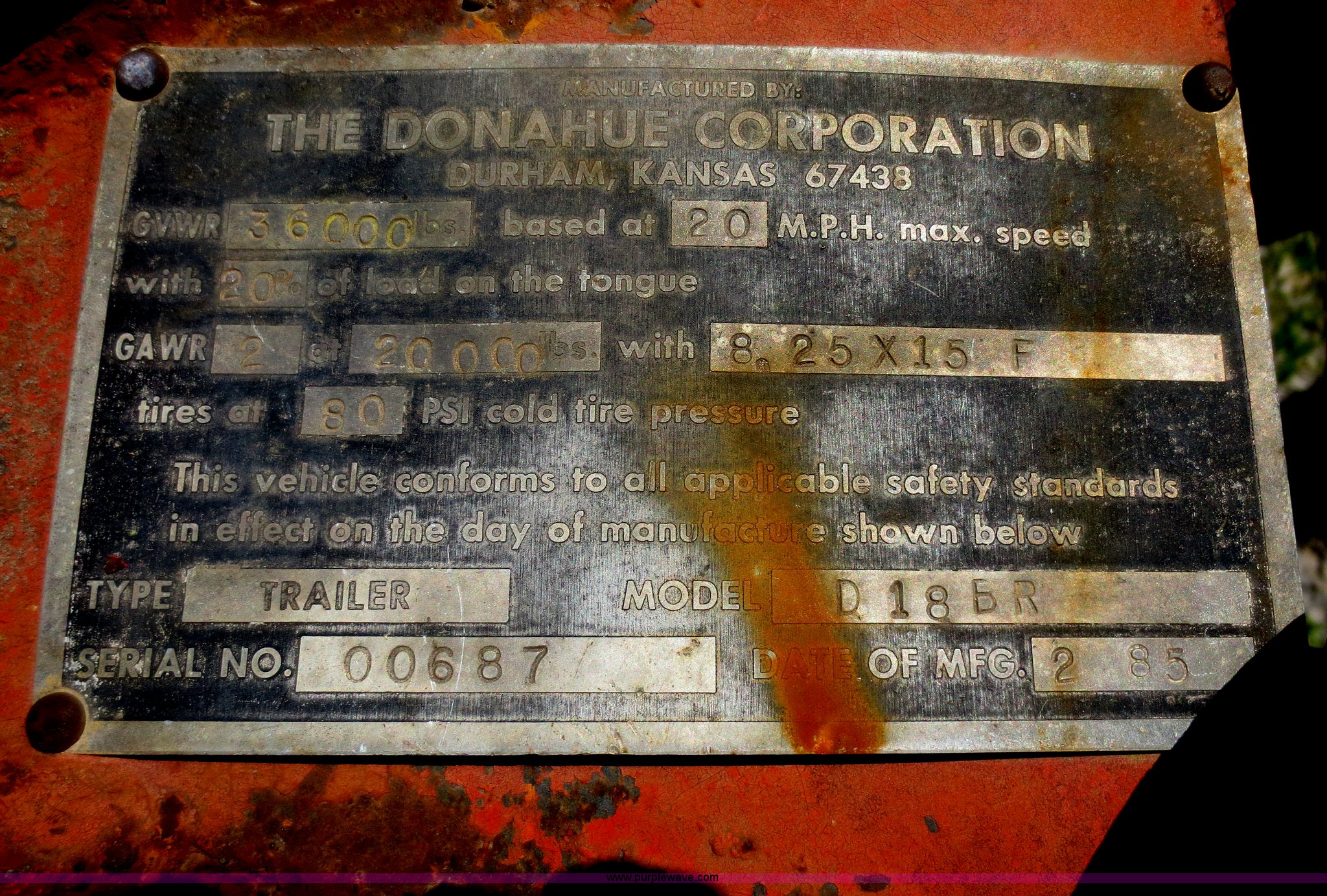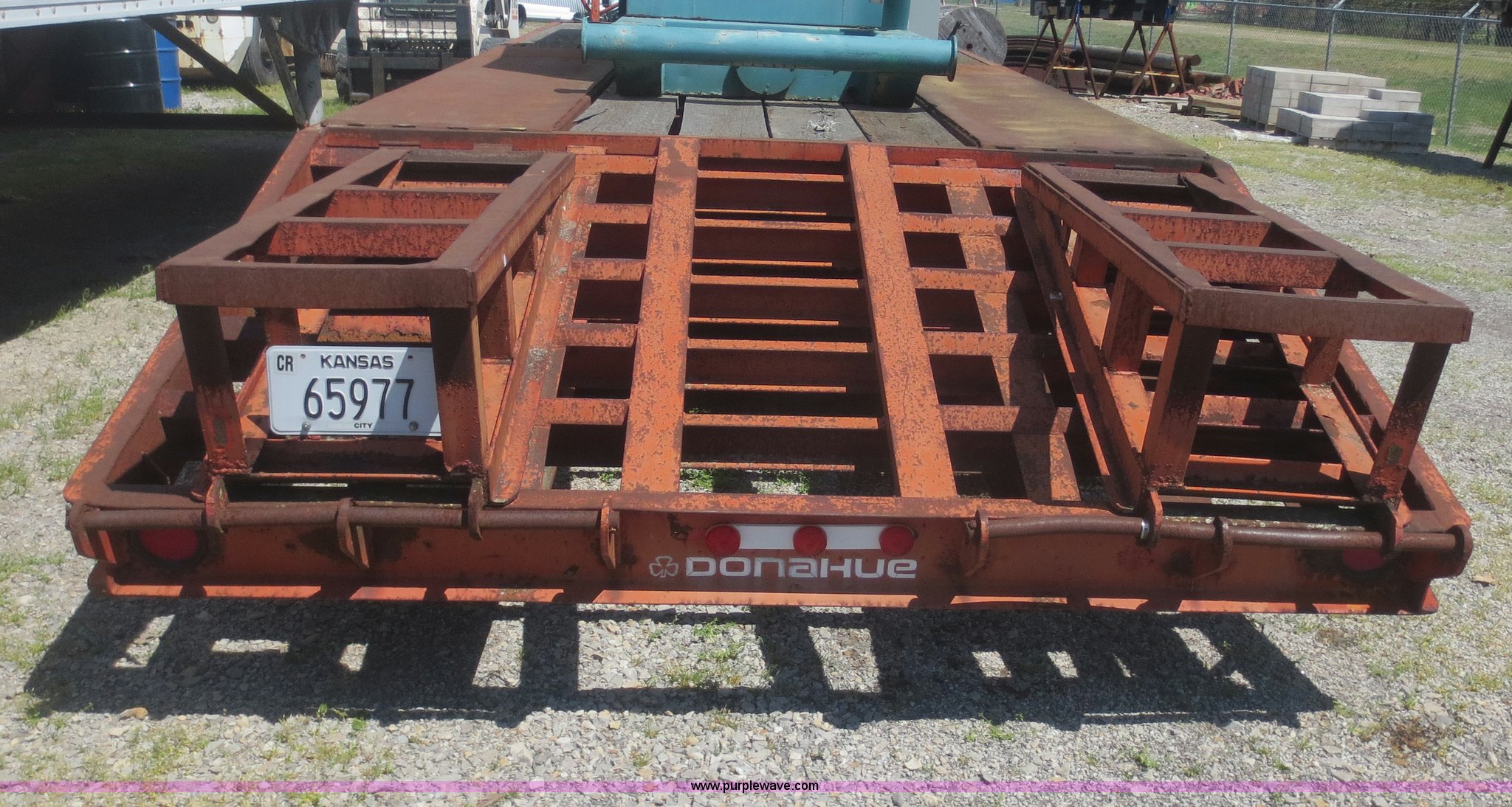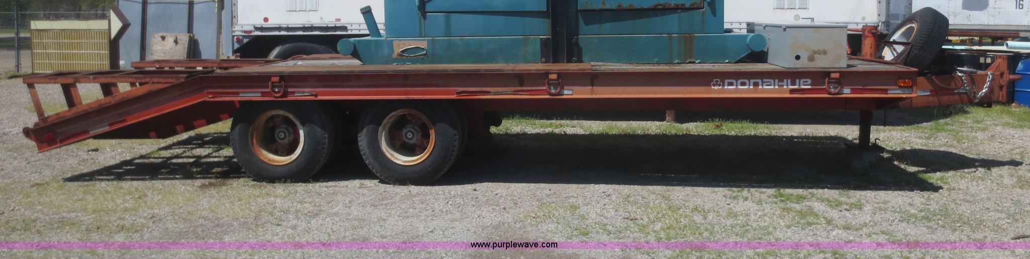 Purple Wave is selling a used Flat or Drop Deck Trailer in Kansas. This item is a 1985 Donahue D18BR equipment trailer with the following: 18'L wood deck, 5' dove tail, 96"W, Twin loading ramps, Tandem axle, GVWR 36,000, Spring suspension, Pintle hitch, Air brakes, 8.25-15TR tires, Generator not included