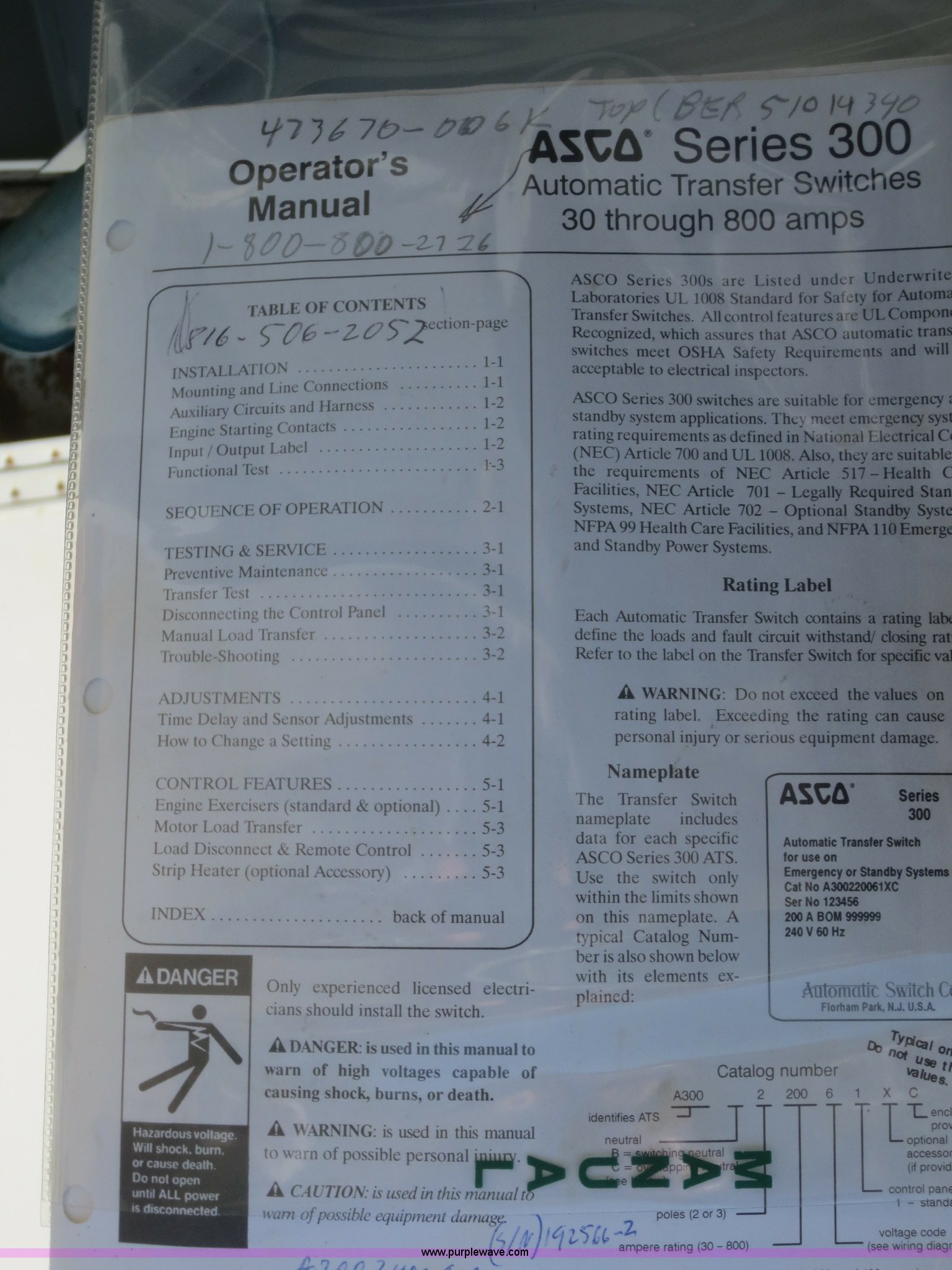Purple Wave is selling a used Generator Set in Kansas. This item is a Skid mounted 50K generator with the following: Six cylinder diesel engine, 385 hours on meter, ASCO automatic transfer switch
