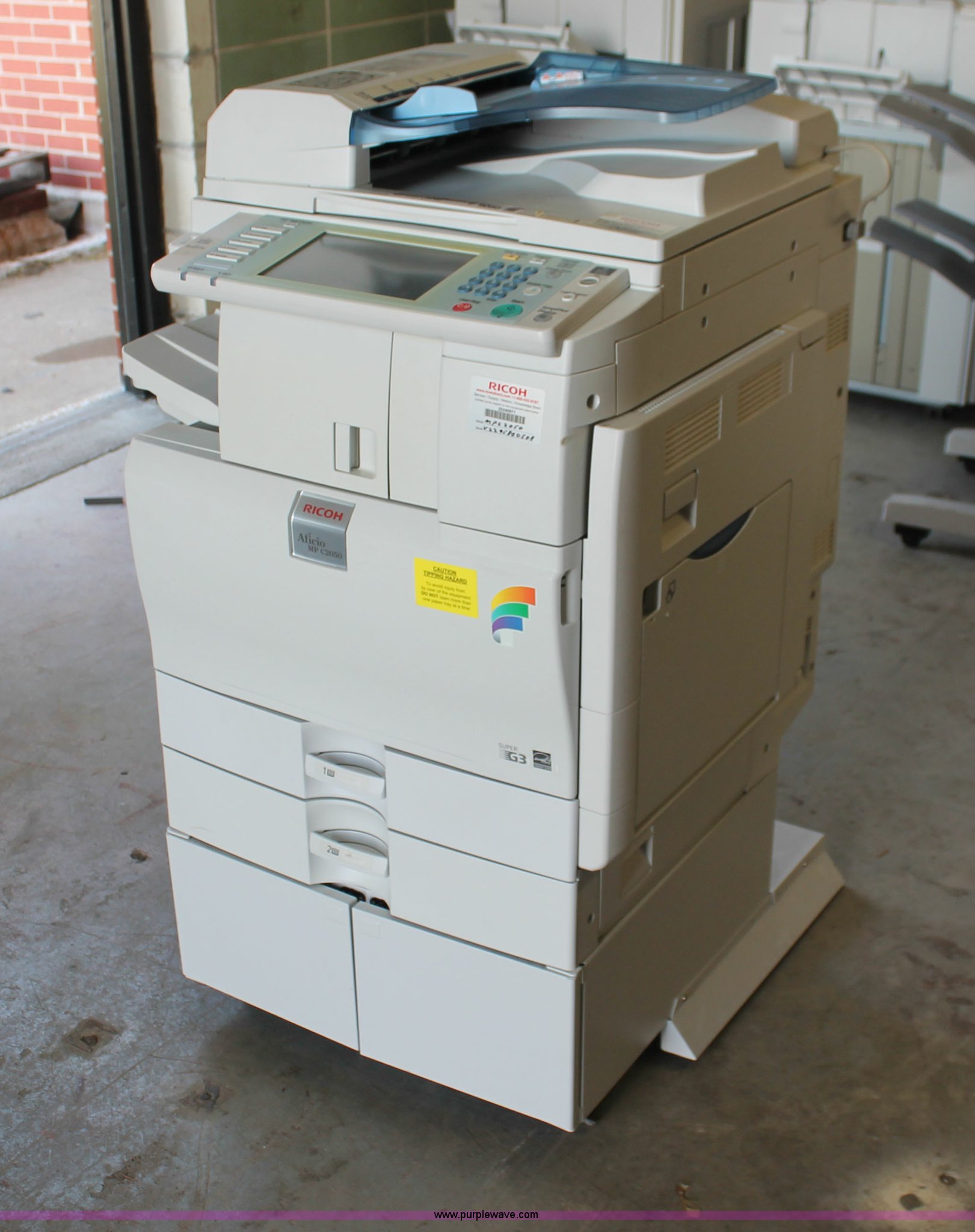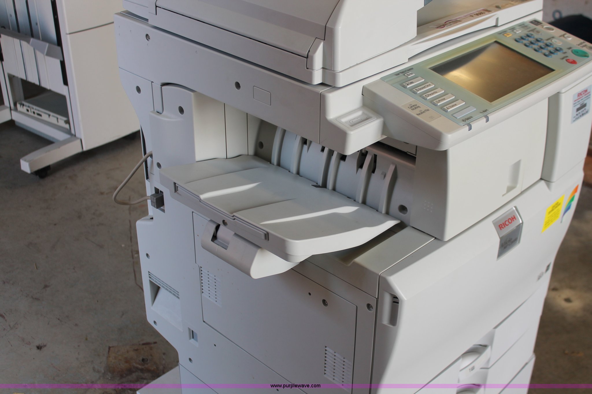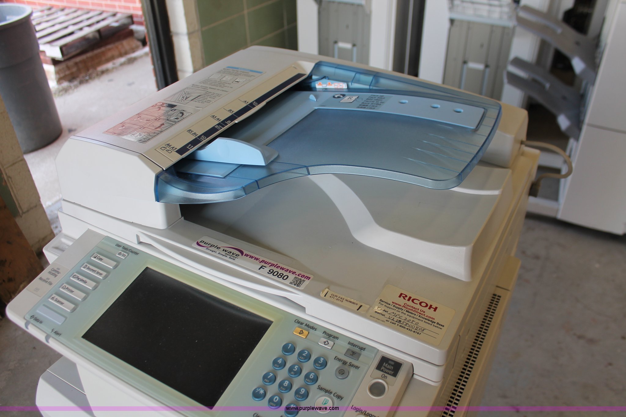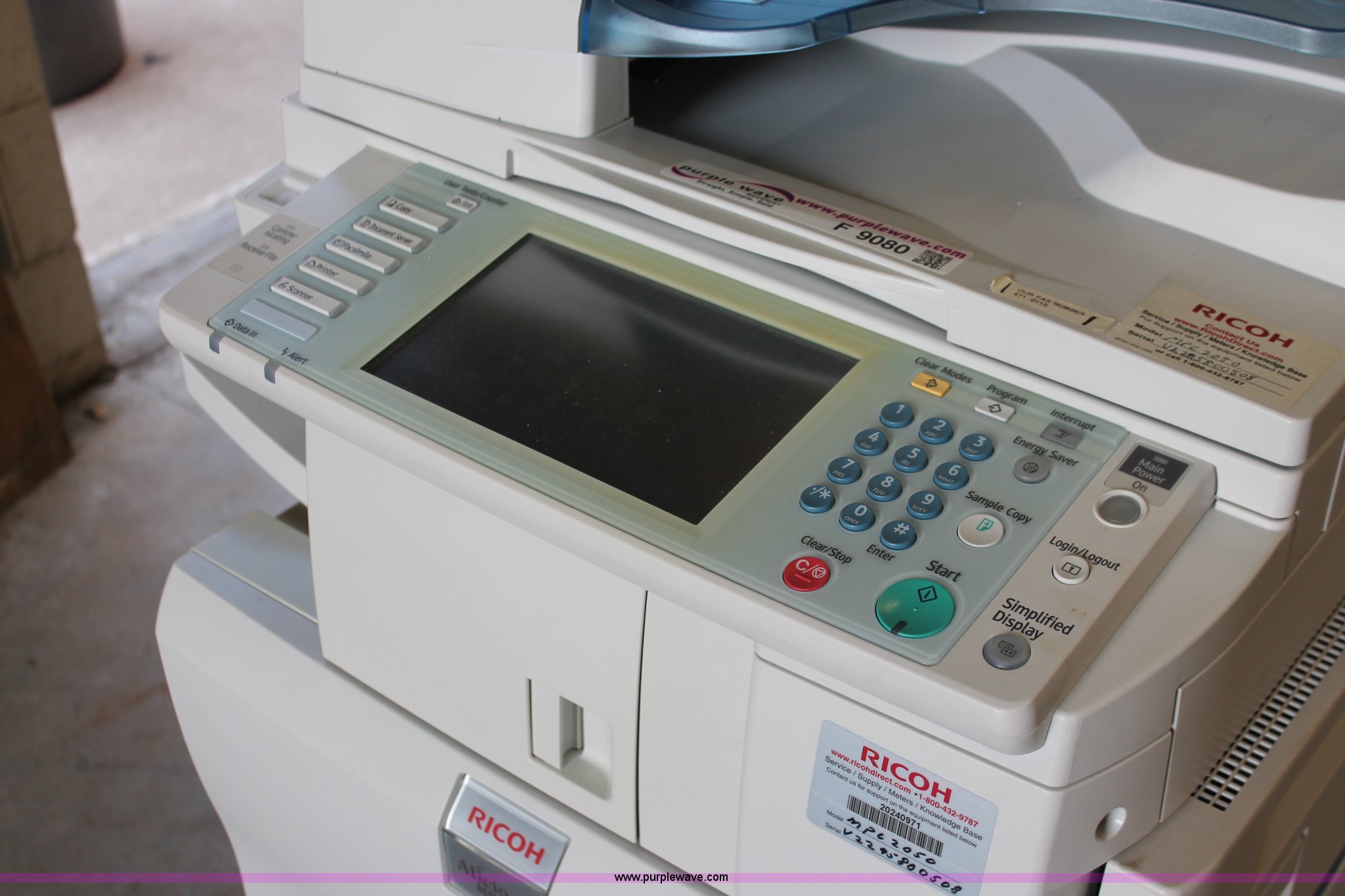 Purple Wave is selling a used Copy or Printing Machine in Missouri. This item is a Ricoh Aficio MP C2050 document server with the following: Digital display, (2) paper compartments, Auto document feed, Adjustable size, Collate, Assorted component inputs, Serial V2295800508