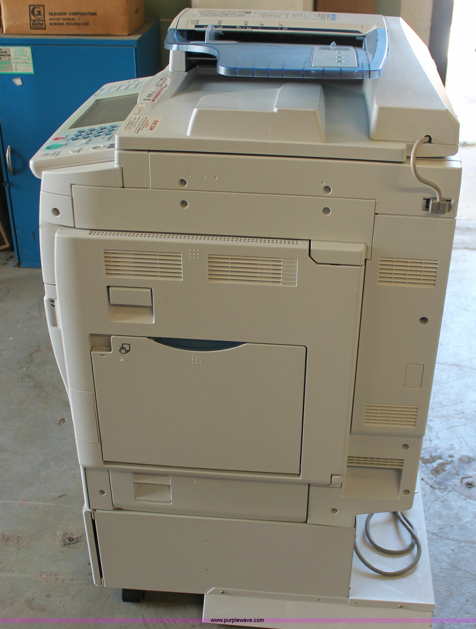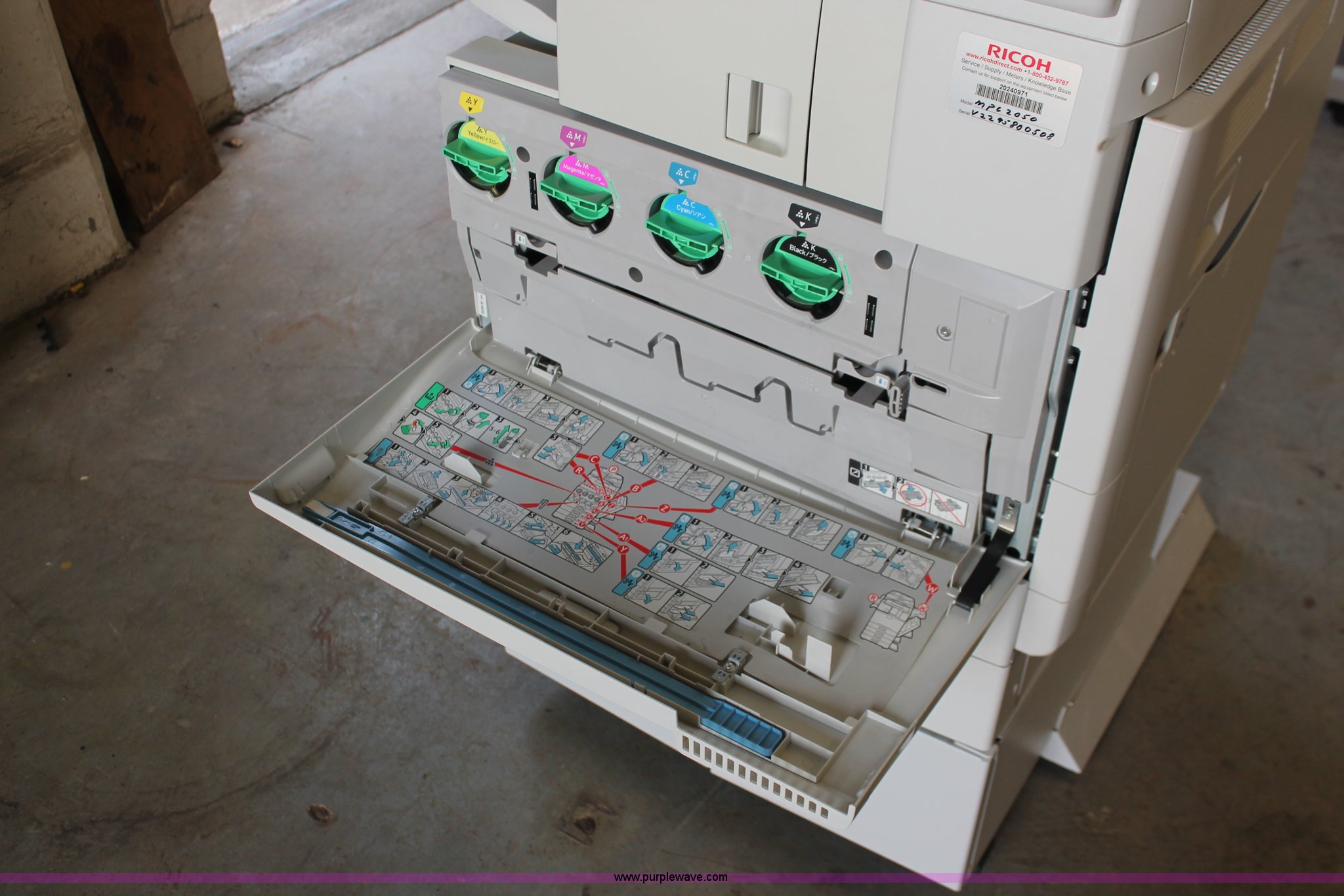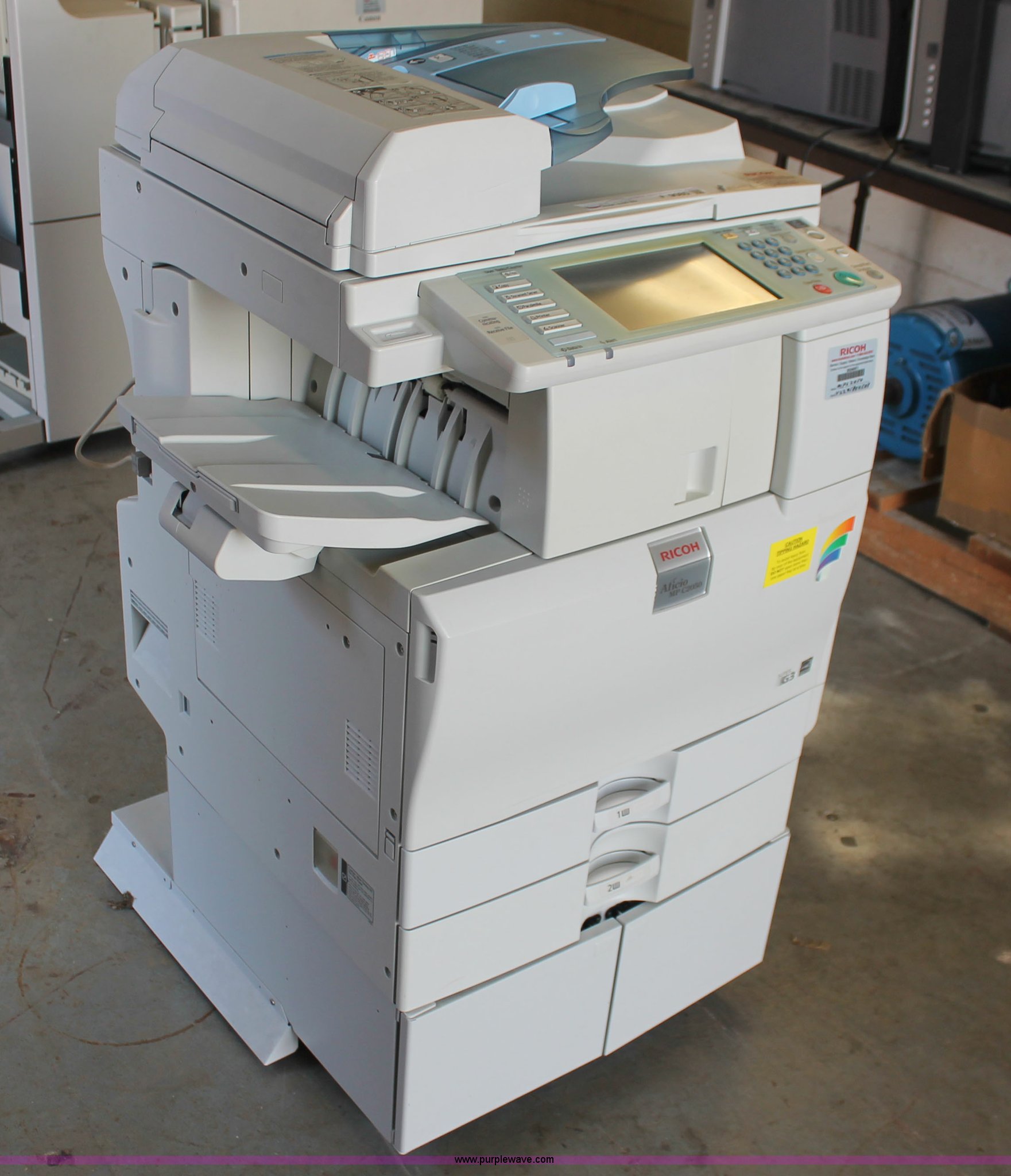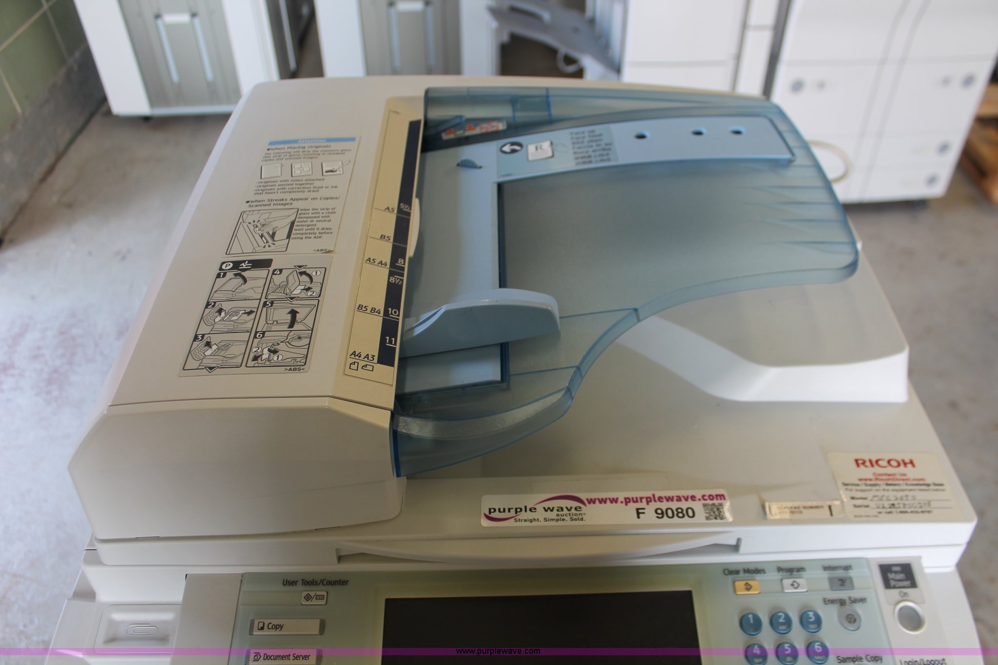 Purple Wave is selling a used Copy or Printing Machine in Missouri. This item is a Ricoh Aficio MP C2050 document server with the following: Digital display, (2) paper compartments, Auto document feed, Adjustable size, Collate, Assorted component inputs, Serial V2295800508