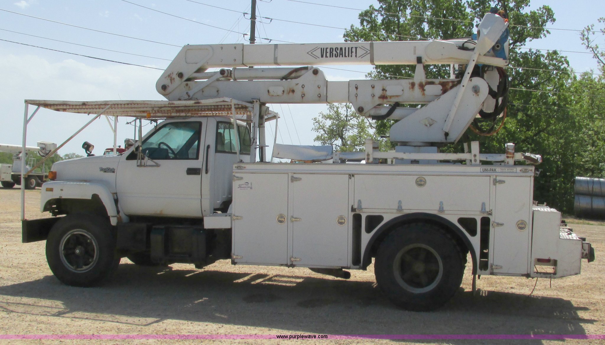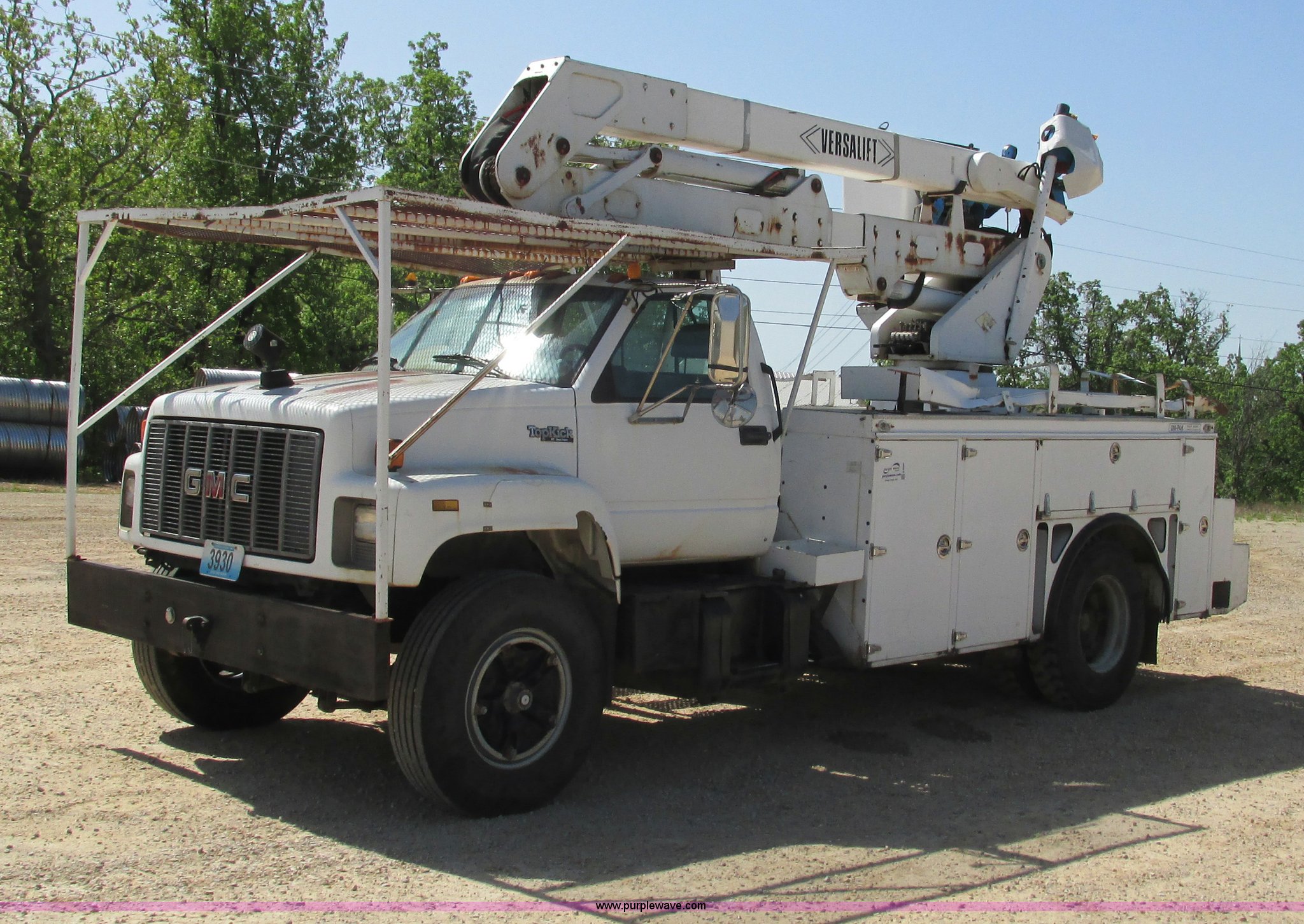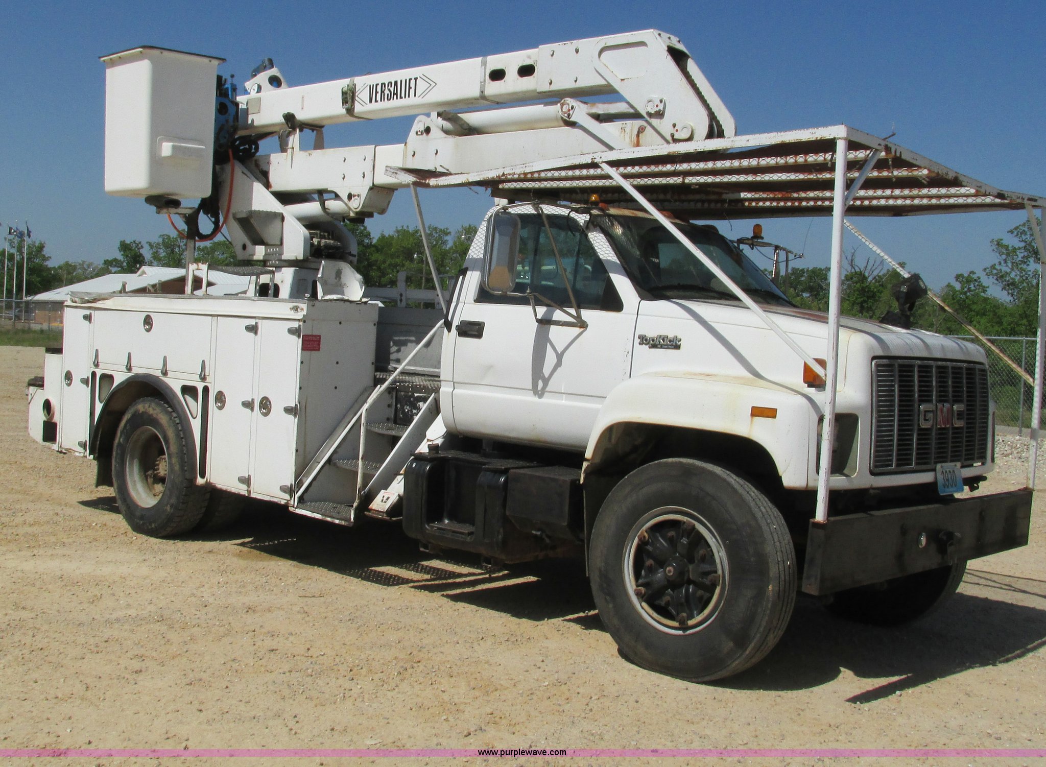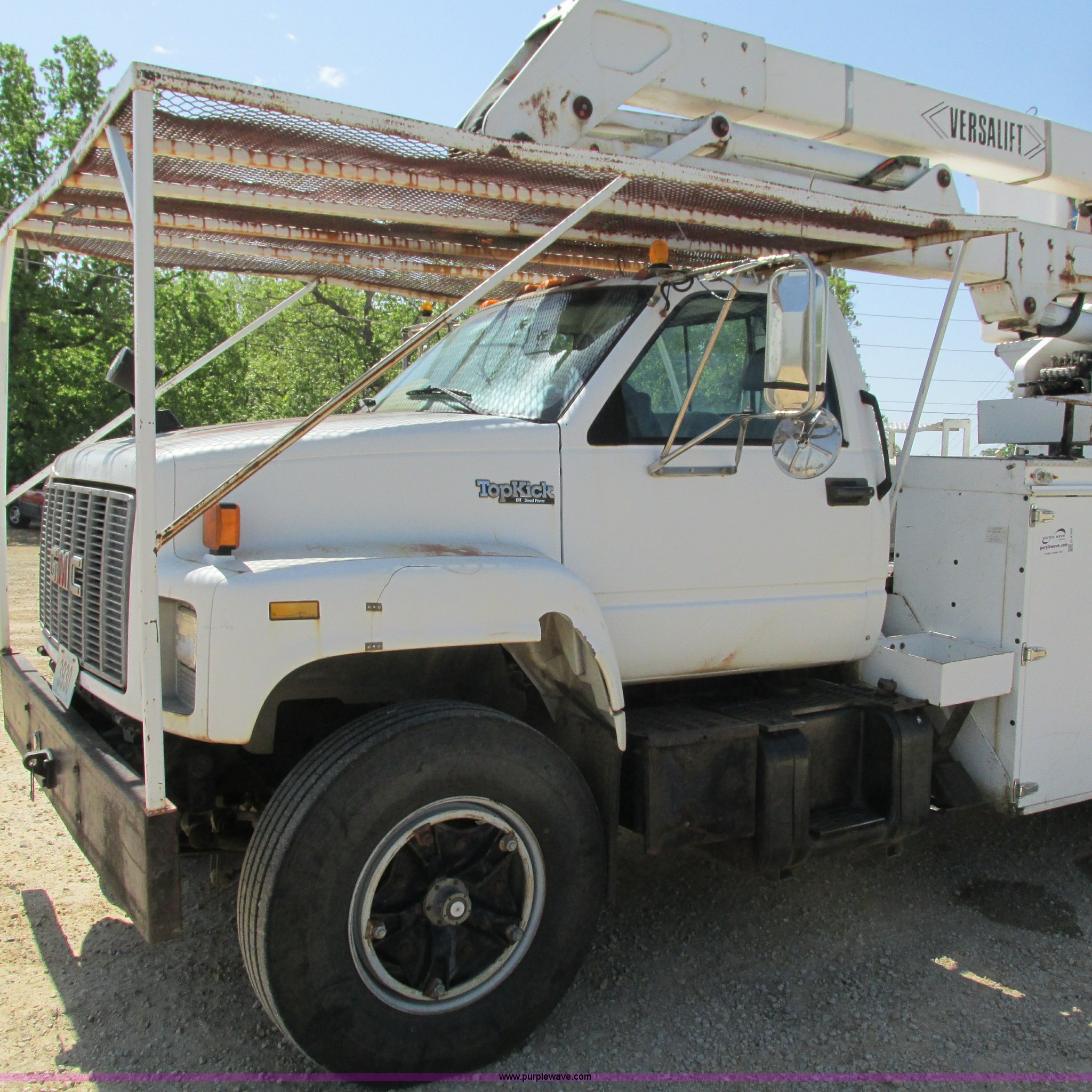 Purple Wave is selling a used Service Truck in Missouri. This item is a 1995 GMC TopKick service truck with the following: 137,616 miles on odometer, Miles may vary, still in use, Caterpillar 3116 6.6L six cylinder diesel engine, Automatic transmission, AC and heat, Spring suspension cloth driver's seat, Vinyl bench seat, Unipak utility bed, Versalift bucket boom, Model VD36MHI, Stabilizers, Platform rated at 350 lbs, 46 kV and below rated line voltage, Insulated boom, 12V DC, 2,500 hydraulic system operating pressure, Serial AW9611, Serial AD36-0138, Dual 35 gallon fuel tanks, Air brakes, 11R22.5 tires, GCW 53,000 lbs, Interior/exterior cosmetic damage, Two way radio will be removed, Ladder rack damage, Overcab protection damage