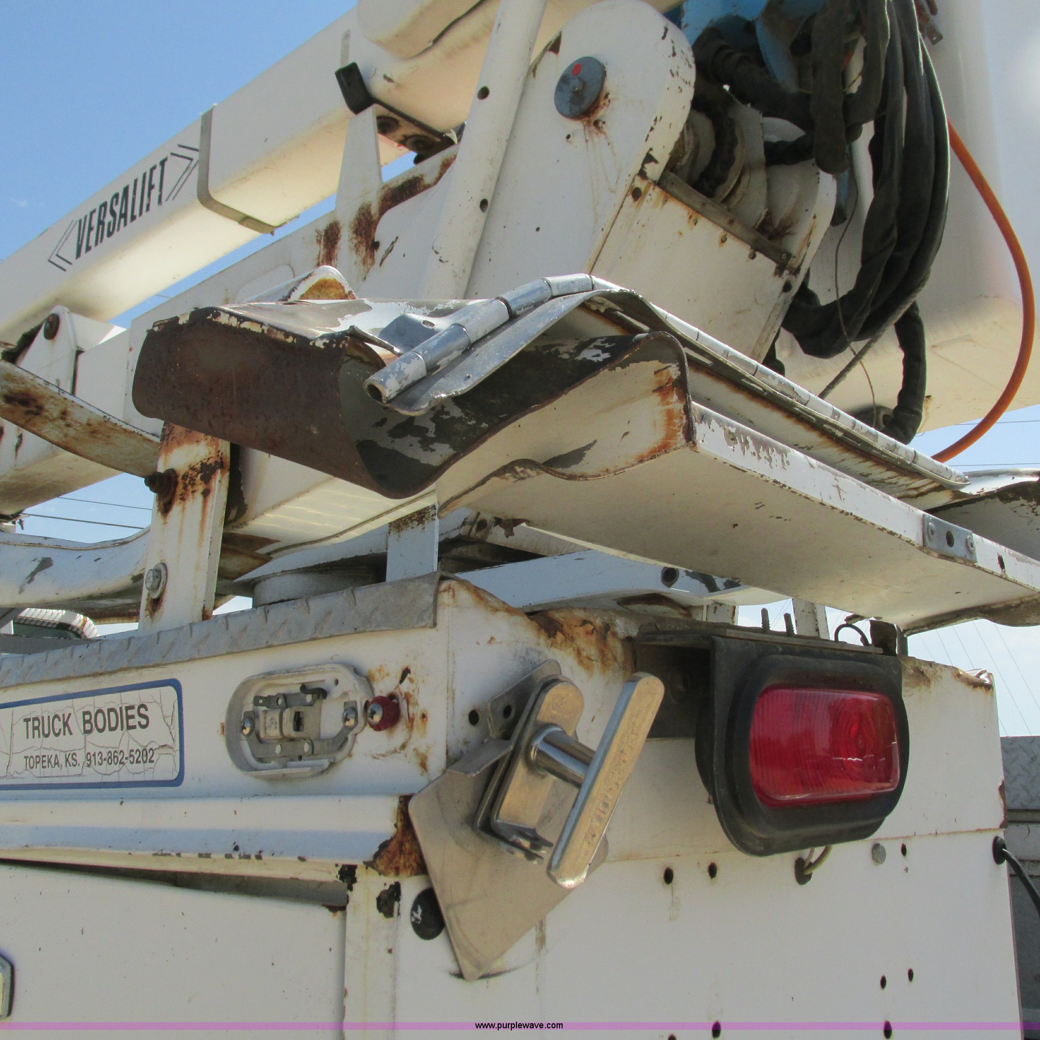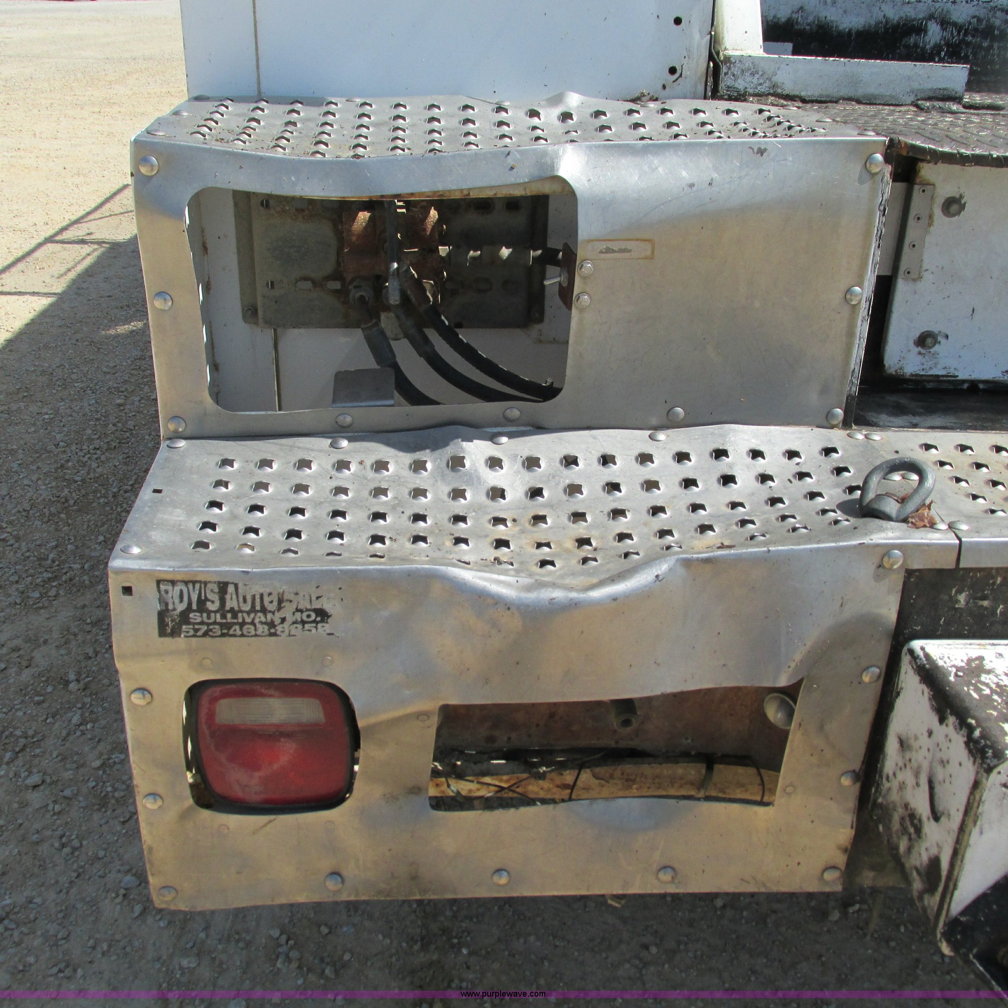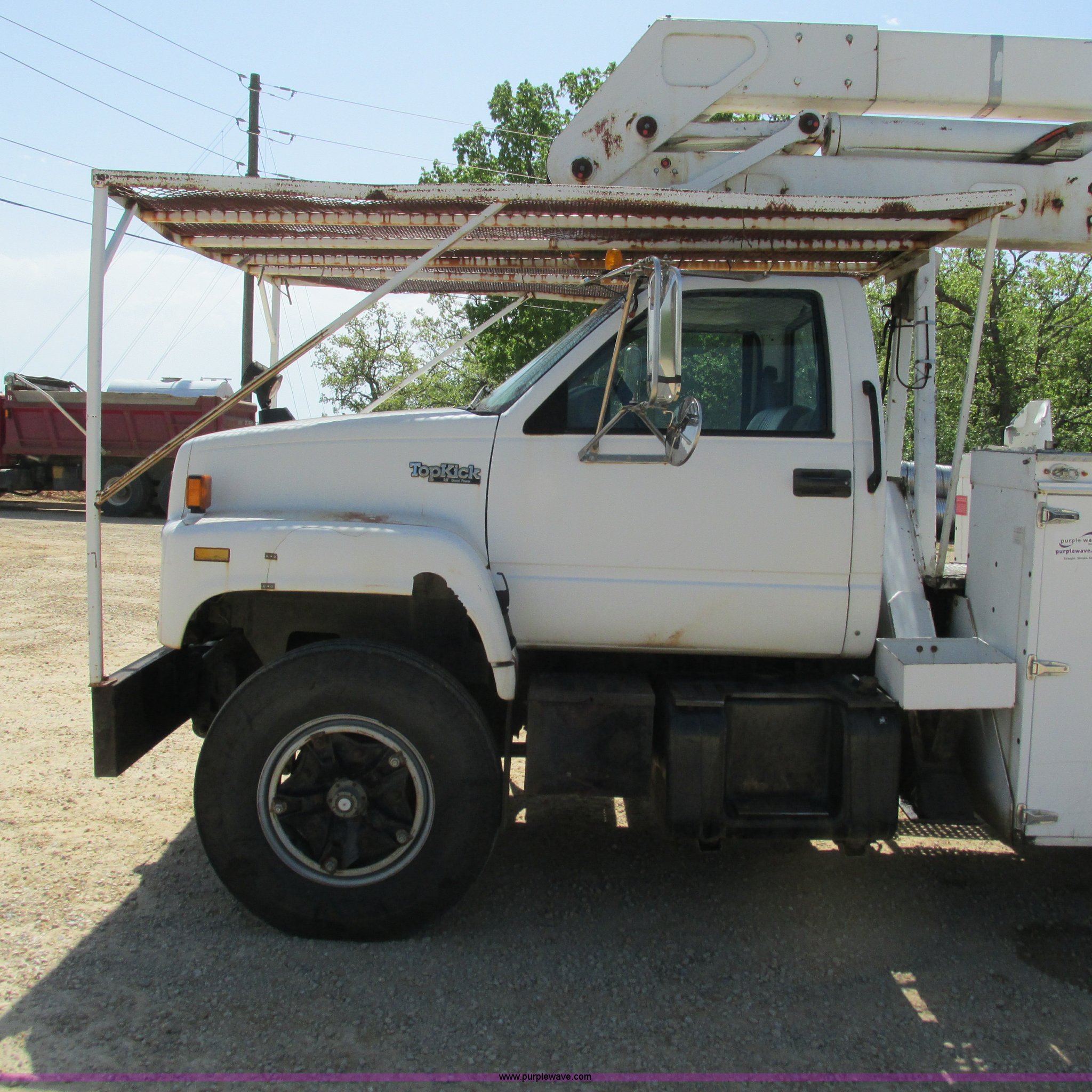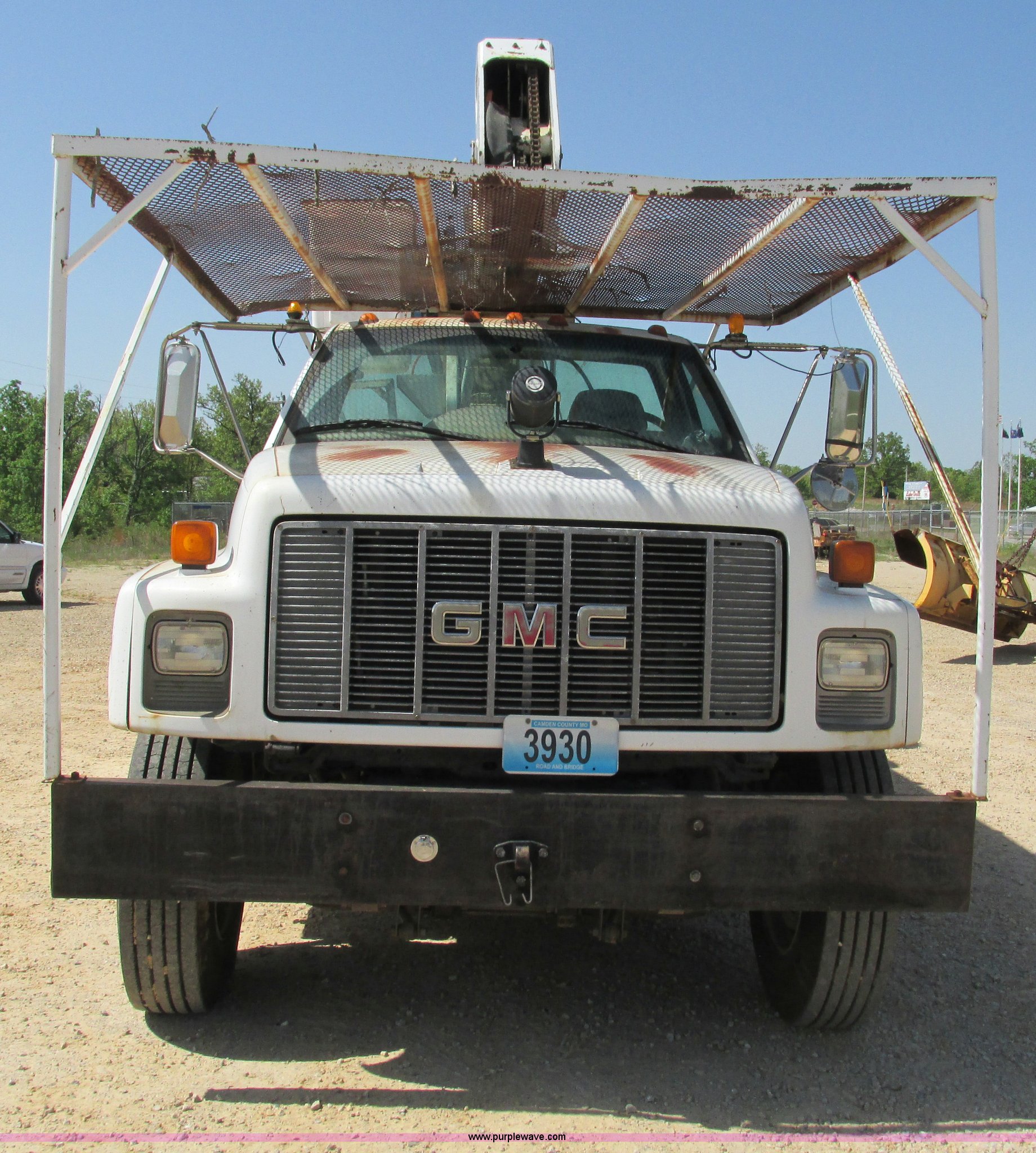 Purple Wave is selling a used Service Truck in Missouri. This item is a 1995 GMC TopKick service truck with the following: 137,616 miles on odometer, Miles may vary, still in use, Caterpillar 3116 6.6L six cylinder diesel engine, Automatic transmission, AC and heat, Spring suspension cloth driver's seat, Vinyl bench seat, Unipak utility bed, Versalift bucket boom, Model VD36MHI, Stabilizers, Platform rated at 350 lbs, 46 kV and below rated line voltage, Insulated boom, 12V DC, 2,500 hydraulic system operating pressure, Serial AW9611, Serial AD36-0138, Dual 35 gallon fuel tanks, Air brakes, 11R22.5 tires, GCW 53,000 lbs, Interior/exterior cosmetic damage, Two way radio will be removed, Ladder rack damage, Overcab protection damage