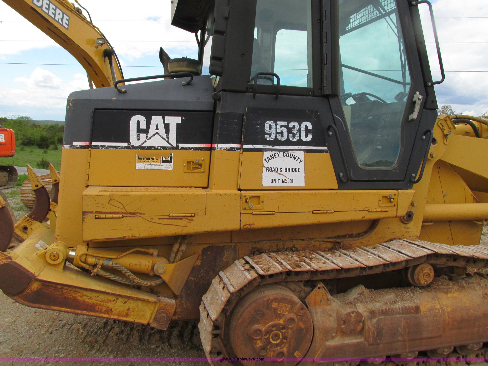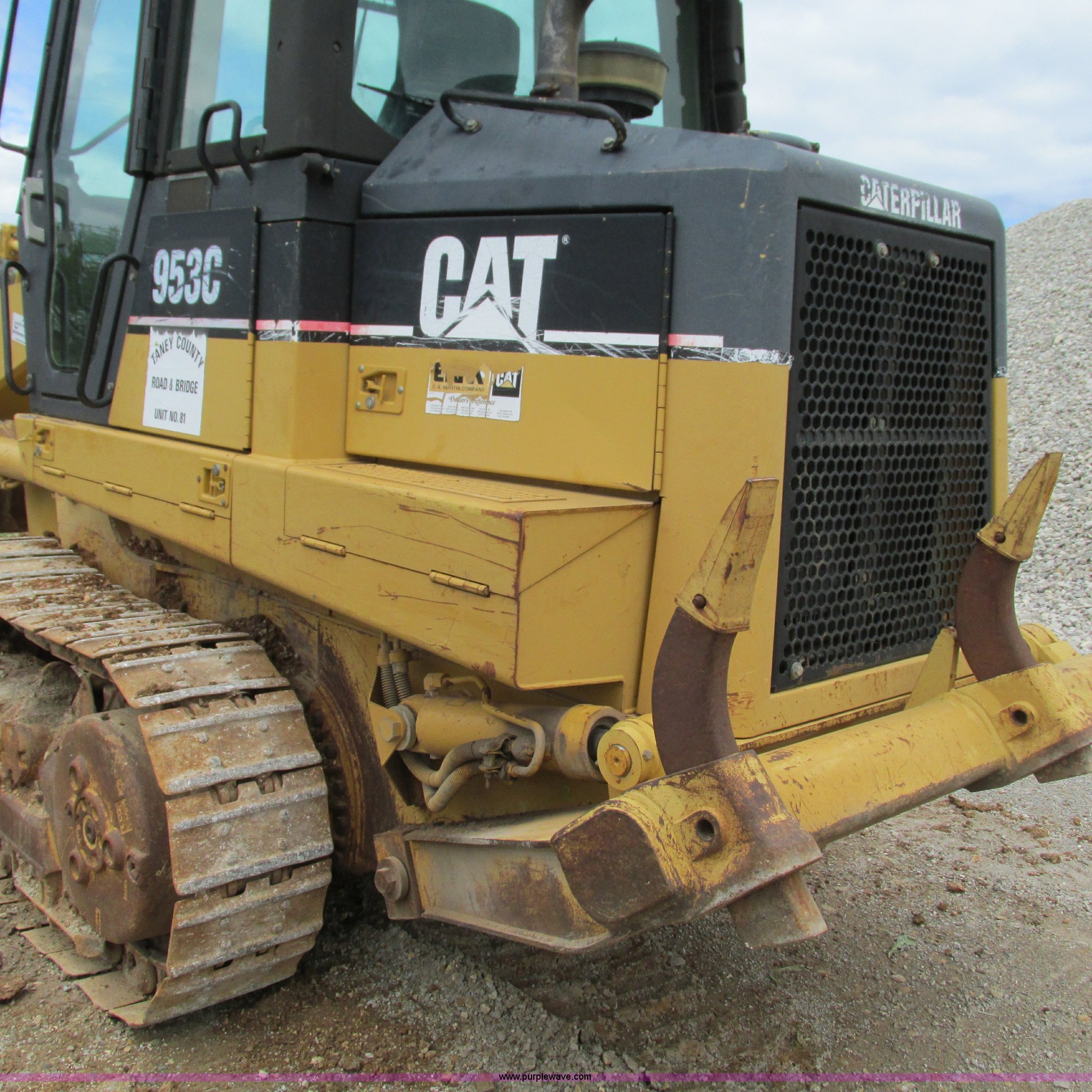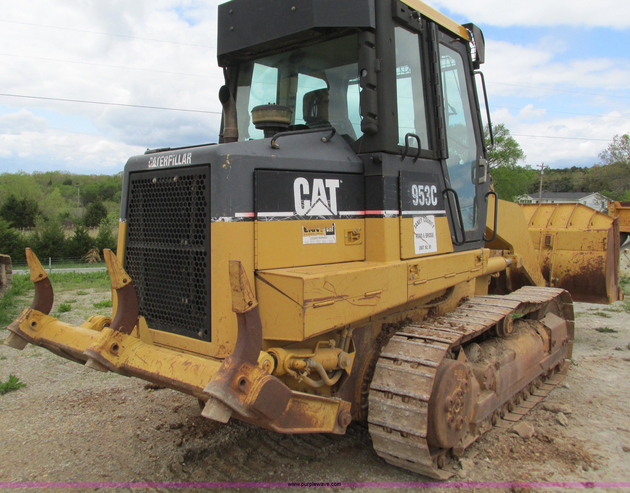 2000 Caterpillar 953C track loader. 4,641 hours on meter, Caterpillar 3116 six cylinder diesel engine, Hydrostatic two speed transmission, Cab, AC and heat Non-operational AC, AM/FM , Approximately 93"W bucket Eight tooth bolt-on cutting edge, Three shank ripper 8TH00738, 15" track pads, 33,389 lbs. base operating weight, One side protector missing, Two way radio is not included, Serial 2ZN03516. View equipment video. Taney County. 195 Gilbert Lane. Hilda, MO 65680