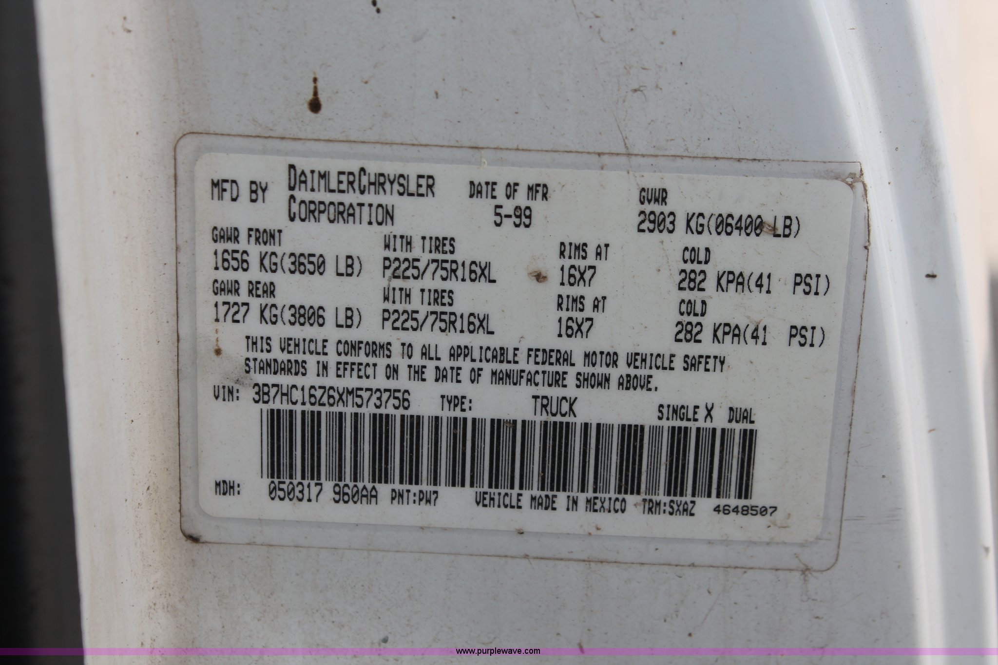 Purple Wave is selling a used 1/2 Ton Pickup or Van in Oklahoma. This item is a 1999 Dodge Ram 1500 pickup truck with the following: 100,422 miles on odometer, Actual Mileage Unknown, 5.9L V8 OHV 16V gas engine, Automatic transmission, AC and heat, Tilt, Cruise, Manual windows and locks, Vinyl interior, Long bed, LT225/75R16 tires, Undiagnosed engine issues, No battery, Non-operational