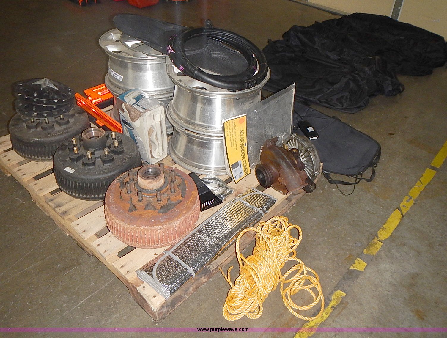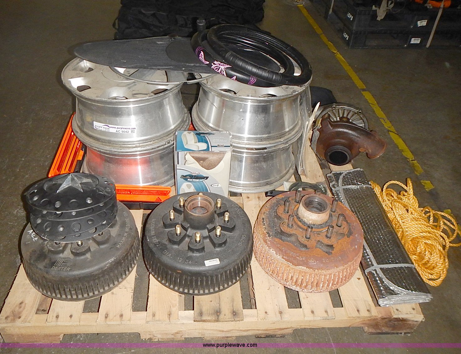 Purple Wave is selling a used Tools in Kansas. This item is a Assorted equipment with the following: (4) Cadillac 17" wheels, Emergency markers, Custom hub caps, (3) rotors, Seat cover, Rope, umbrella, ice scrapers, Turbo, Window visor, Tire chain tightner and chains for passenger vehicle, (6) XL duffel bags
