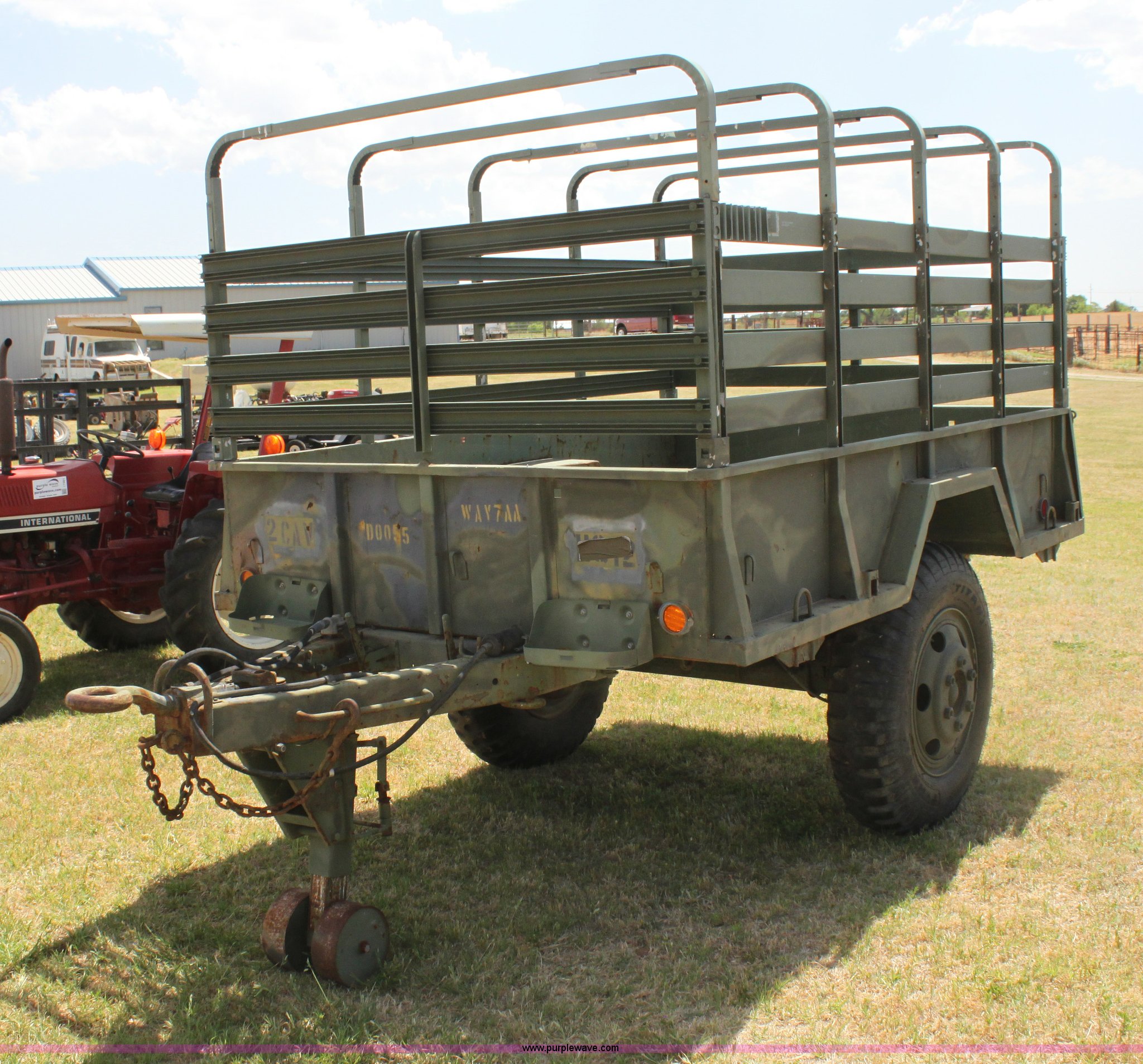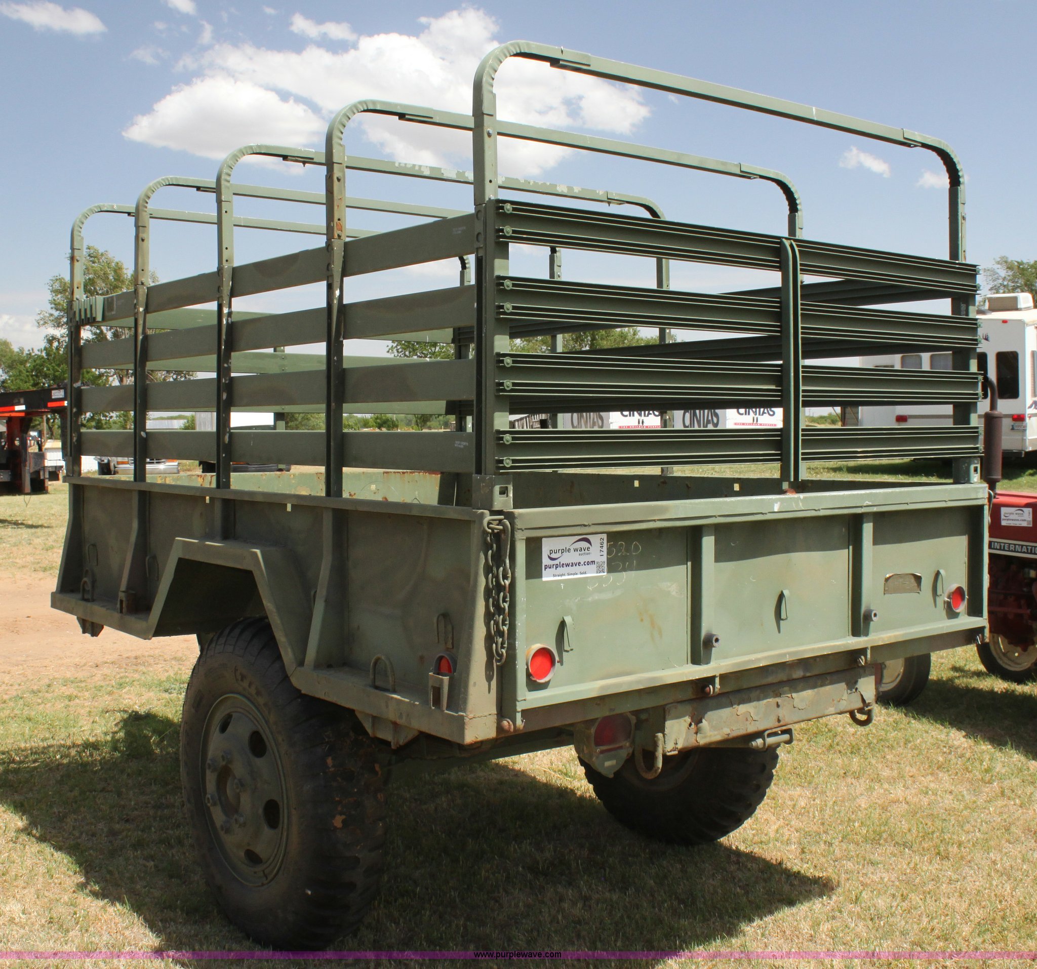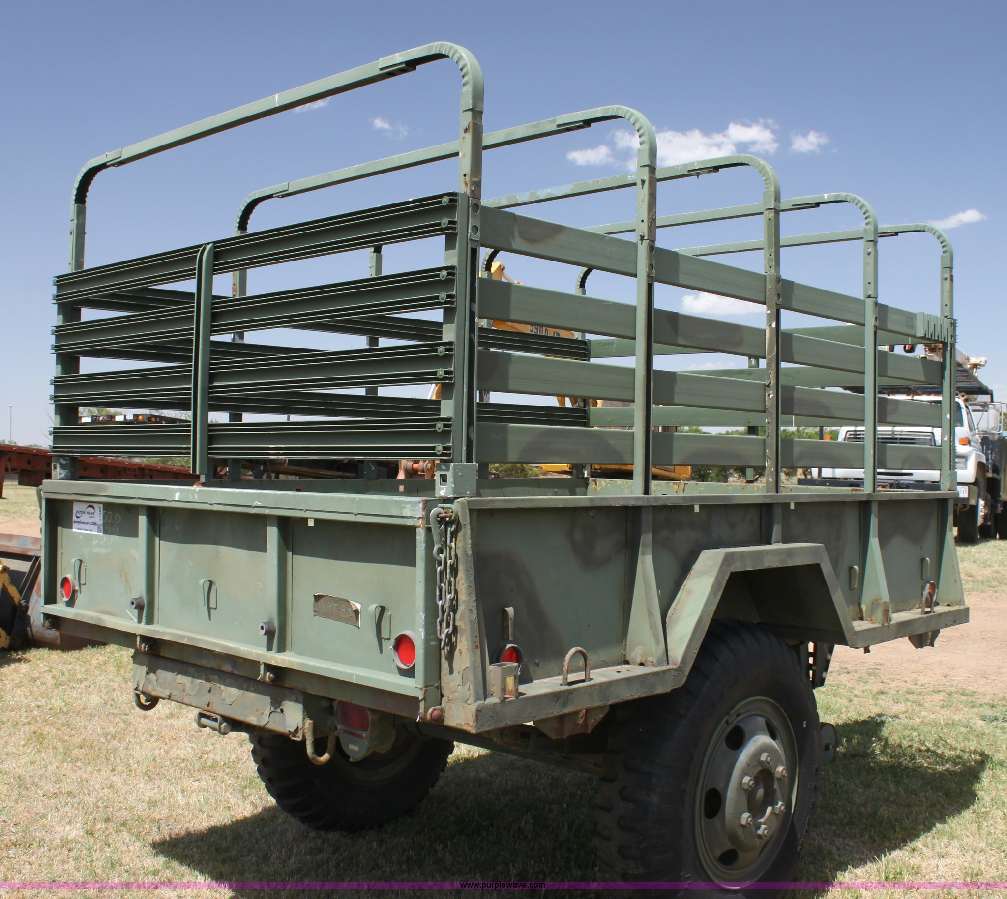 Purple Wave is selling a used Trailer Other in Oklahoma. This item is a Military pintle hitch trailer with the following: 6' x 9', Stake pocket bed rails, Air brakes, 9.00-20 tires