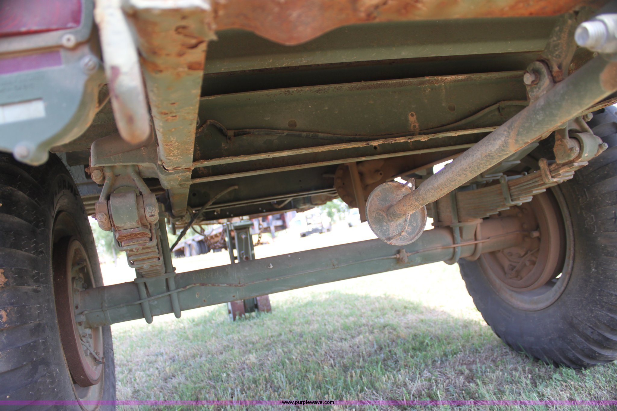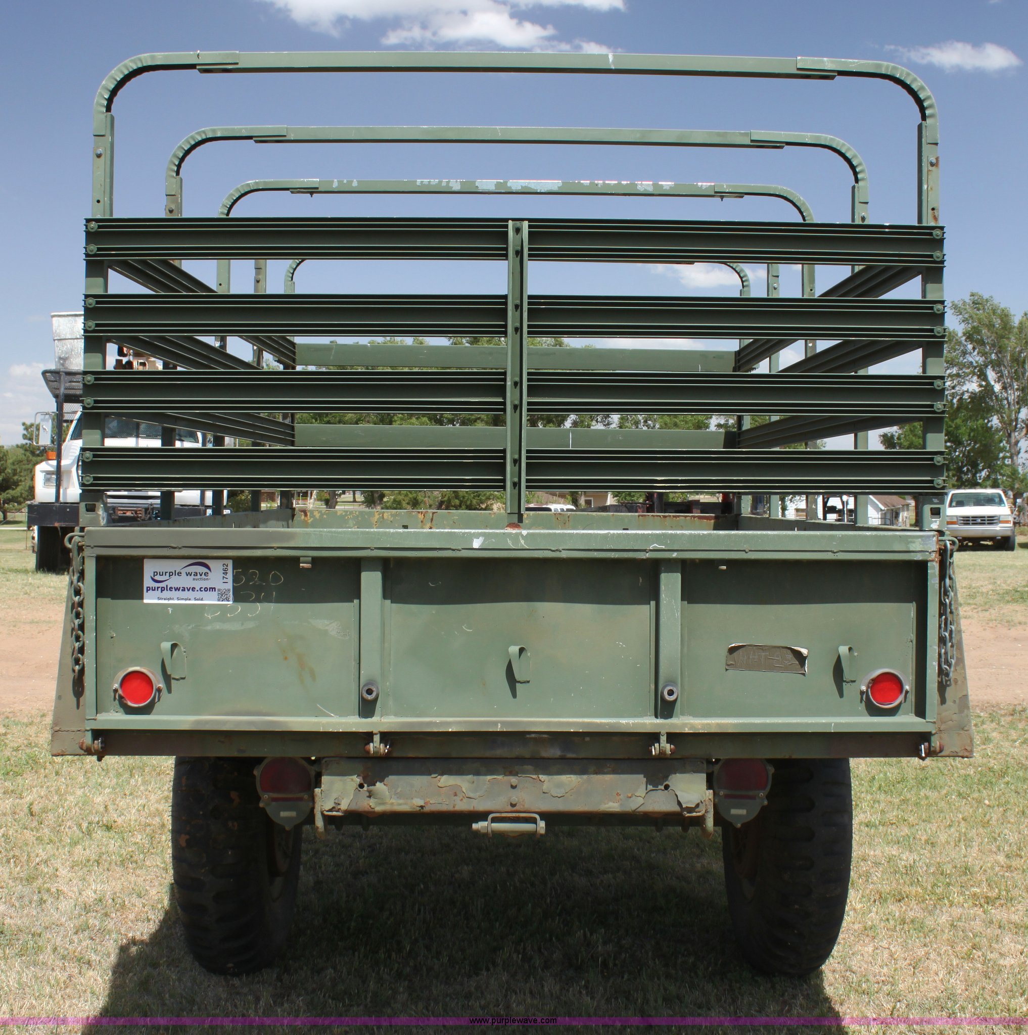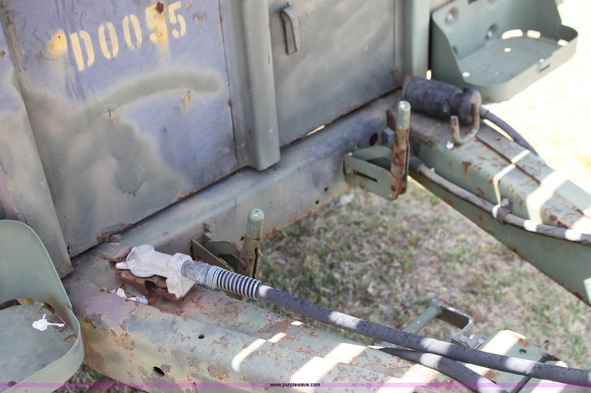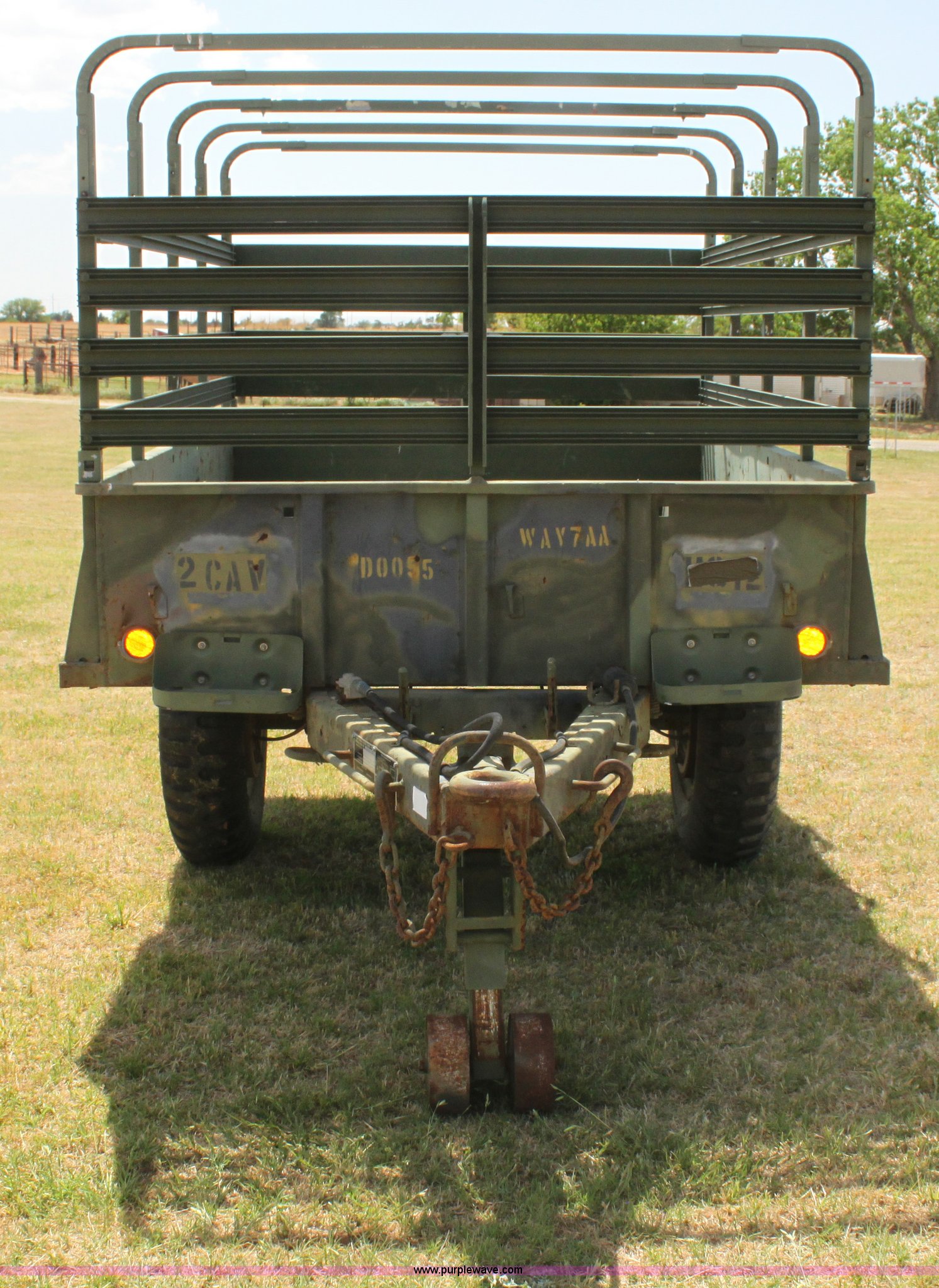 Purple Wave is selling a used Trailer Other in Oklahoma. This item is a Military pintle hitch trailer with the following: 6' x 9', Stake pocket bed rails, Air brakes, 9.00-20 tires