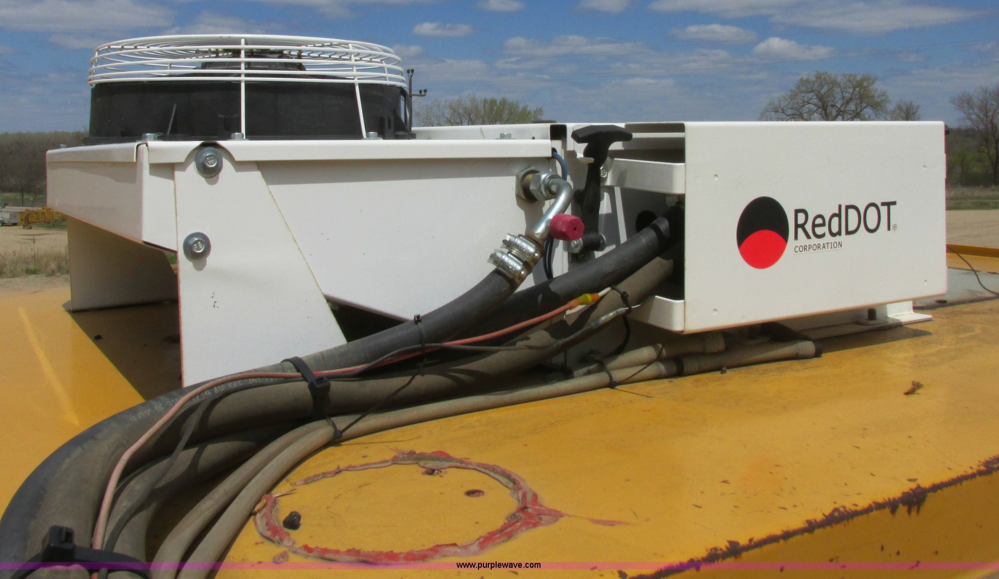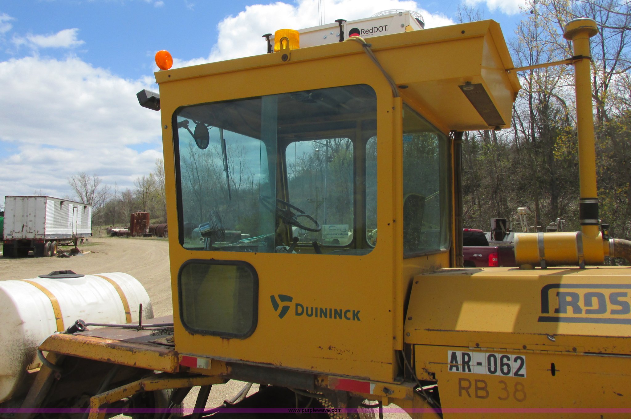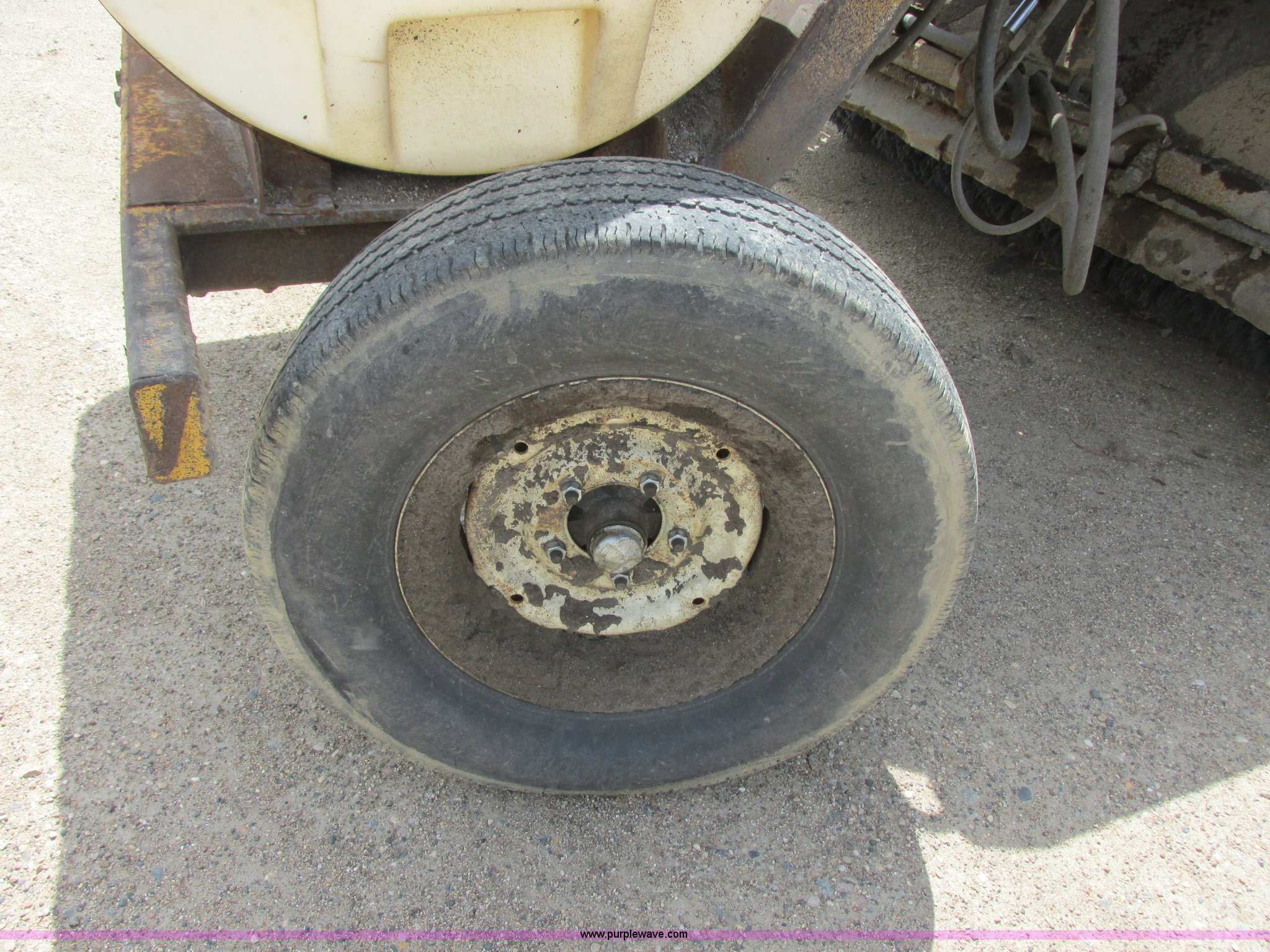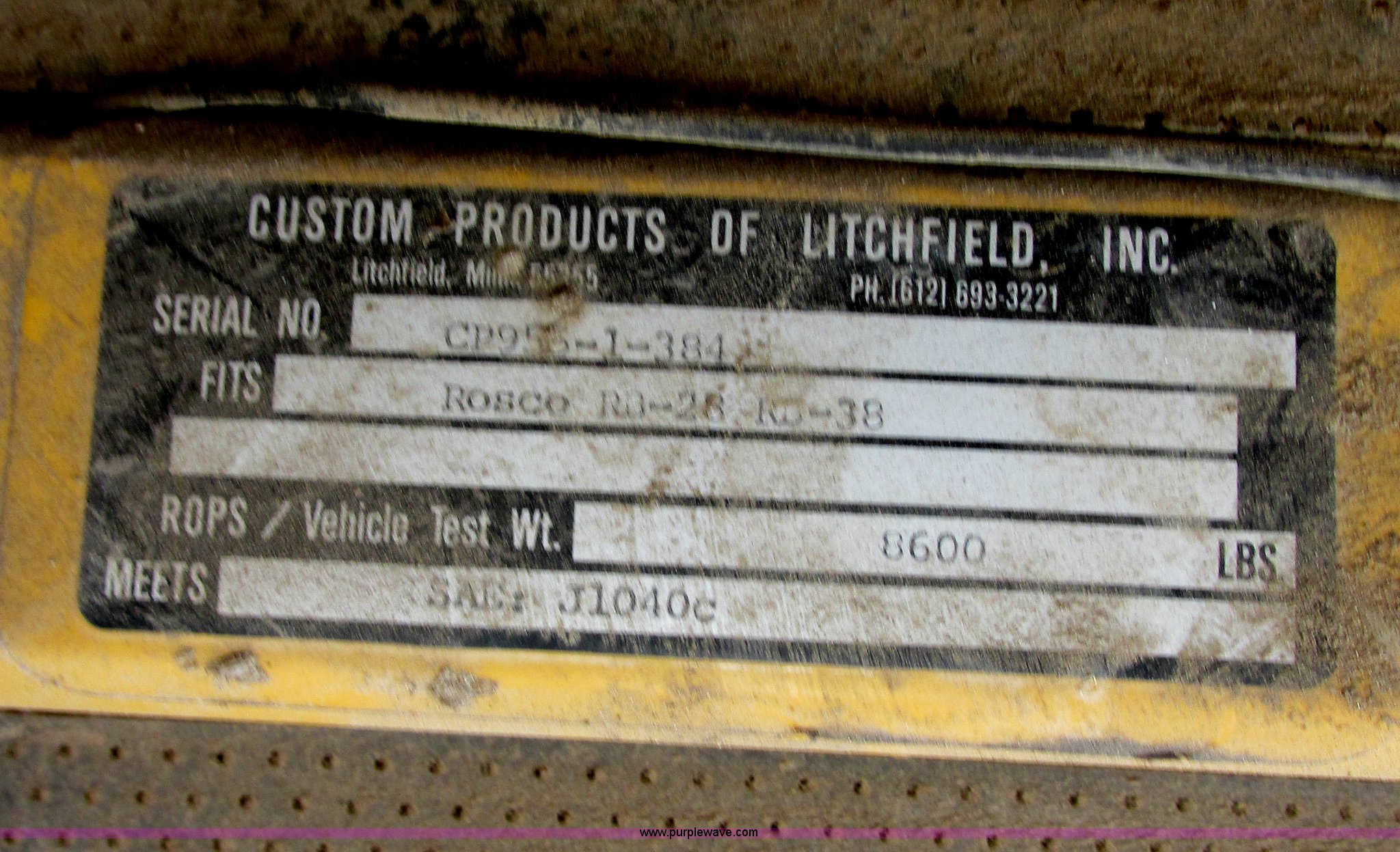 Rosco RB38 broom. 3,395 hours on meter, Cummins 3.9C four cylinder diesel engine 80 HP, Hi-Lo direct drive transmission, EROPS Red Dot R9757-0, Serial CP956-1-384, 12V, Front work lights, Road lights, 92"W broom, Water spray, Hydraulic lift, tilt, and angle, 150 gallon water tank, Jabsco electric water tank, P235/75R15 tires, Serial 32707. Duininck Inc.. 408 6th Street. Prinsburg, MN 56281