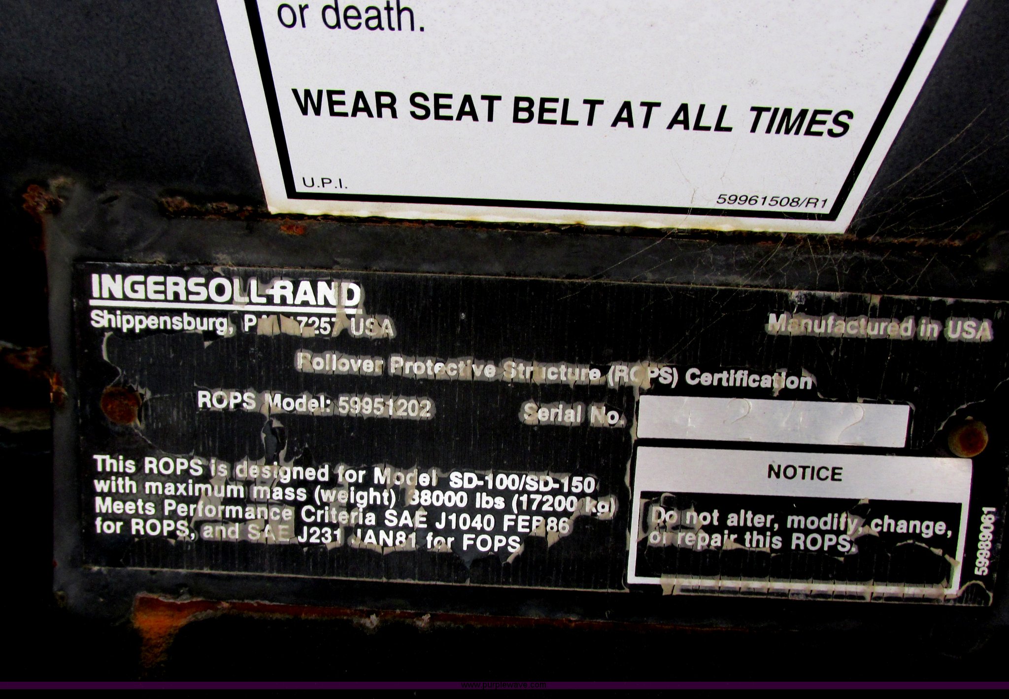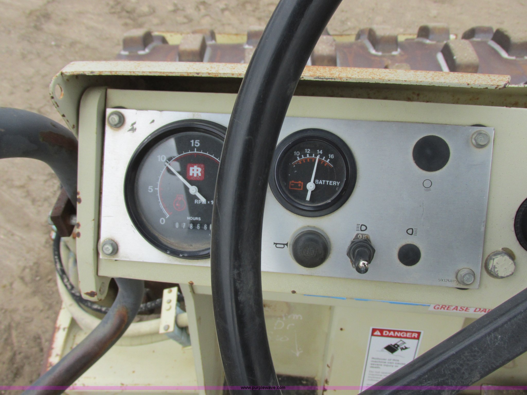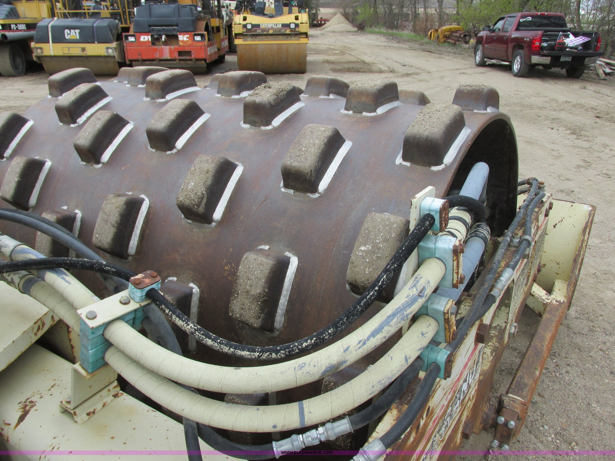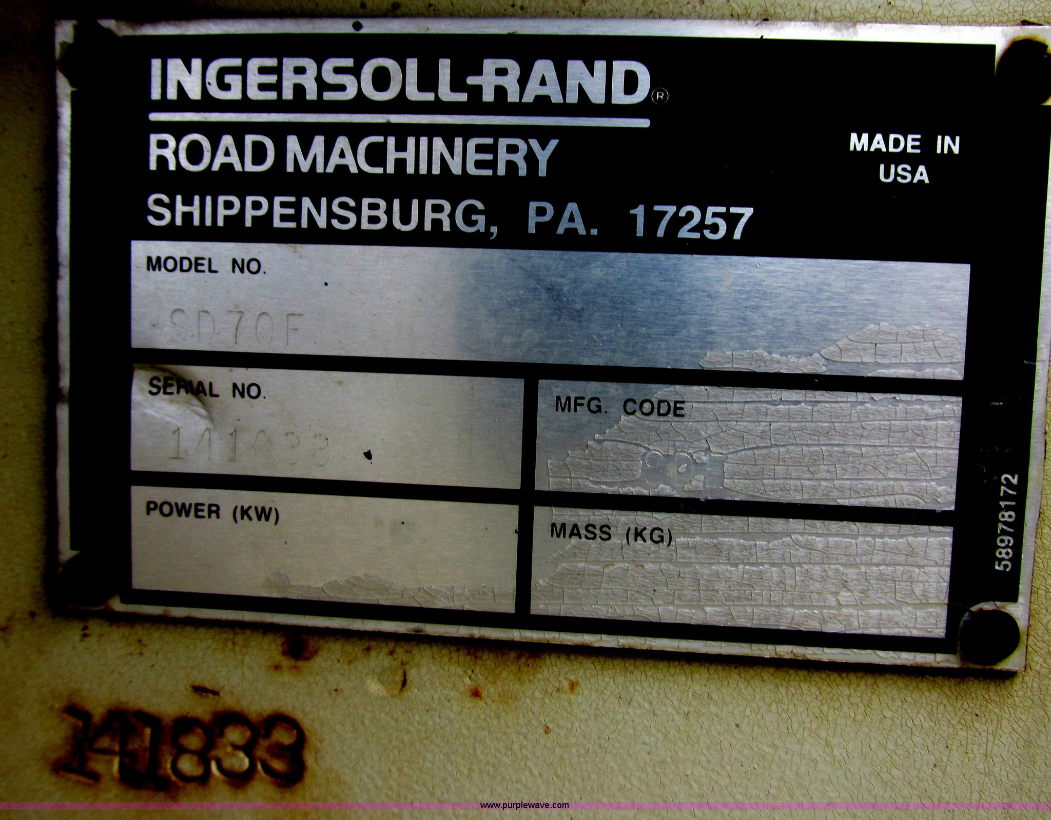 Purple Wave is selling a used Single Drum Roller Compactor in Minnesota. This item is a 1995 Ingersoll Rand SD-70F vibratory padfoot compactor with the following: 7,866 hours on meter, Cummins S4-3 four cylinder diesel engine, Serial 3904570-12, ROPS, 66"W x 48" diameter sheep foot compactor, Pad/drum cleaners, 84" front push blade, Hydraulic lift, Bolt-on cutting edge, Back up alarm, Strobe light, Vibration control, Rear pin hitch, 14.9-24 tires, Interior/exterior cosmetic damage, Serial 141833, Unit# RF0034