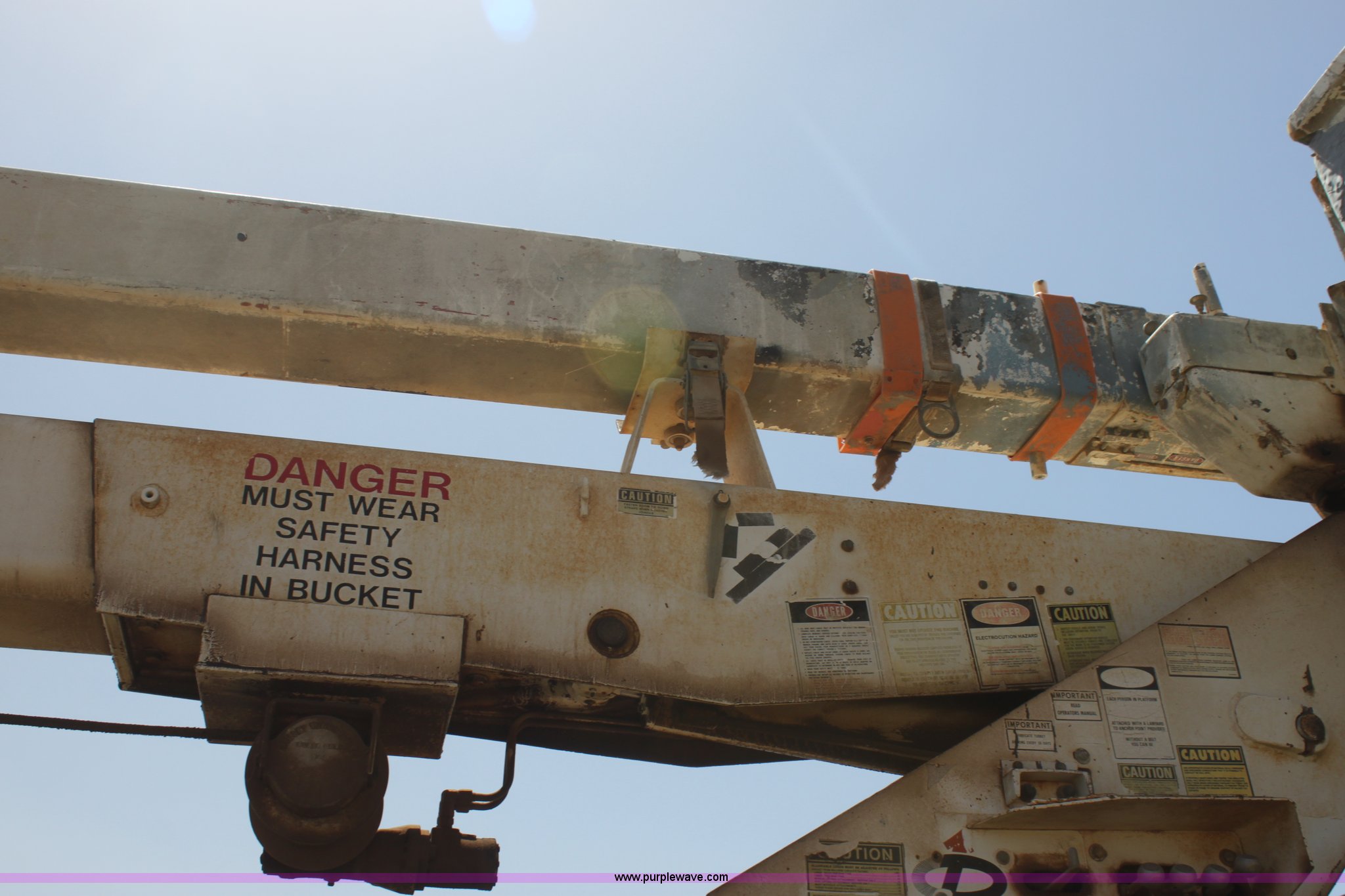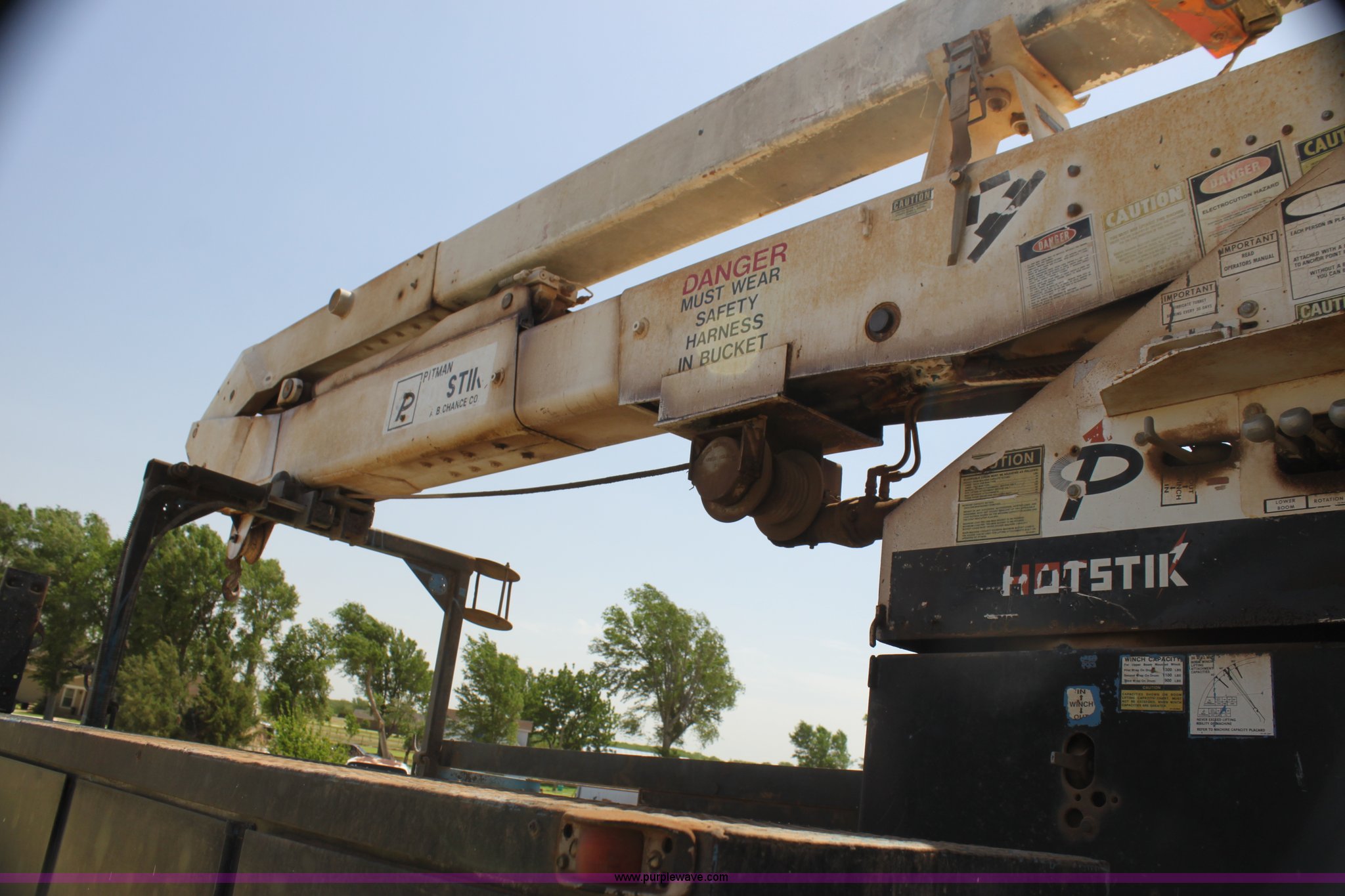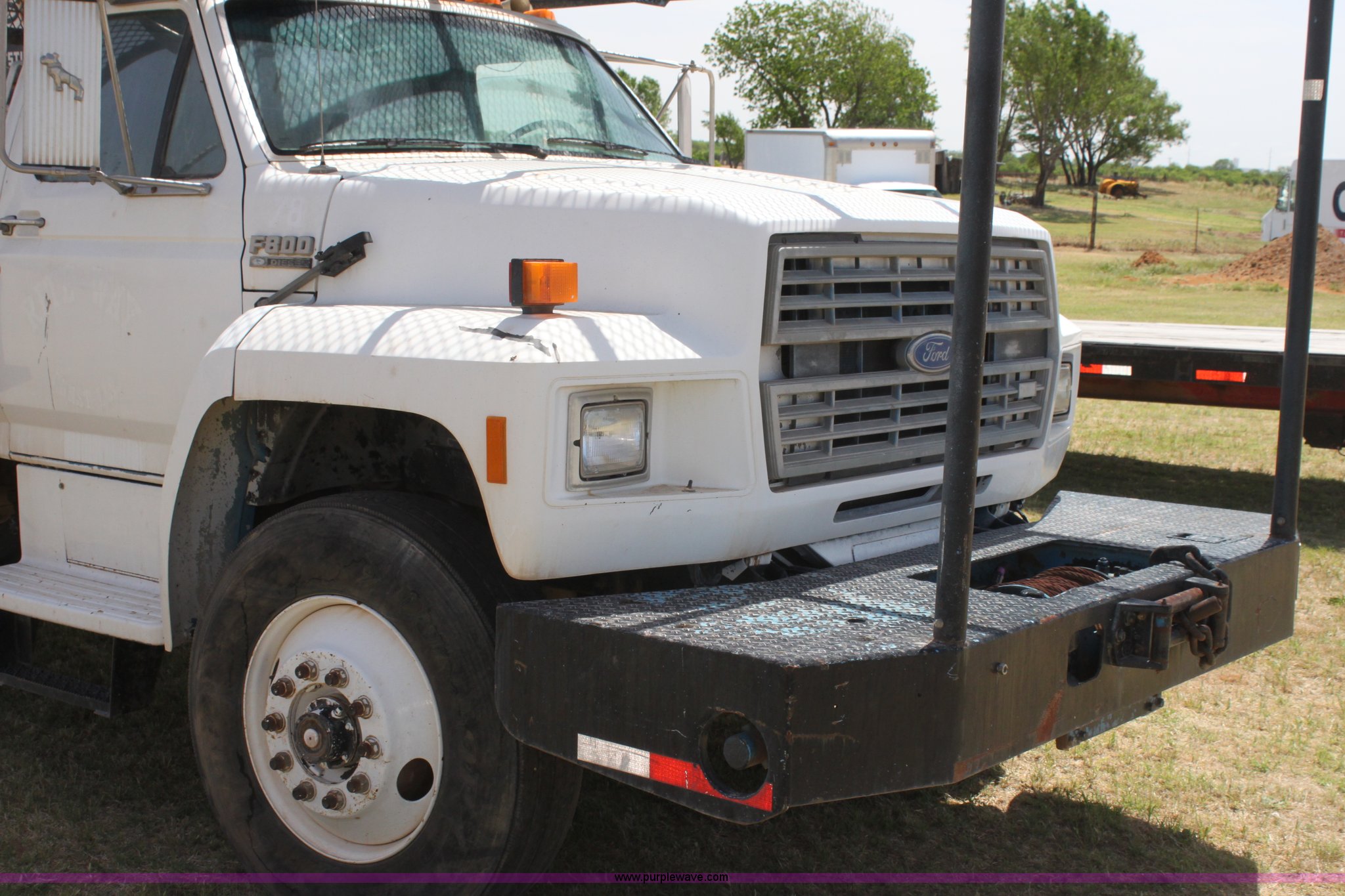 Purple Wave is selling a used Bucket Truck in Oklahoma. This item is a 1992 Ford F800 bucket truck with the following: 3,256 engine hours on meter, 2,823 PTO hours on meter, 7.8L six cylinder diesel engine, Automatic transmission, Heat, AM/FM, Pitman Hot Stick 45' bucket boom, Hydraulic boom winch, Pintle hitch, Spring suspension, Air brakes, 295/75R22.5 tires, Hydraulic leaks