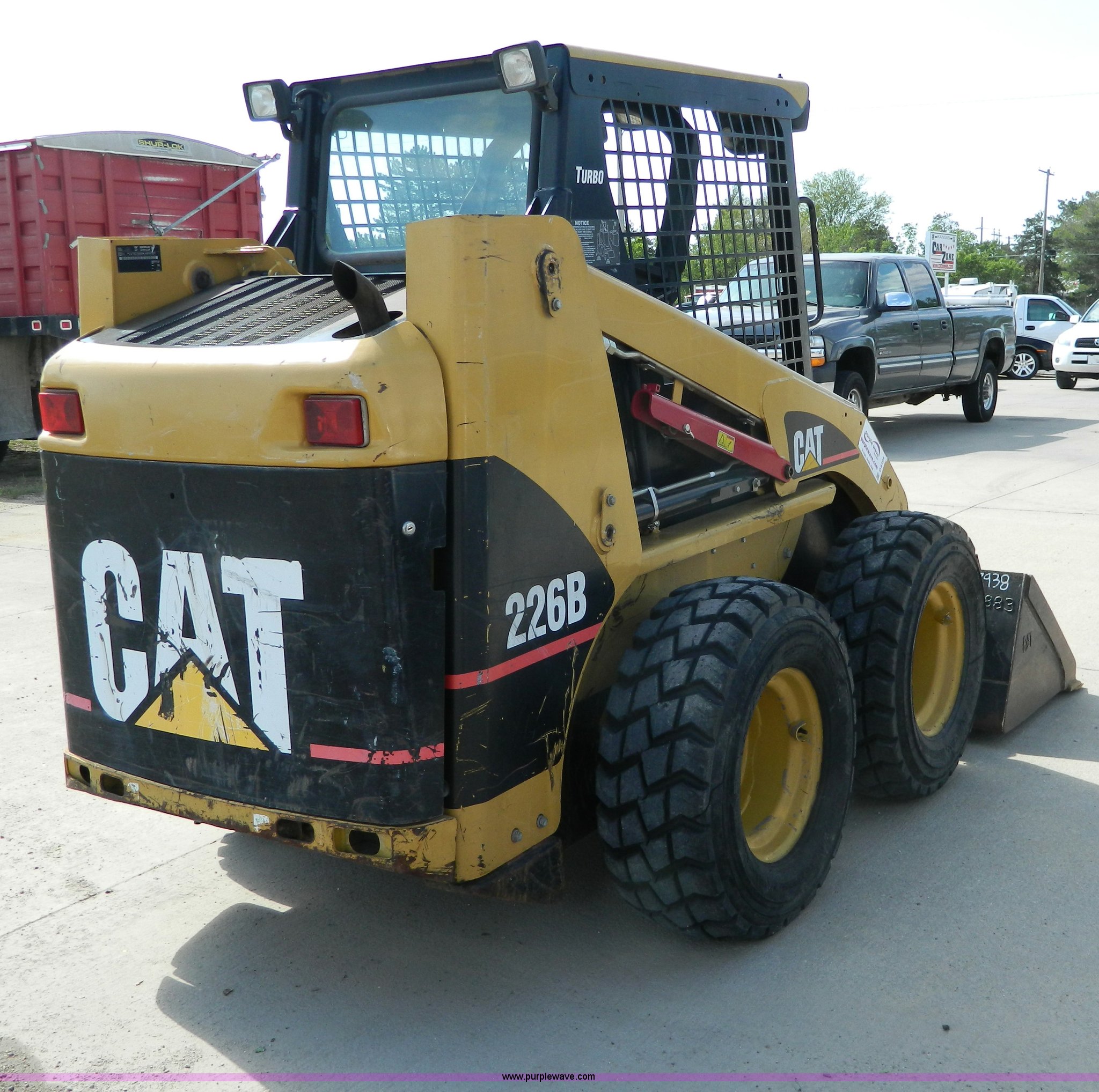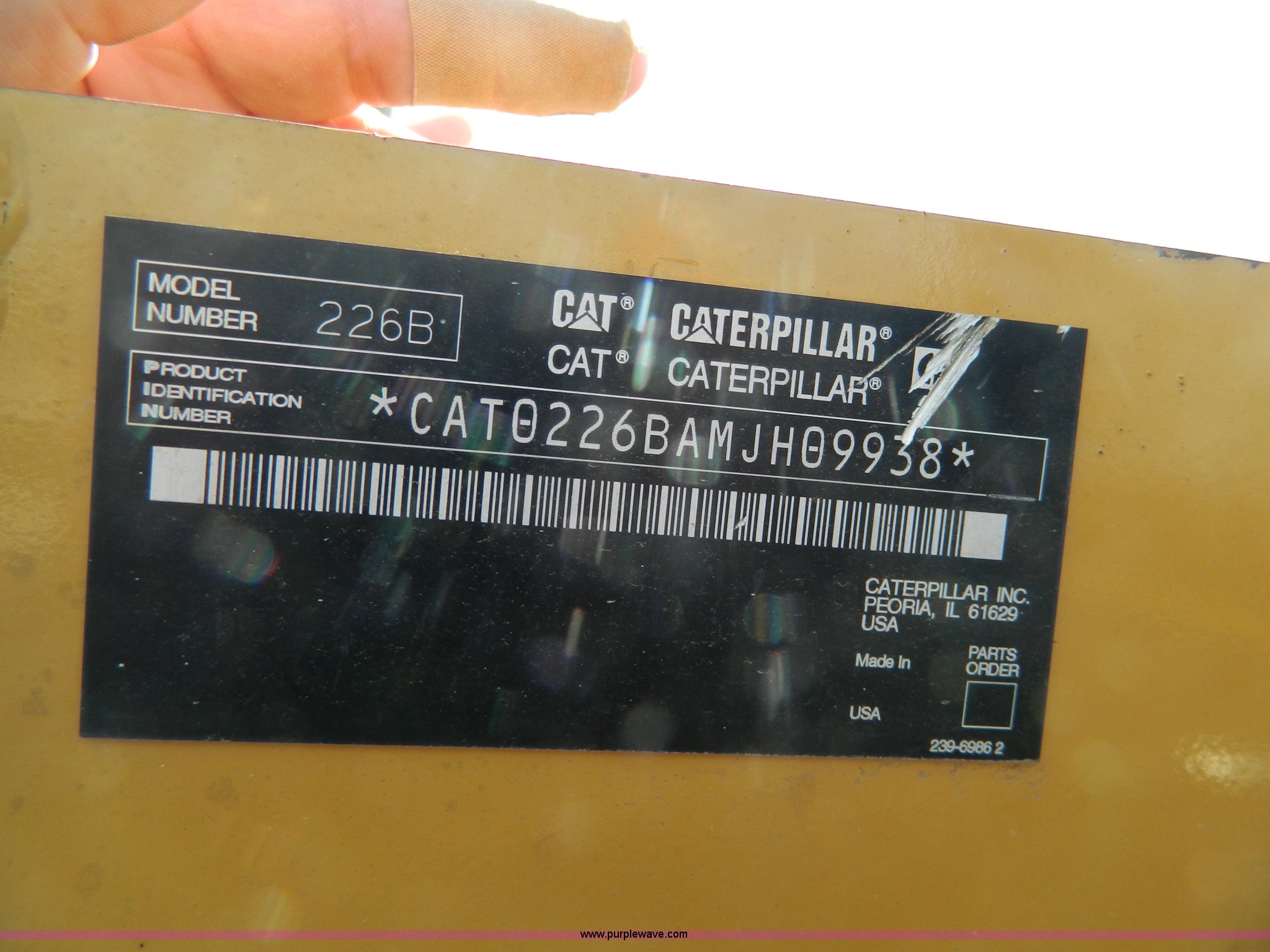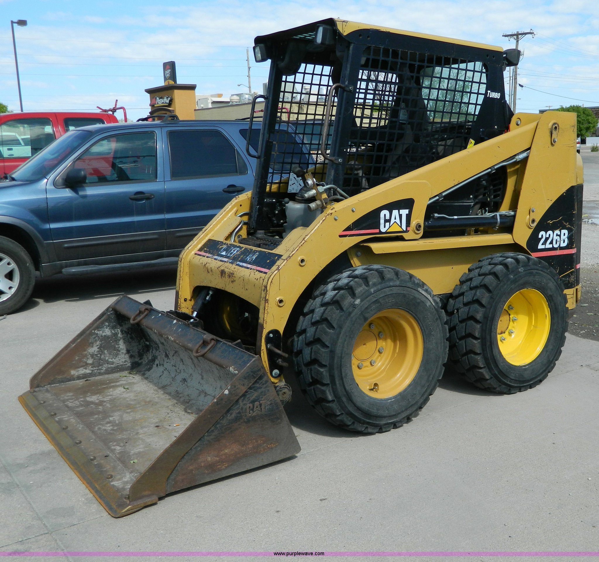 Purple Wave is selling a used Skid Steer Loader in Kansas. This item is a 2008 Caterpillar 226B skid steer with the following: 1,574 hours on meter, Caterpillar 3024CT four cylinder turbo diesel engine, 61 HP, Serial GGA31051, Hydrostatic transmission, Back glass, Joystick controls, Spring suspension seat, Bucket with bolt-on cutting edge, Manual quick coupler, Auxiliary hydraulics, Auxiliary electrical outlet, Front and rear work lights, 12-16.5 Xtra-wall tires, 1,500 lbs operating load, 5,833 lbs. base operating weight, Serial CAT0226BAMJH09938