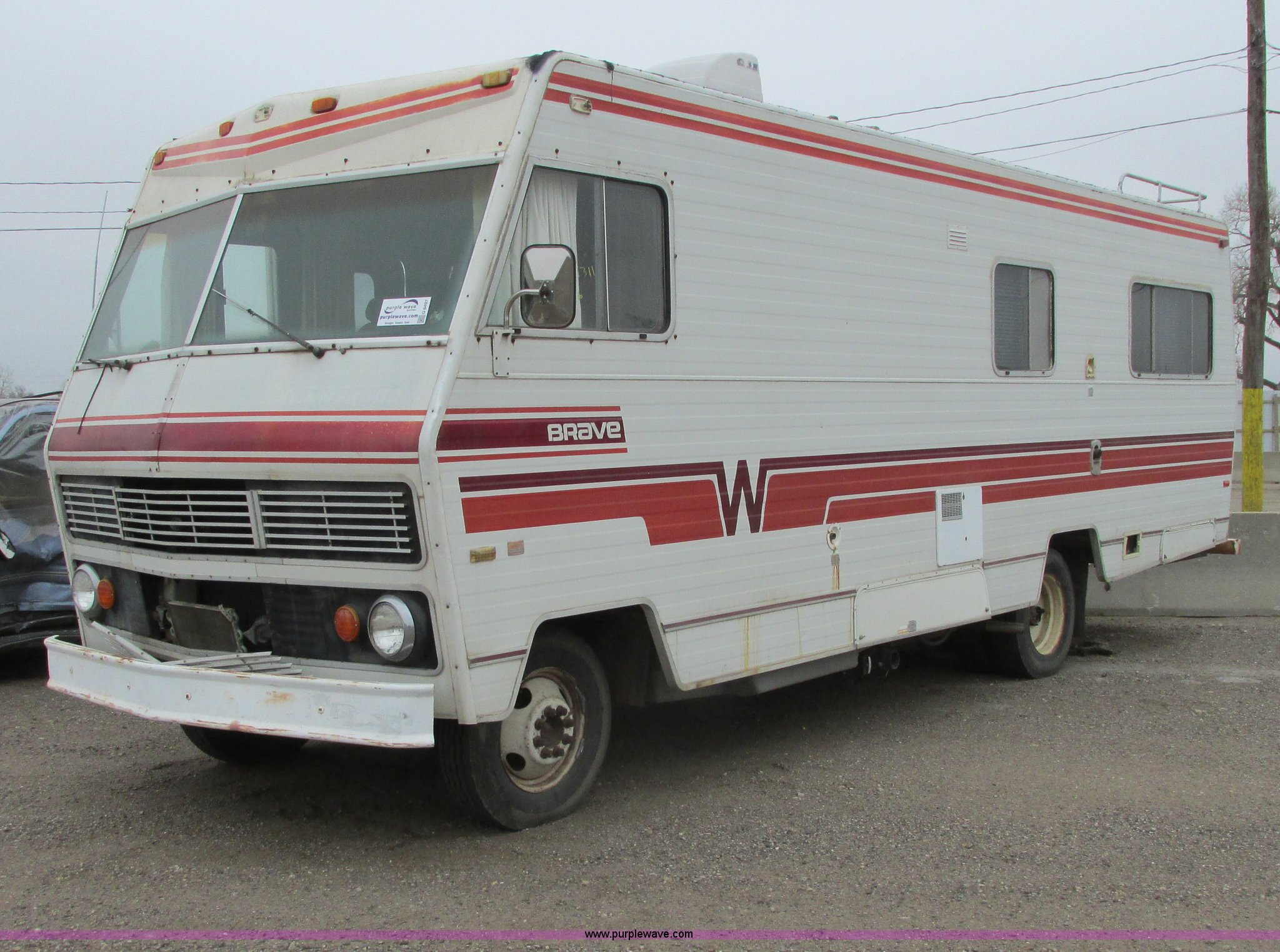 Purple Wave is selling a used Wrecked and Abandoned in Kansas. This item is a 1978 Winnebago Brave RV with the following: 65,248 miles on odometer, Gas engine, Automatic transmission, AC, AM/FM/cassette, Manual windows and locks, Cloth interior, Approximately 23'11"L, Awning, LP tank, Onan 4 generator, Roof top AC, Stove, Sink, Table, Shower, Bathroom, 8R17.5 tires, Grill damaged, Drive shaft disconnected, Dash split and cracked, Ceiling has water damaged, Engine may be missing components, Rear ladder broken, Interior/exterior cosmetic damage, Case# 14C010527