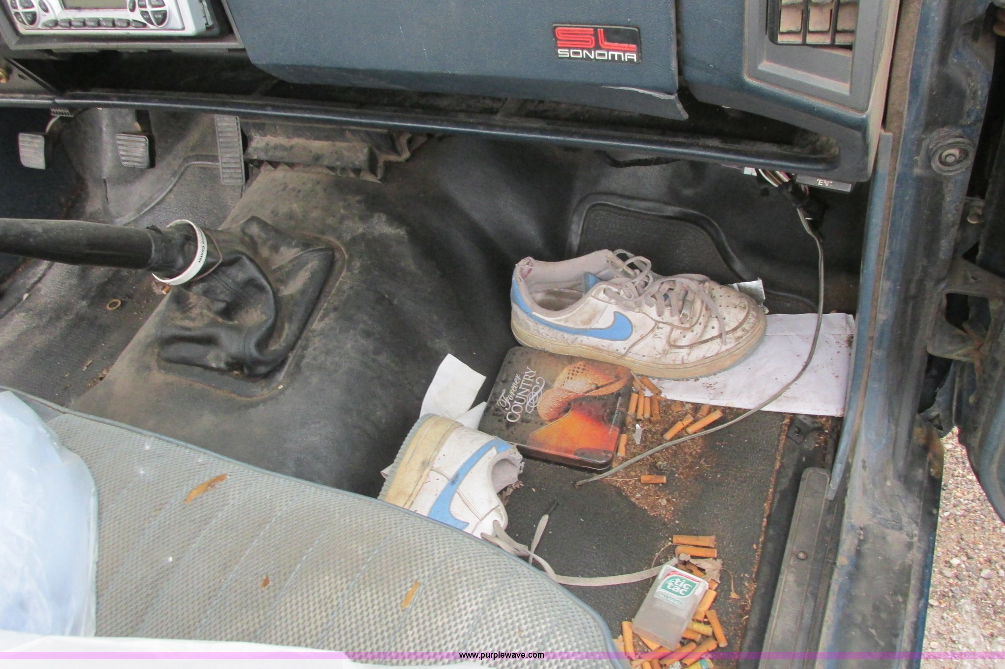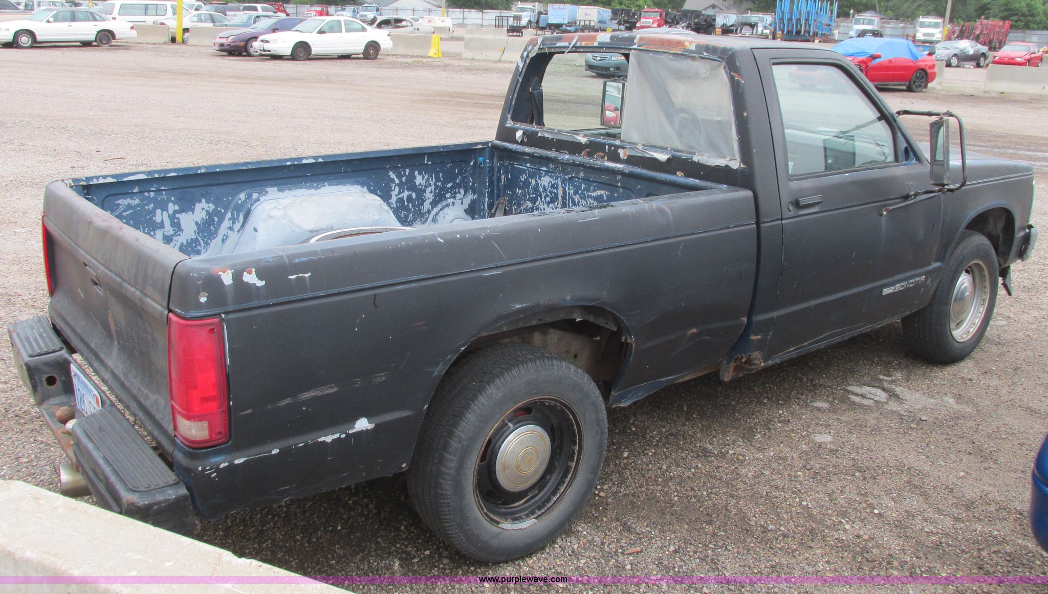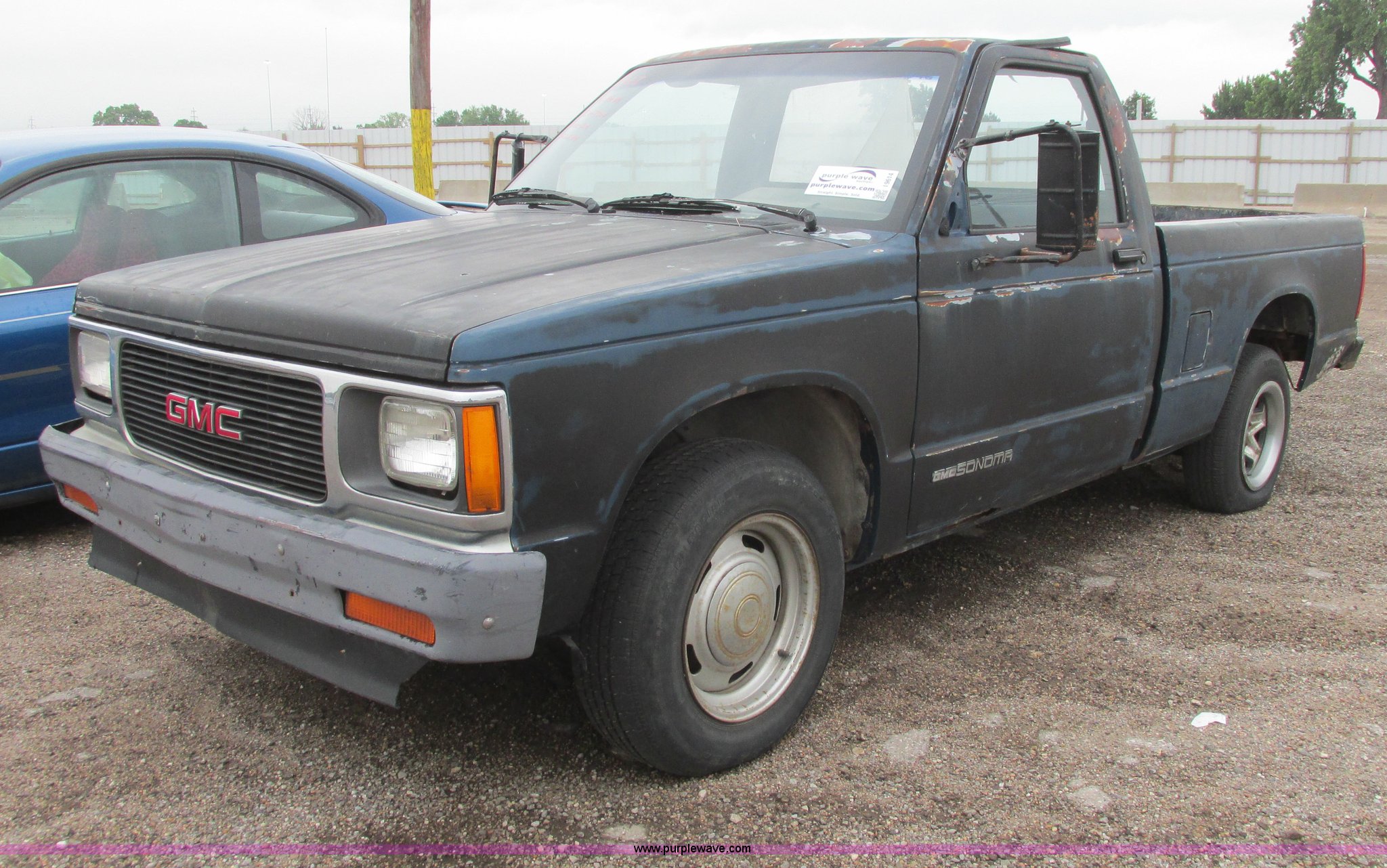 Purple Wave is selling a used Wrecked and Abandoned in Kansas. This item is a 1991 GMC Sonoma pickup truck with the following: 186,611 miles on odometer, 2.5L L4 OHV 8V gas engine, Five speed manual transmission, Heat, Aftermarket AM/FM/CD, Manual windows and locks, Vinyl interior, Aftermarket exhaust pipe, 205/75R15 front tires, P235/60R15 rear tire, P185/75R15 rear tire, Key, Rust, Roof damaged, Body damage, Rear window broken, Headliner missing, One tire flat, Right door handle inoperable, AC compressor missing, Weather damaged interior, Interior/exterior cosmetic damage, Case# 14C24019