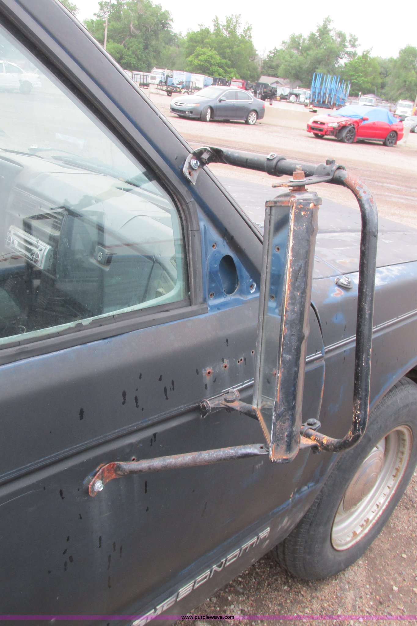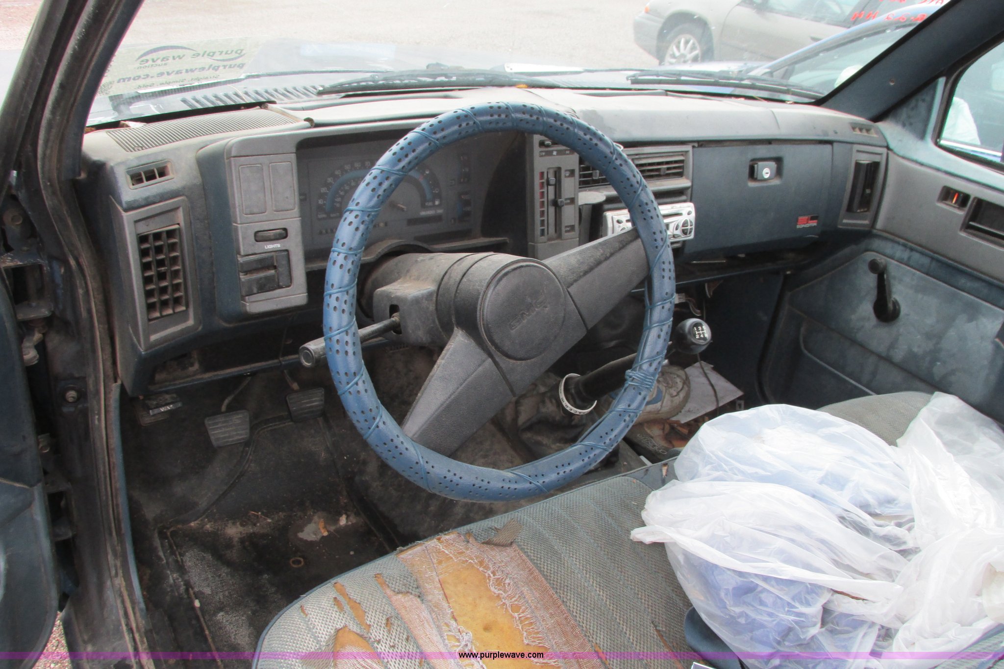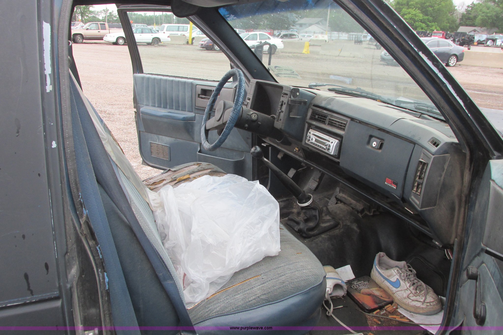 Purple Wave is selling a used Wrecked and Abandoned in Kansas. This item is a 1991 GMC Sonoma pickup truck with the following: 186,611 miles on odometer, 2.5L L4 OHV 8V gas engine, Five speed manual transmission, Heat, Aftermarket AM/FM/CD, Manual windows and locks, Vinyl interior, Aftermarket exhaust pipe, 205/75R15 front tires, P235/60R15 rear tire, P185/75R15 rear tire, Key, Rust, Roof damaged, Body damage, Rear window broken, Headliner missing, One tire flat, Right door handle inoperable, AC compressor missing, Weather damaged interior, Interior/exterior cosmetic damage, Case# 14C24019