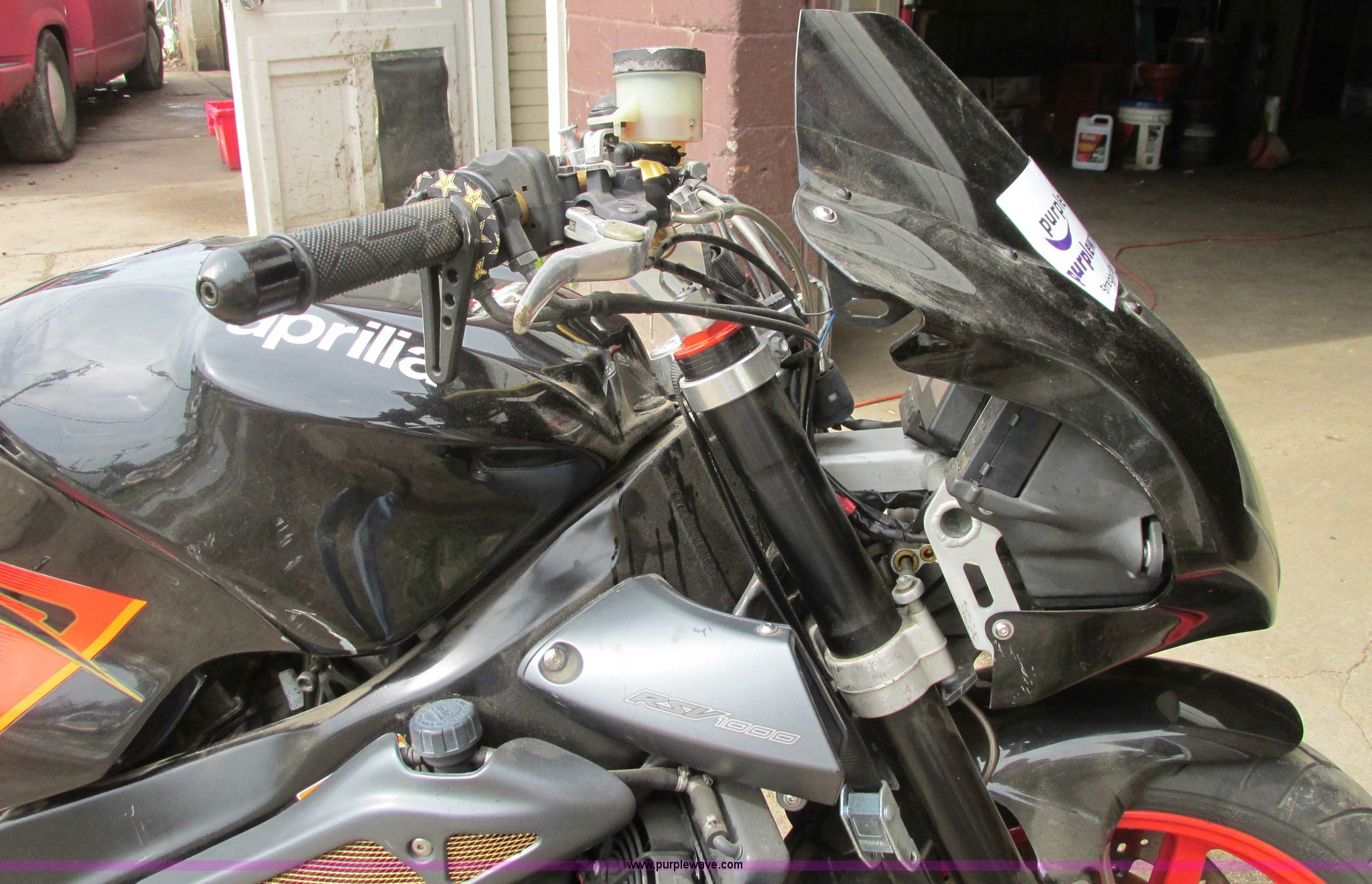 Purple Wave is selling a used Wrecked and Abandoned in Kansas. This item is a 2004 Aprilia Tuono RSV 1000 motorcycle with the following: Unknown Mileage, 120/70ZR17 MC 58W front tire, 180/55ZR17 MC 73W rear tire, Front fairing damage, Under carriage fairing damage, Clutch lever damaged, Brake lever damaged, Fuel tank scratched, Seat missing, Case# 14C24063