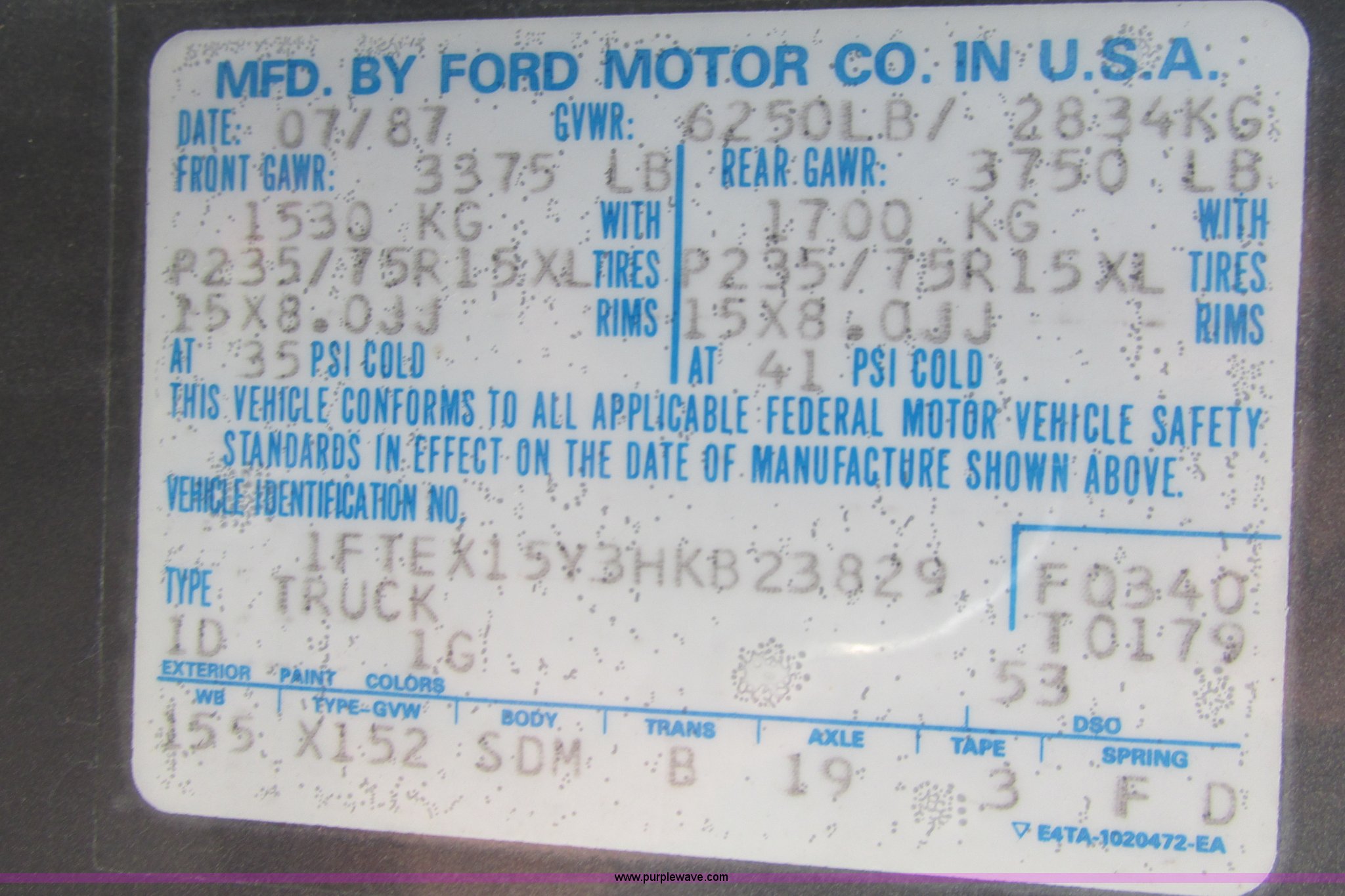 1987 Ford F150 SuperCab pickup truck. 895 miles on odometer Not Actual Mileage, 4.9L L6 OHV 12V gas engine, Four speed manual transmission, AC and heat, Power windows and locks, Cloth interior, Steering wheel cruise control, Slide-in bed liner, Bumper hitch, P255/70R15 tires front tires, LT235/75R15 rear tire, P235/75R15 rear tire, Interior/exterior cosmetic damage, Rust, Paint faded and peeling, Windshield cracked, Right front fender damaged, Truck bed damaged, SuperCab damaged, Driver's window broken, Headliner damaged, Hole in driver's seat, Ignition switch and steering column damaged, Case# 14C21818. Vehicle is abandoned. No additional information is available. Vehicle does not have keys unless notated otherwise in the item listing.. View City Of Wichita Terms for title acquisition and item removal requirements.. 1FTEX15Y3HKB23829. Ken's Auto Tow. 3730 South Broadway. Wichita, KS 67216
