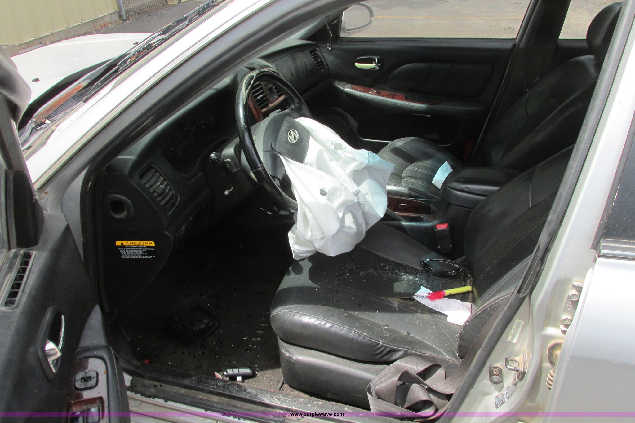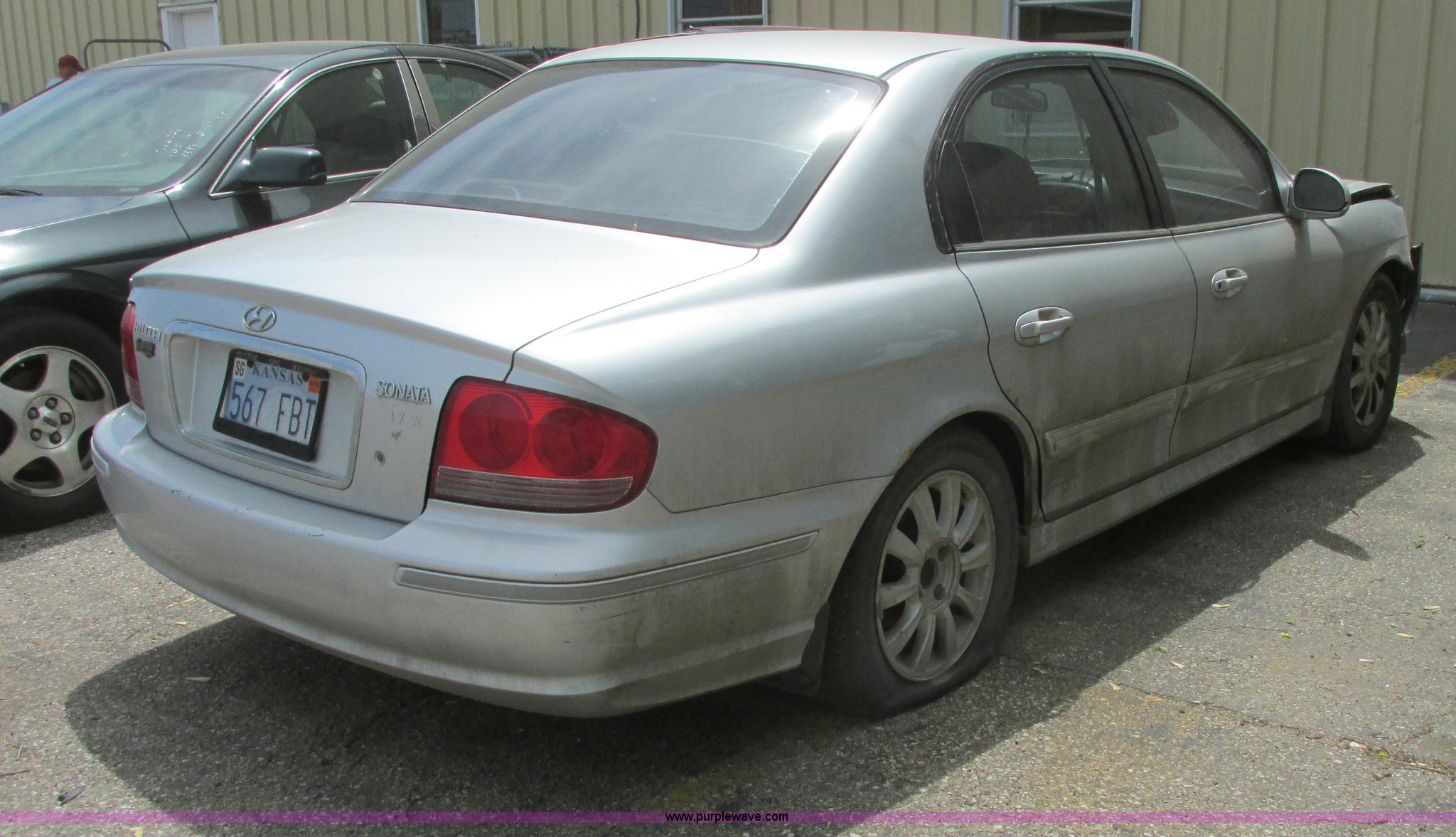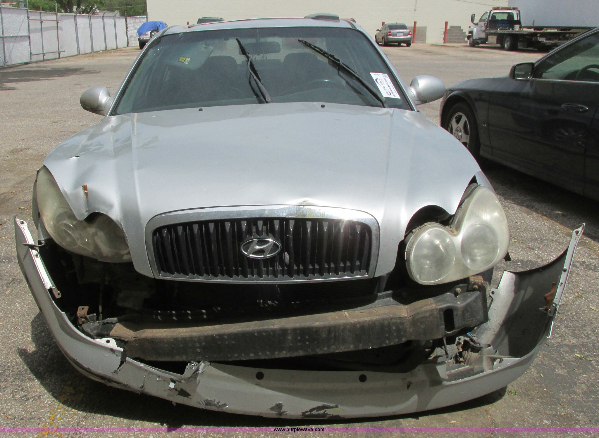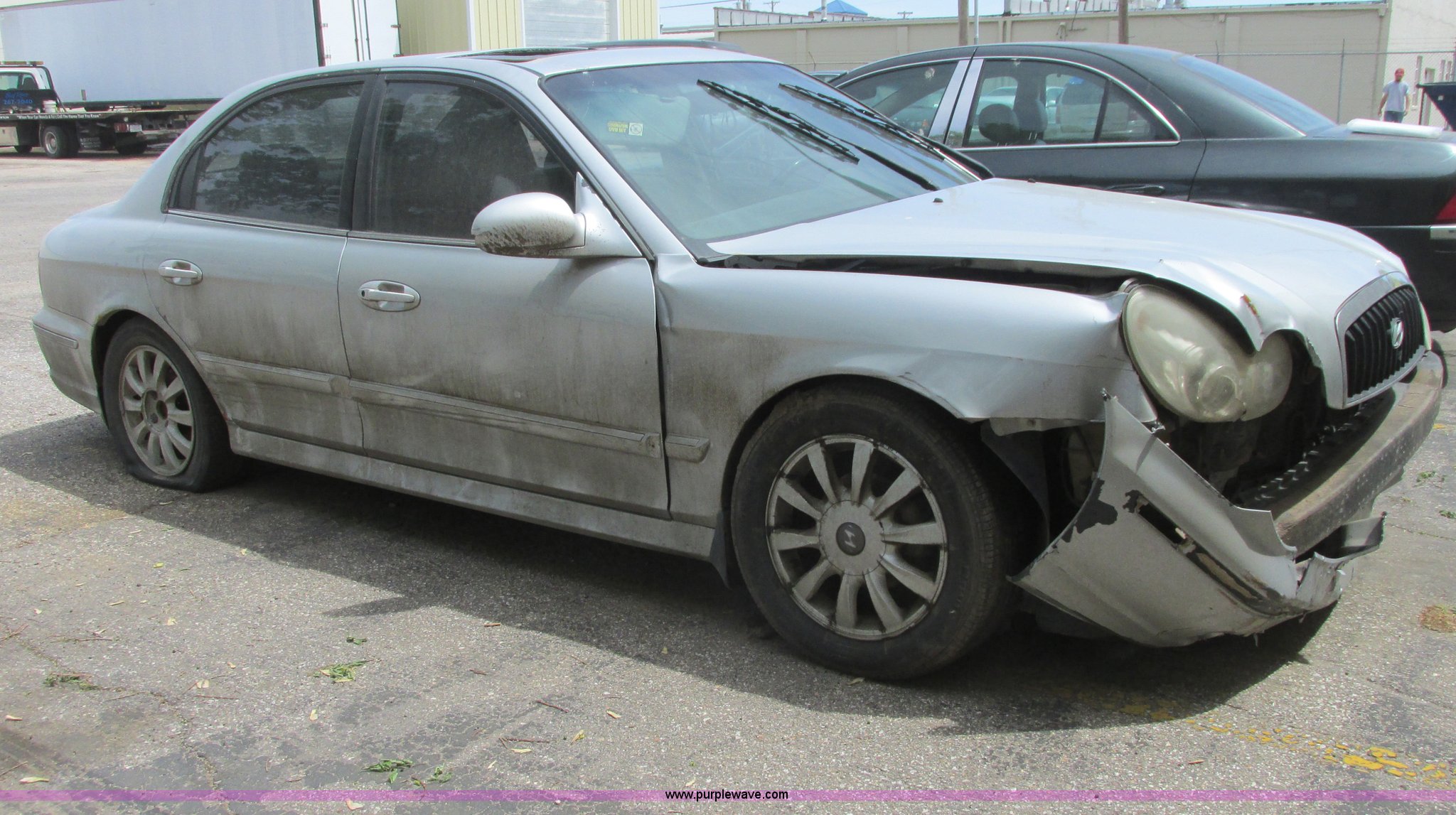 Purple Wave is selling a used Wrecked and Abandoned in Kansas. This item is a 2002 Hyundai Sonata LX with the following: Unknown miles on odometer, 2.7L V6 DOHC 24V gas engine, Automatic transmission, AC and heat, Tilt, Cruise, AM/FM/CD/cassette, Power windows, locks, and mirrors, Leather interior, Sunroof, Glass broken, 205/60R16 tires, Major front end collision damage, Roof damaged, Windshield broken, Air bags deployed, Rust, Right rear tire flat, Case# 14C11139
