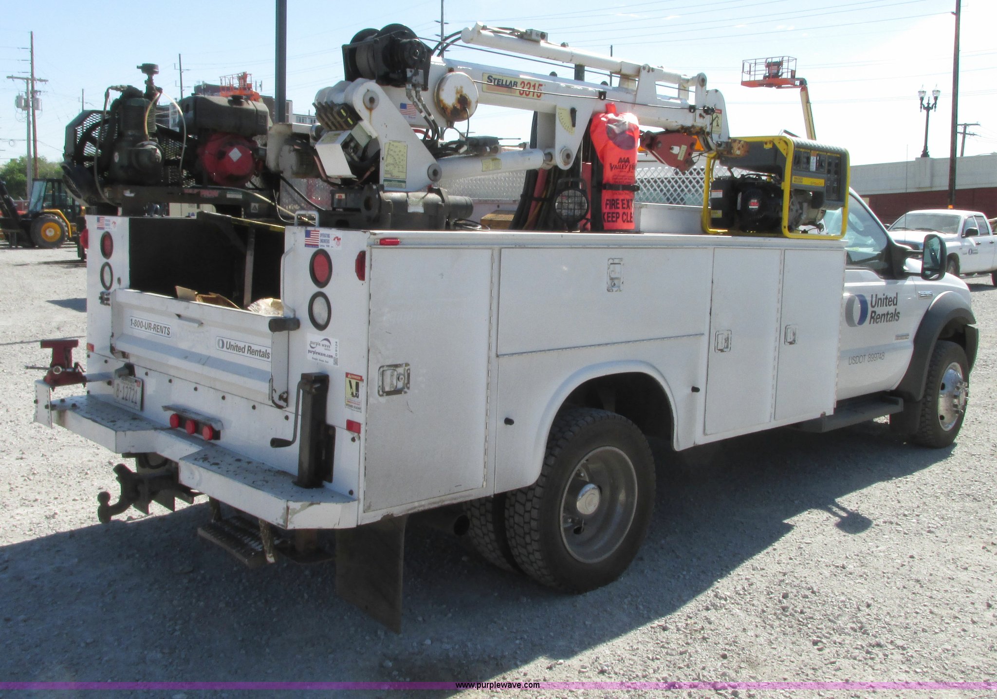 Purple Wave is selling a used Service Truck in Indiana. This item is a 2006 Ford F550 service truck with crane with the following: 139,243 miles on odometer, 6.0L V8 OHV 32V turbo diesel engine, Automatic transmission, Four wheel drive, AC and heat, Tilt, Cruise, AM/FM/CD, Manual windows and locks, Vinyl interior, Knapheide 11' utility bed, 7'L x 54"W interior, (10) compartments, Lube box, (2) 20 gallon tanks, Strobe work lights, Heavy Duty step bumper, Champion air compressor, DeeZee diamond plate toolbox, Stellar 3315 crane lift, Serial ECW06457, Receiver hitch, Trailer wiring, 225/70R19.5 tires, Laptop is not included, Generator mounted on front passenger bed side is not included, Contents in bed not included, EIN 641448RA