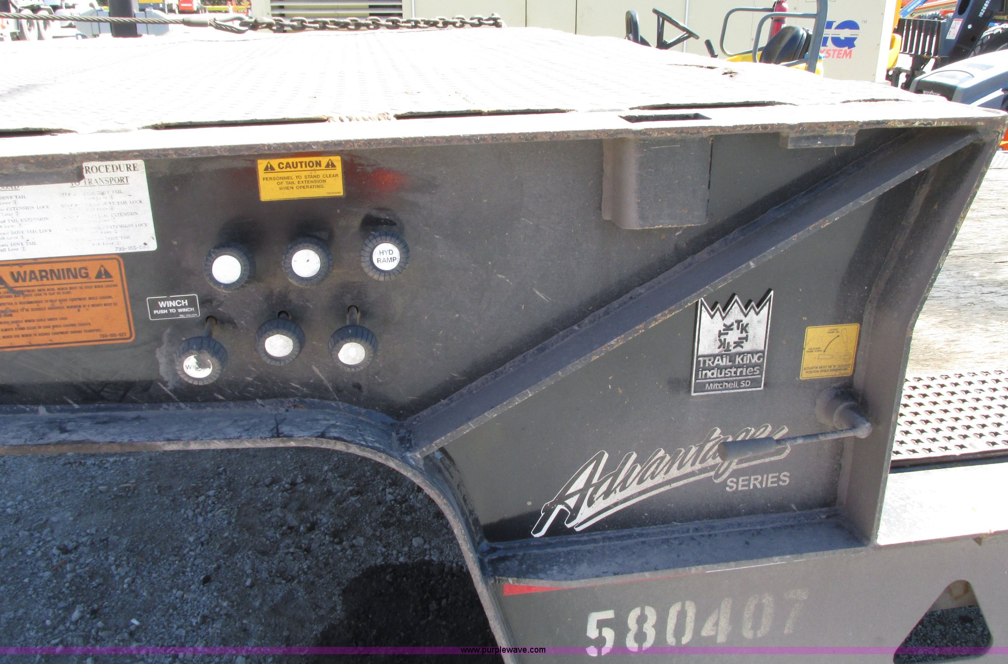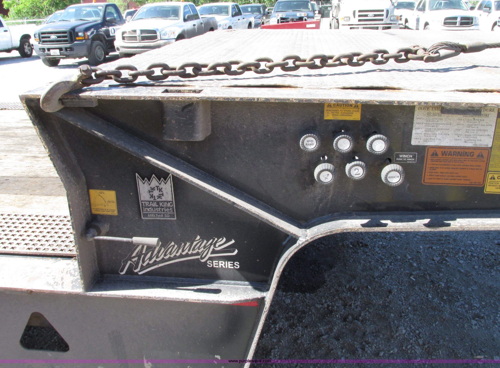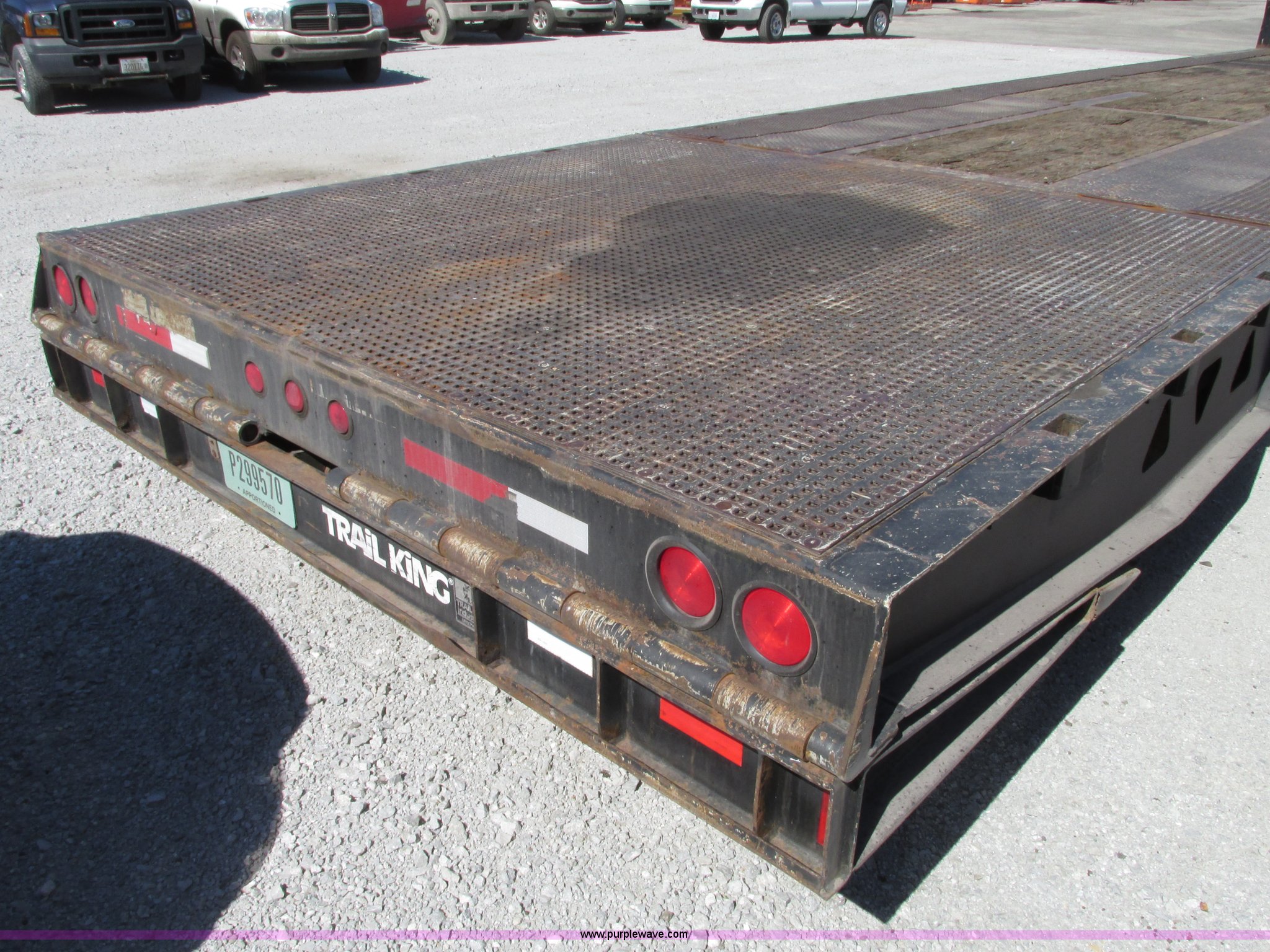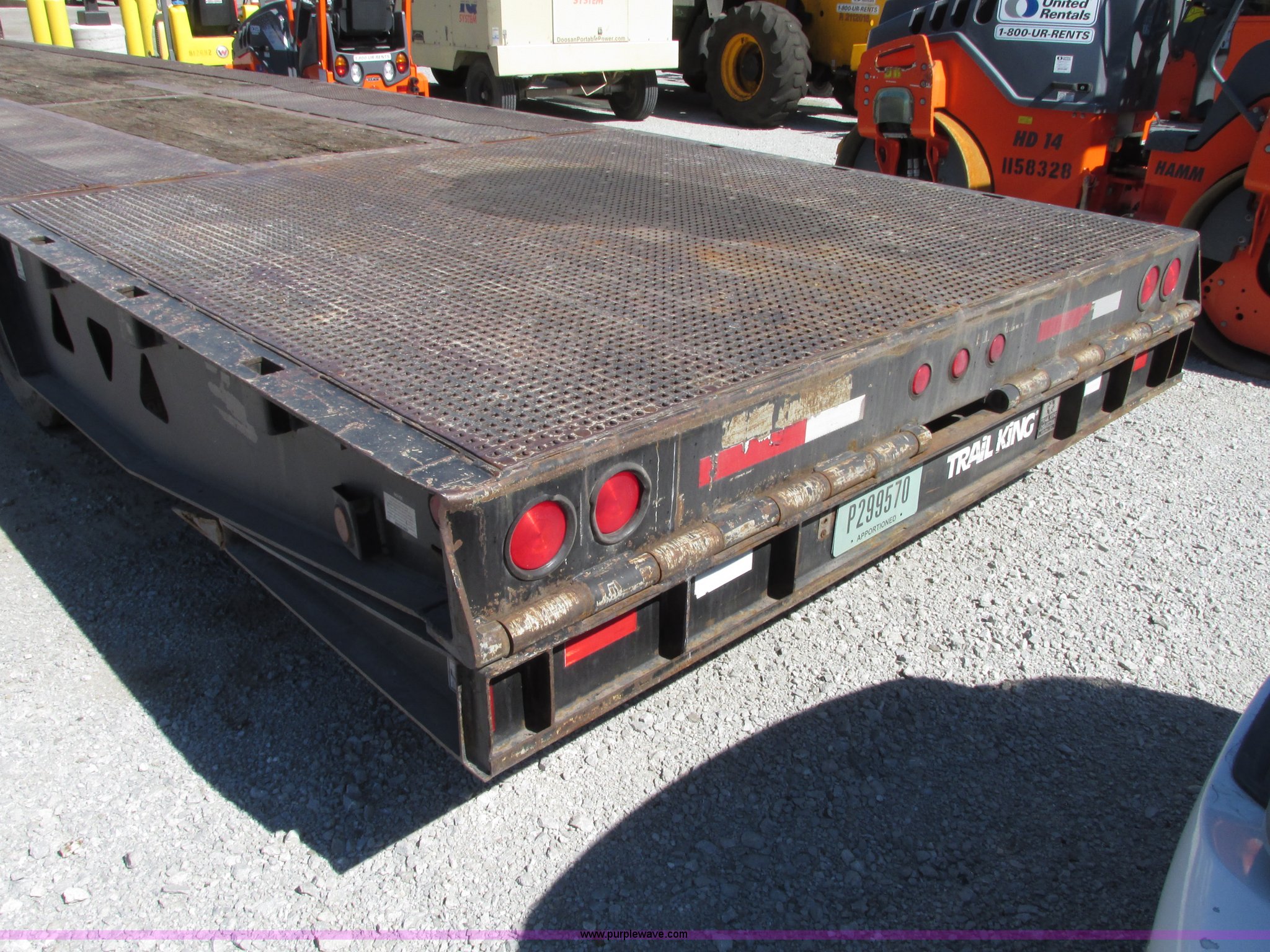 Purple Wave is selling a used Equip. Trailer in Indiana. This item is a 2006 Trail King TK70HT-482 equipment trailer with the following: 48'L x 102"W, 38.5' flatbed, 9.5' upper deck, 8' hydraulic tail with 4' fold under, 8' recessed deck ramp, Cable winch, Wood and steel deck, Dual hydraulic controls stations, 10R17.5 tires, GVWR 86,580 lbs, GAWR 17,640 lbs, EIN 580407RA