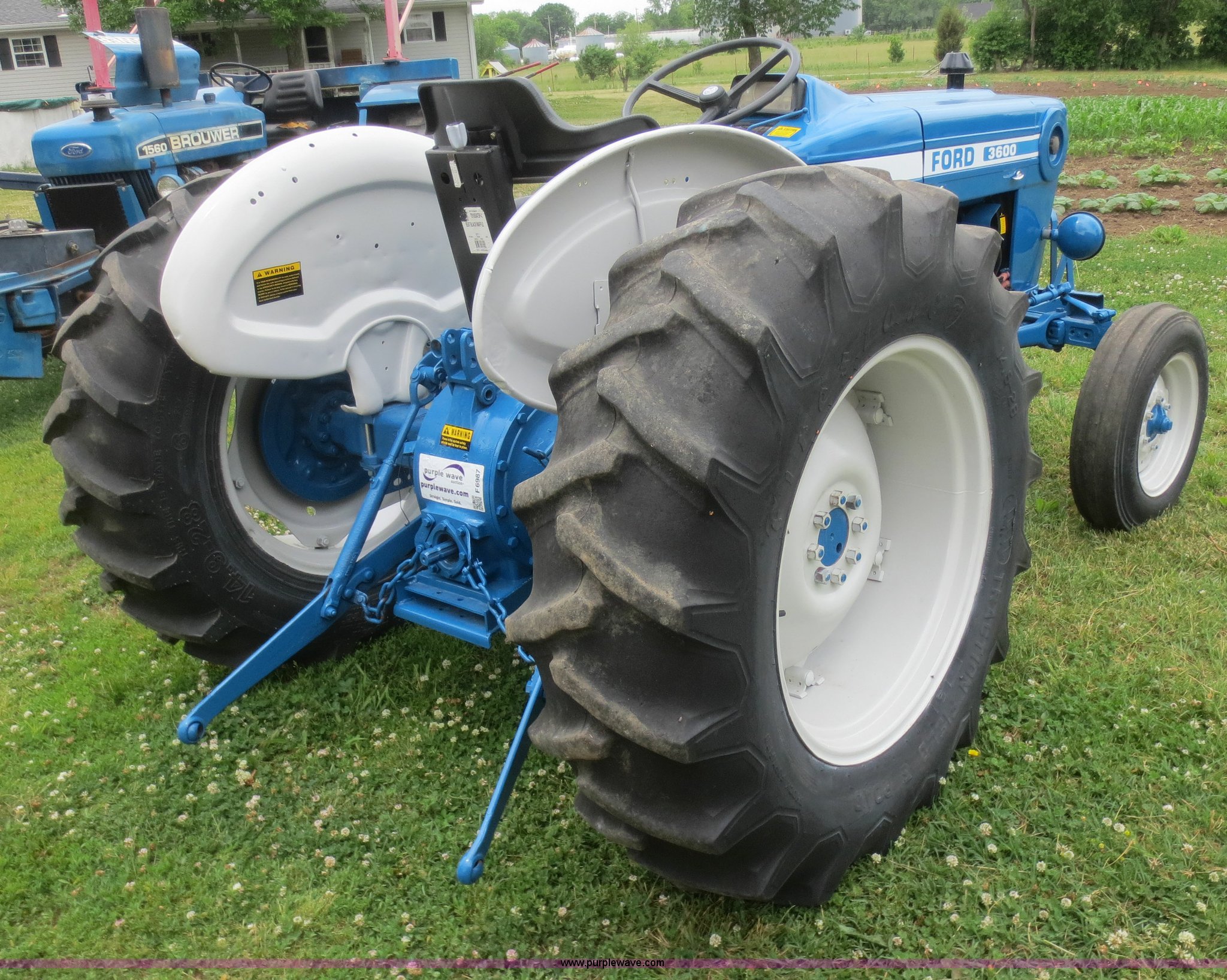 Purple Wave is selling a used Tractor in Kansas. This item is a Ford 3600 tractor with the following: 4,980 hours on meter, Ford three cylinder diesel engine, 39 HP, Approx. 5 hours on engine overhaul, Manual transmission, 8F-2R gears, Spring suspension seat, Three point, 540 PTO, 6.00-16 front tires, 14.9-28 rear tires, Serial C640970