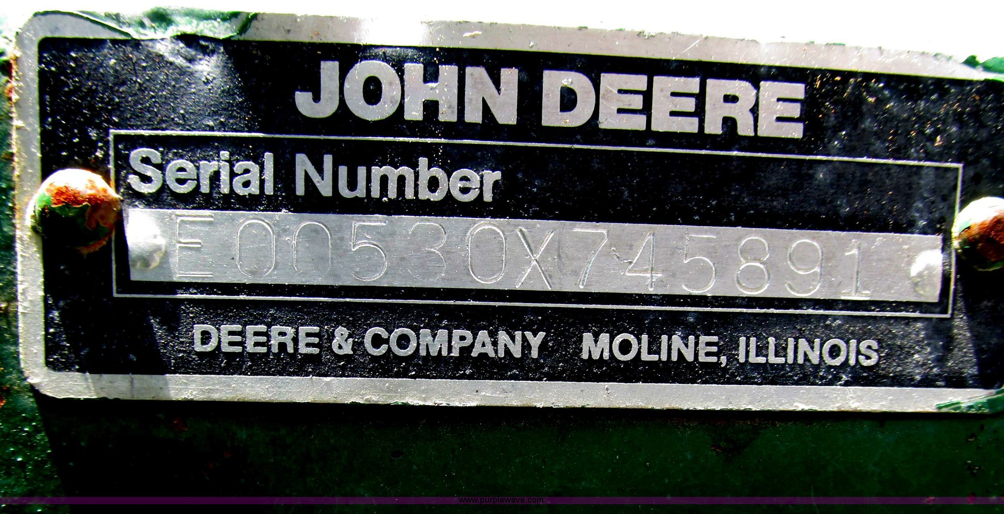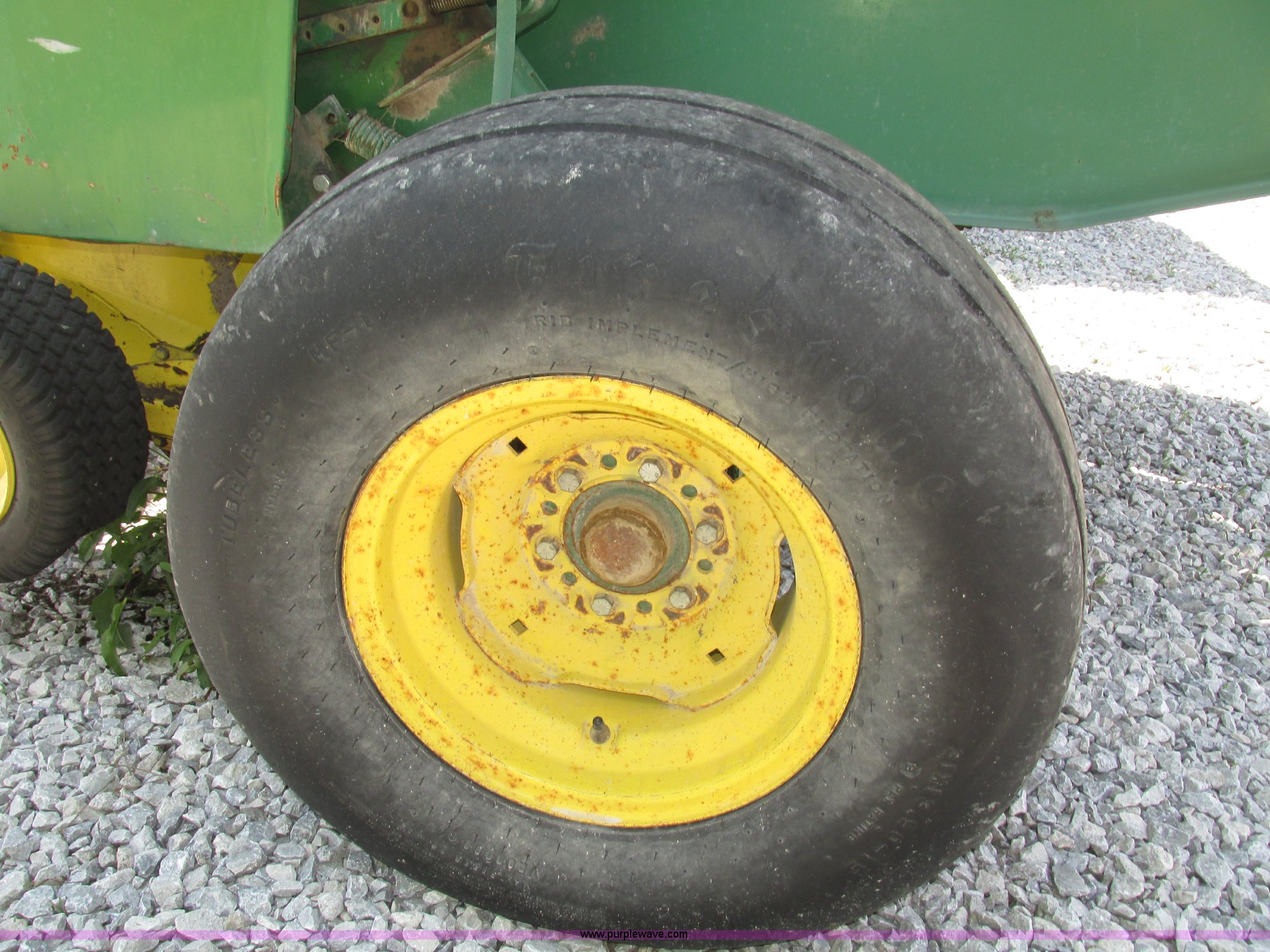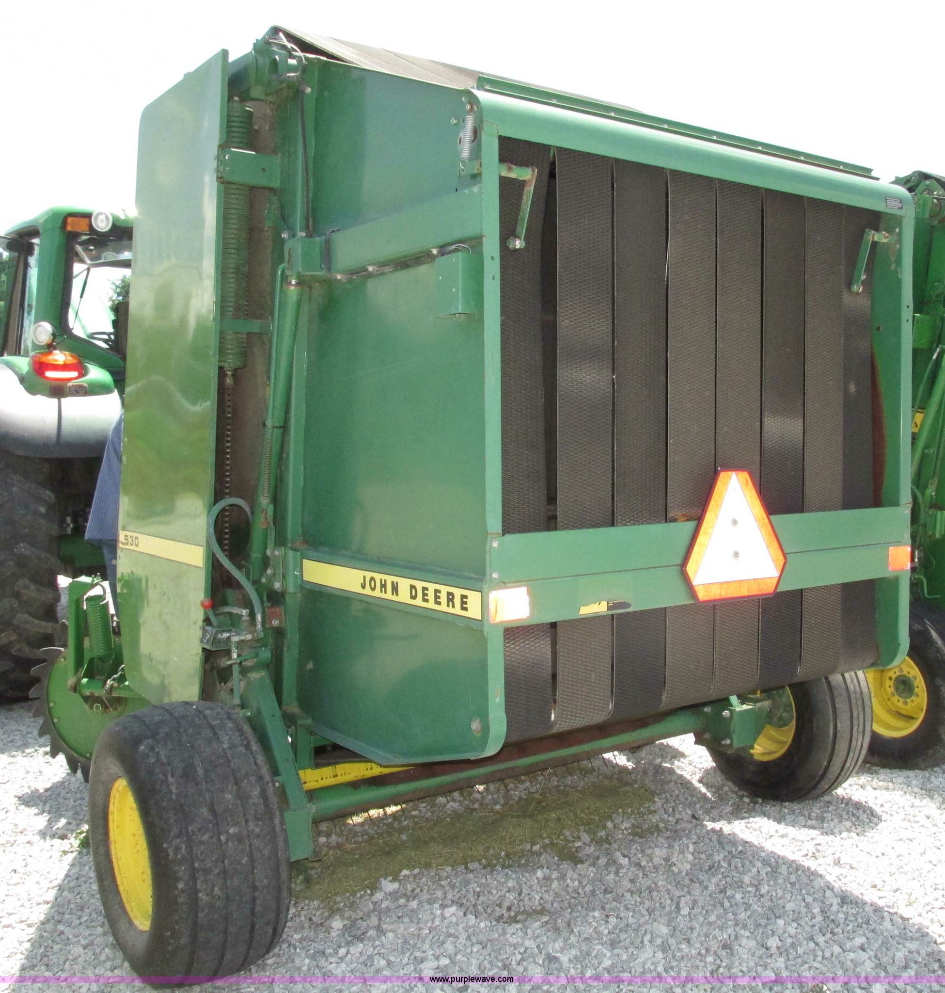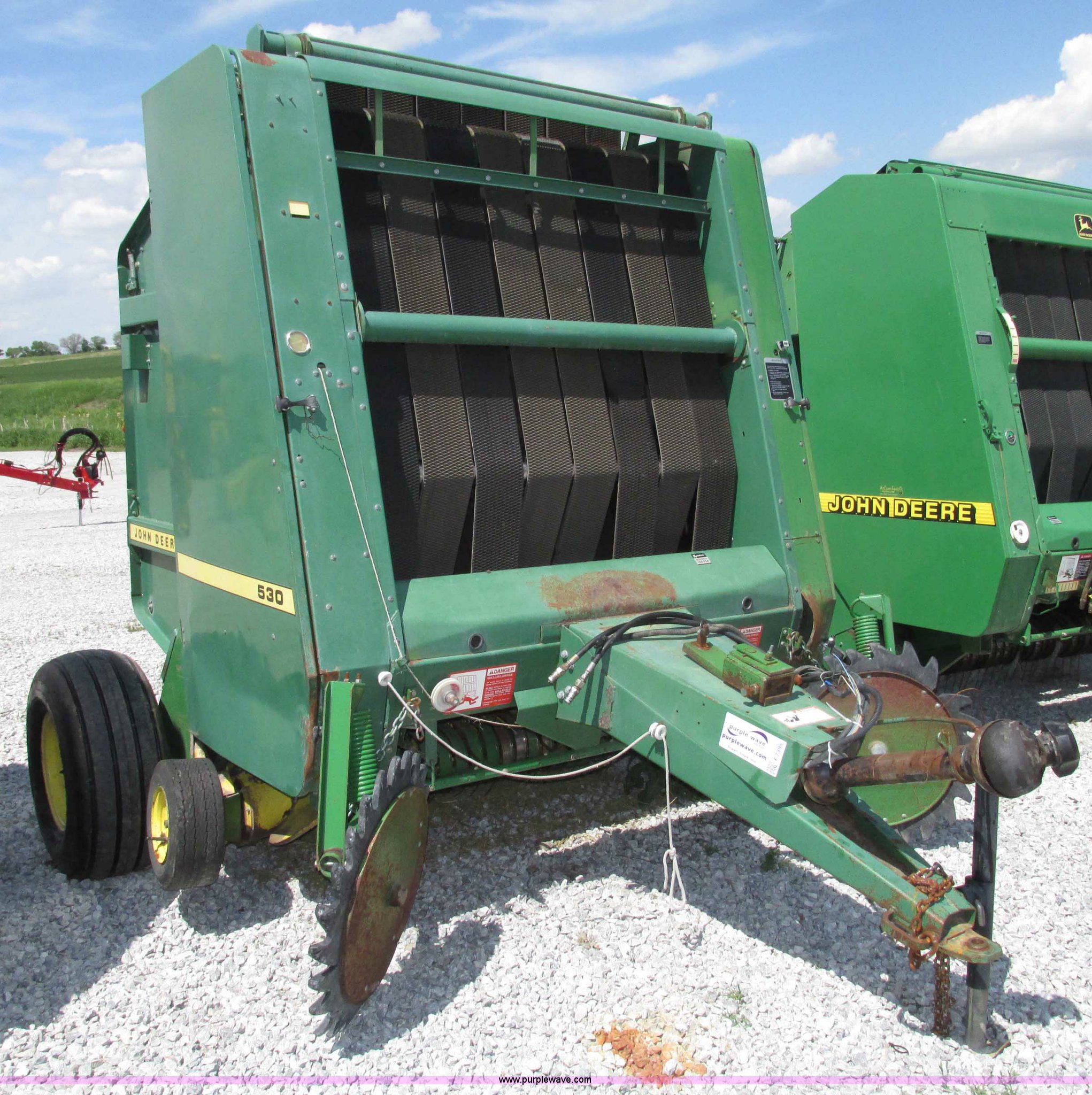 Purple Wave is selling a used Round Baler in Nebraska. This item is a 1988 John Deere 530 round baler with the following: 5' x 6' bale capacity, 540 PTO, Clevis hitch, John Deere Bale Trak monitor, Monitor cable damaged, (8) 7" belts, 60"W pickup, Gathering wheels, Auto twine tie, Manual lift, Manual bale counter, John Deere 2,000 lbs tongue jack stand, Seven pin electrical connector, (2) hydraulic hose with male fittings, Hose hanger, Clevis to draw bar adapter, Six bolt steel wheels, 16-6.50-8 NHS gauge wheels, 31x13.50-15 ribbed tires, Eight ply, Parts and operator manuals, SMV emblem, Partial roll of twine, Recently replaced bearings, Recently replaced belts, Serial E00530X745891, Unit# 165954