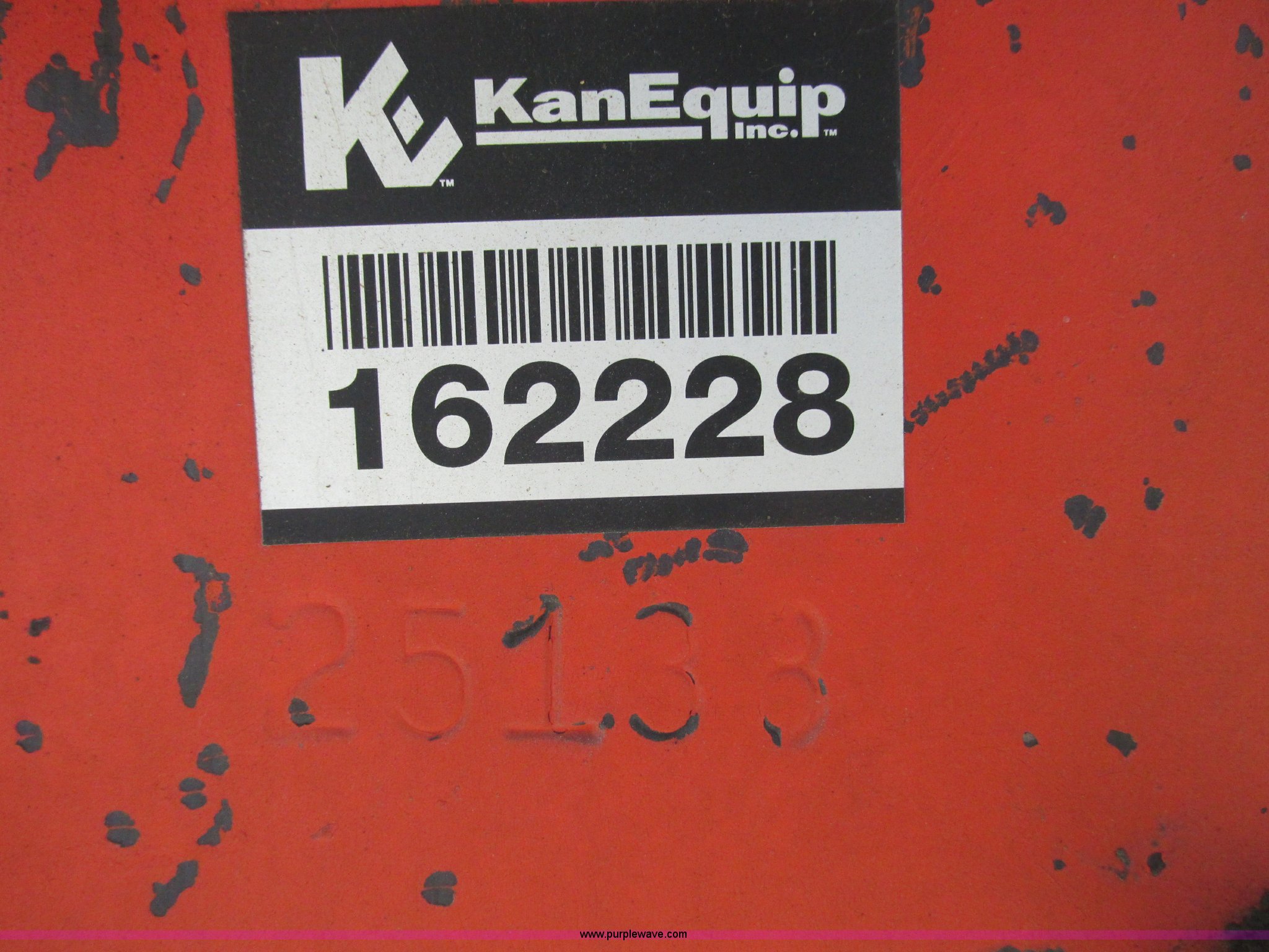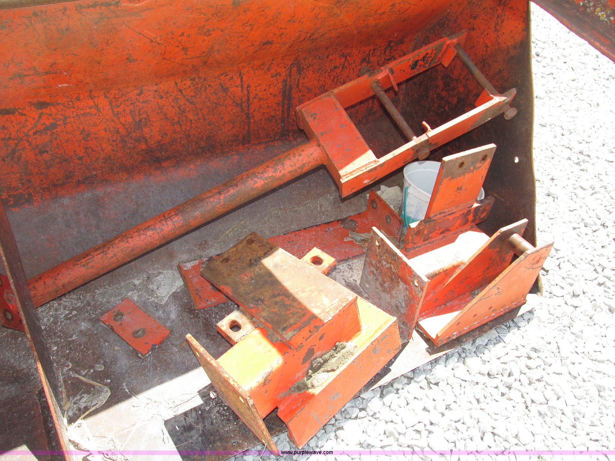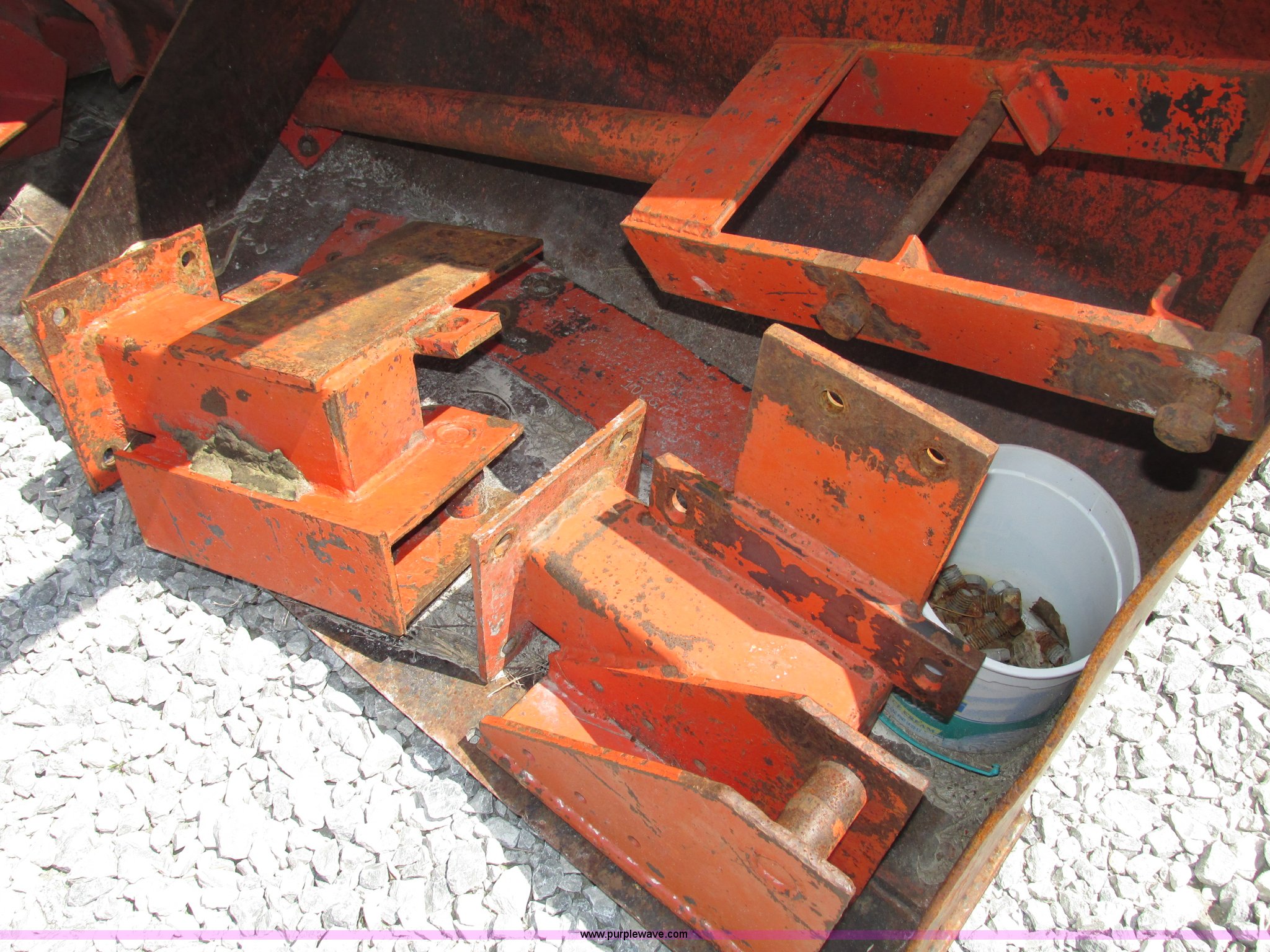 Du-Al 3100 loader attachment and grapple. 84"W smooth edge bucket, 55"W four tine grapple forks, Twin cylinder lift and bucket tilt, Single cylinder grapple forks, Three lever control (2) knobs missing, Adjustable cylinder pin placement lift, Mounting brackets and stand, Hose torn and cracks, Unit# 162228. Kan Equip, Inc.. 330 17th St. Syracuse, NE 68446