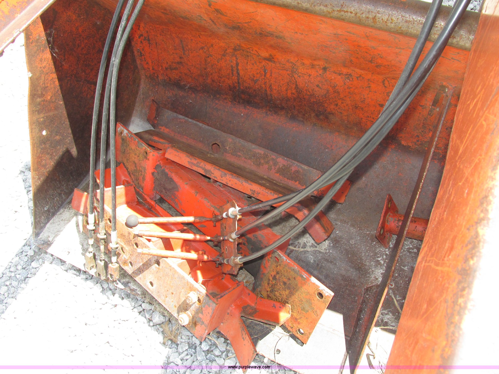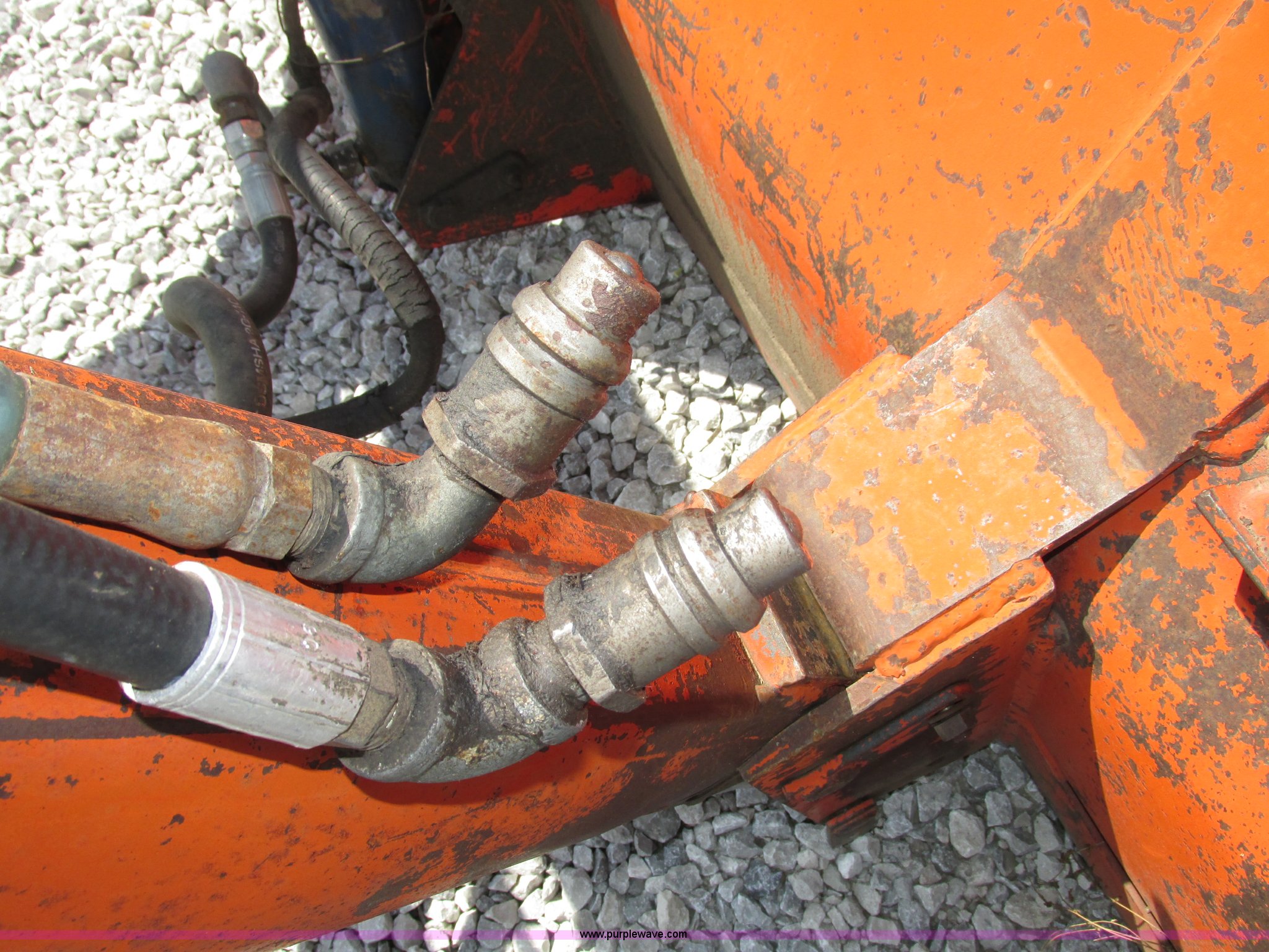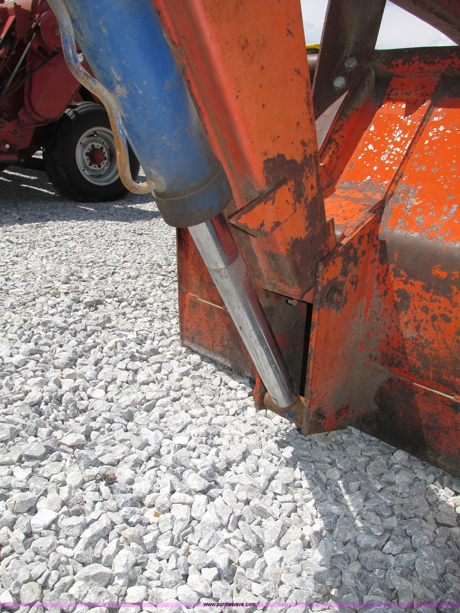 Du-Al 3100 loader attachment and grapple. 84"W smooth edge bucket, 55"W four tine grapple forks, Twin cylinder lift and bucket tilt, Single cylinder grapple forks, Three lever control (2) knobs missing, Adjustable cylinder pin placement lift, Mounting brackets and stand, Hose torn and cracks, Unit# 162228. Kan Equip, Inc.. 330 17th St. Syracuse, NE 68446