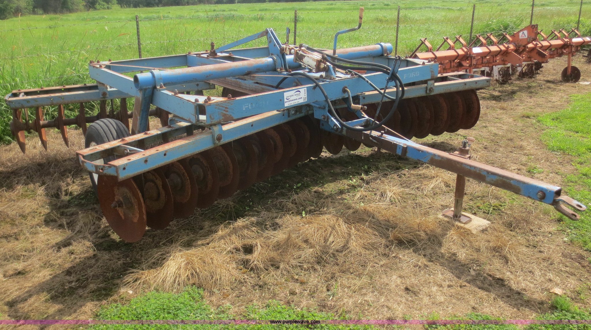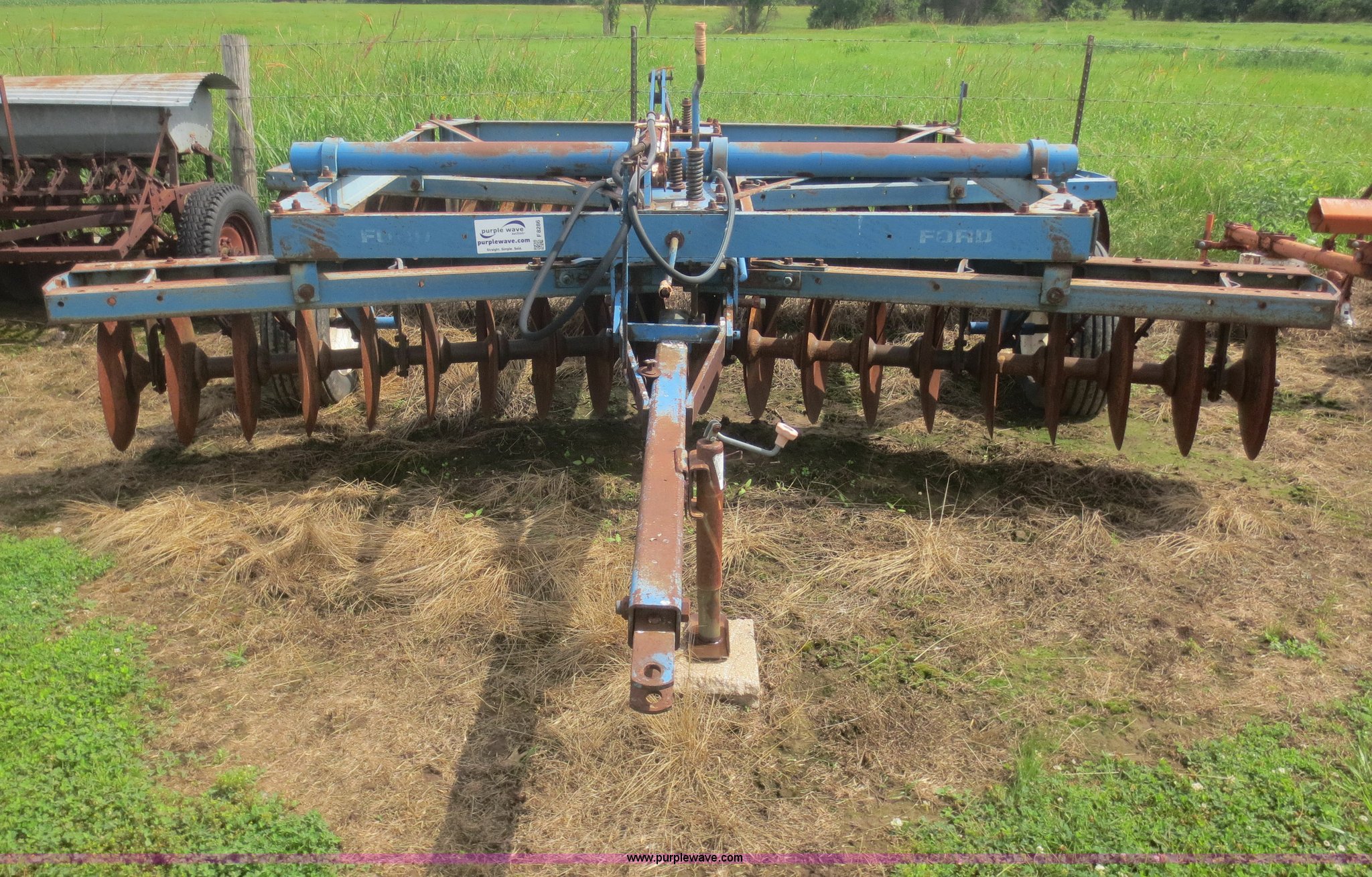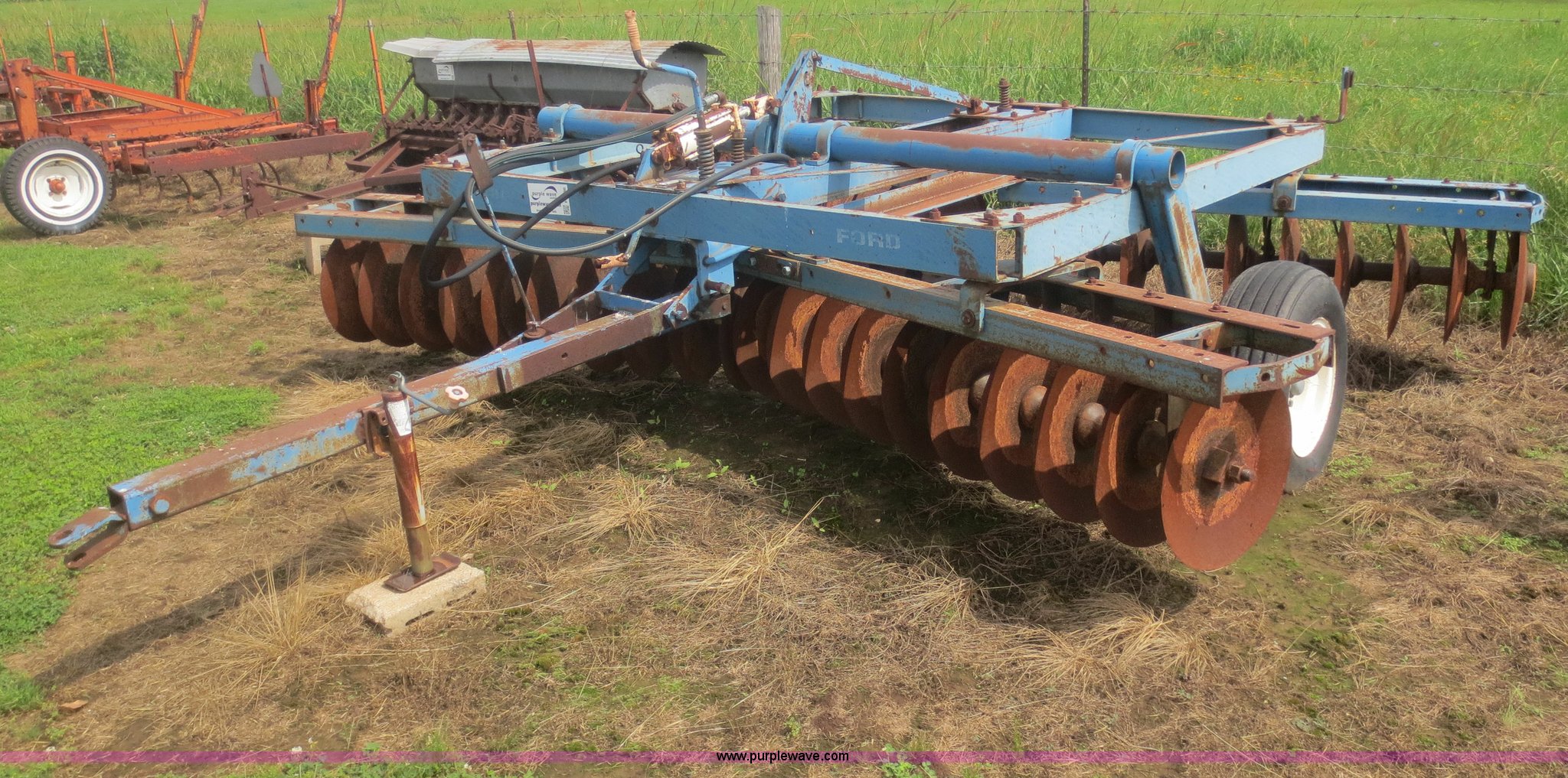 Purple Wave is selling a used Disk in Kansas. This item is a Ford 240 tandem off-set disk with the following: 13'W, 19" front blades, 20" rear blades, Hydraulic lift, Pin hitch, 11L-15 tires, Serial WN12232
