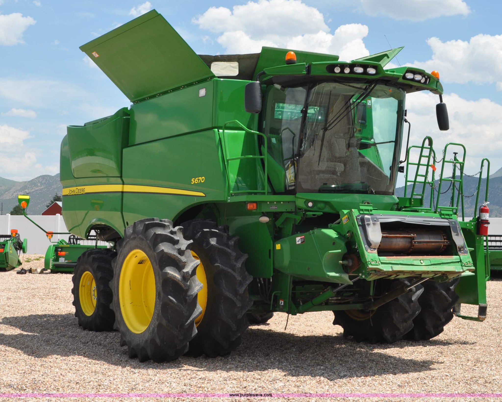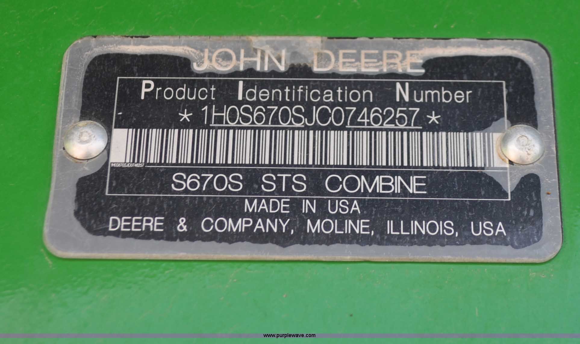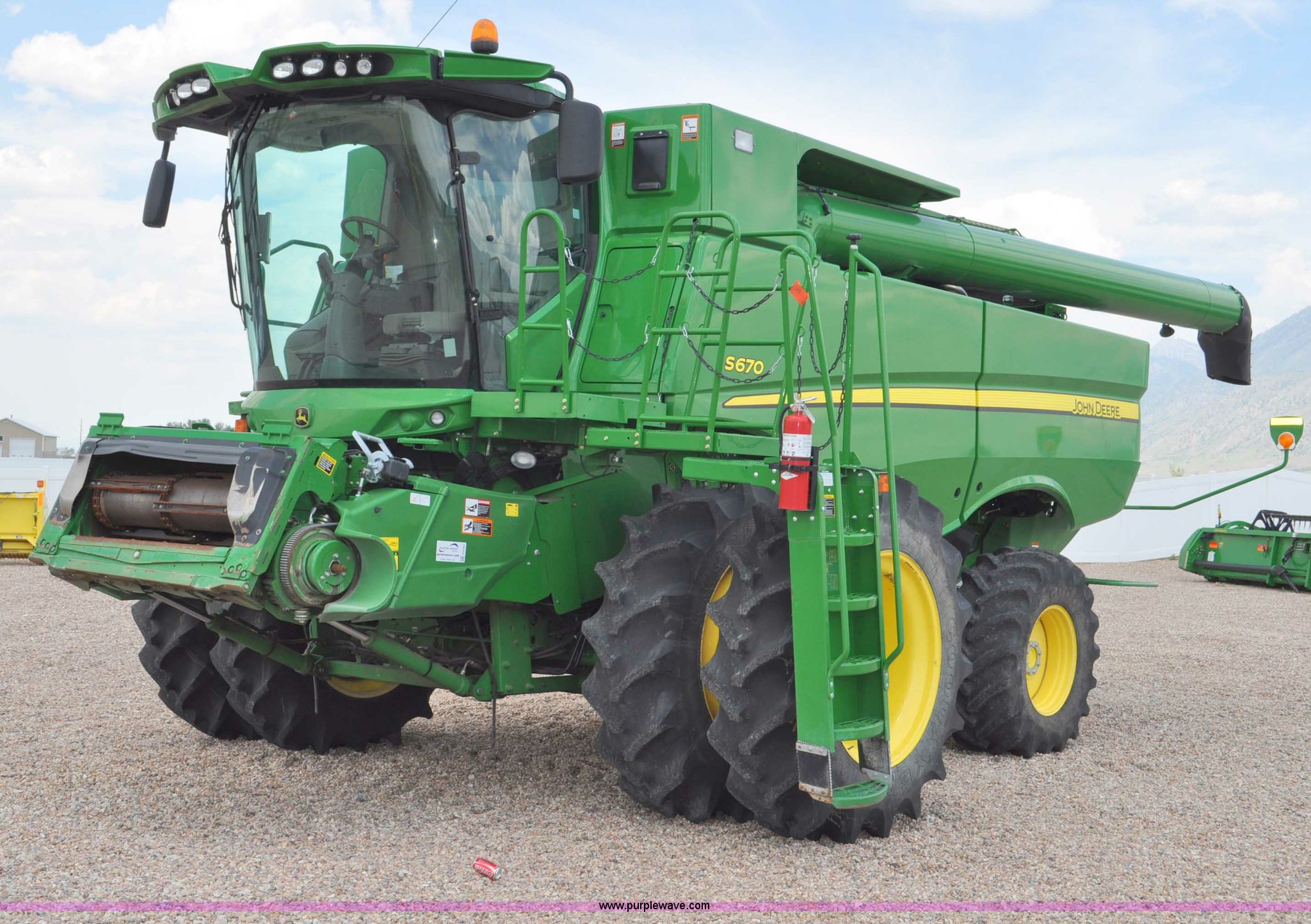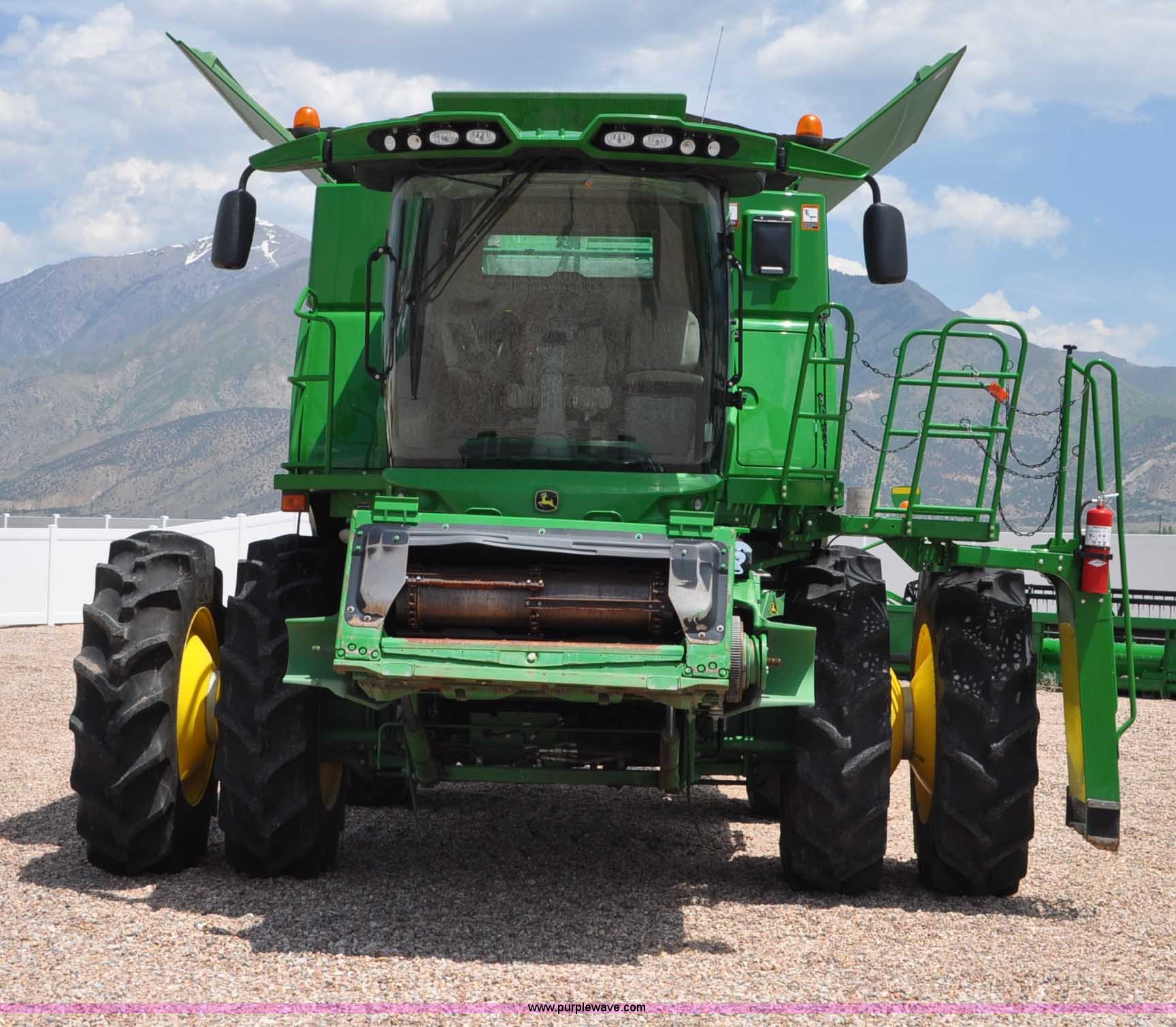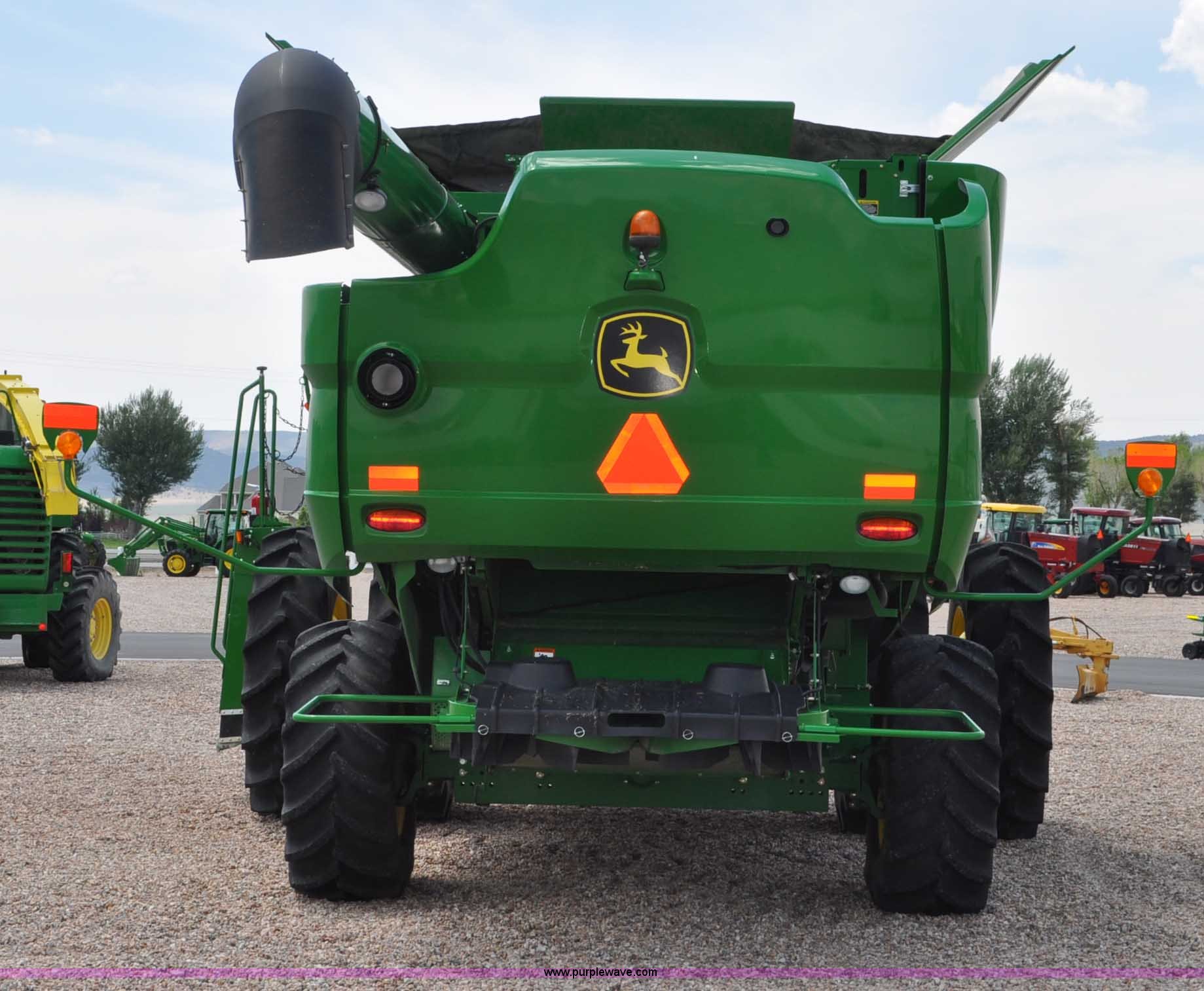 Purple Wave is selling a used Combine in Utah. This item is a 2012 John Deere S670 combine with the following: 615 engine hours on meter, 389 separator hours on meter, John Deere 6090 six cylinder diesel engine, 373 HP, Serial RG6090R017942, ProDrive hydrostatic transmission, 2F-2R gears, Contour Master feeder house, Reverser, Single point hookup, Straw chopper, Differential lock, Premium cab, AC and heat, AM/FM/CD/MP3/XM/weatherband/bluetooth, Air suspension seat, Instructor's seat, Tilt steering wheel, Shades and visors, GS3 2630 mounted on arm rest, Auto trac equipped, No GPS receiver, 12V refrigerator under instructor's seat, Power and heated mirrors, Bin extensions, Work lights, Straw spreader, Greenstar enabled, Yield monitor, Yield mapping, 300 bu. bin capacity, HarvestSmart feedrate control system, Powercast powered tailboard, Small wire concaves, 520/85R42 dual front tires, 600/65R28 rear tires, Operator's manual, Recently replaced batteries, Unit from Mormon Church Farm, Serial 1H0S670SJC0746257, Dealer Tag# U13J0695