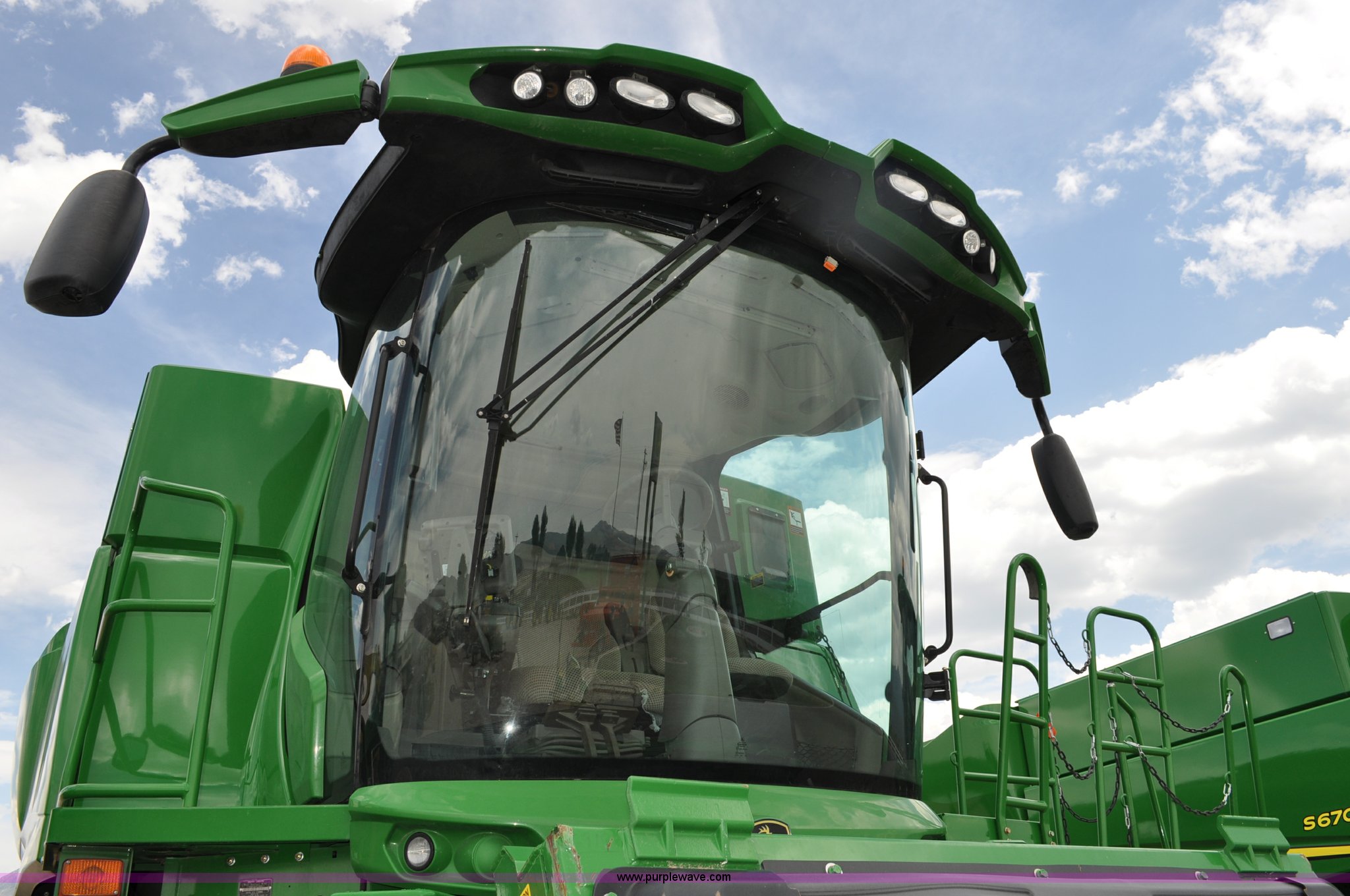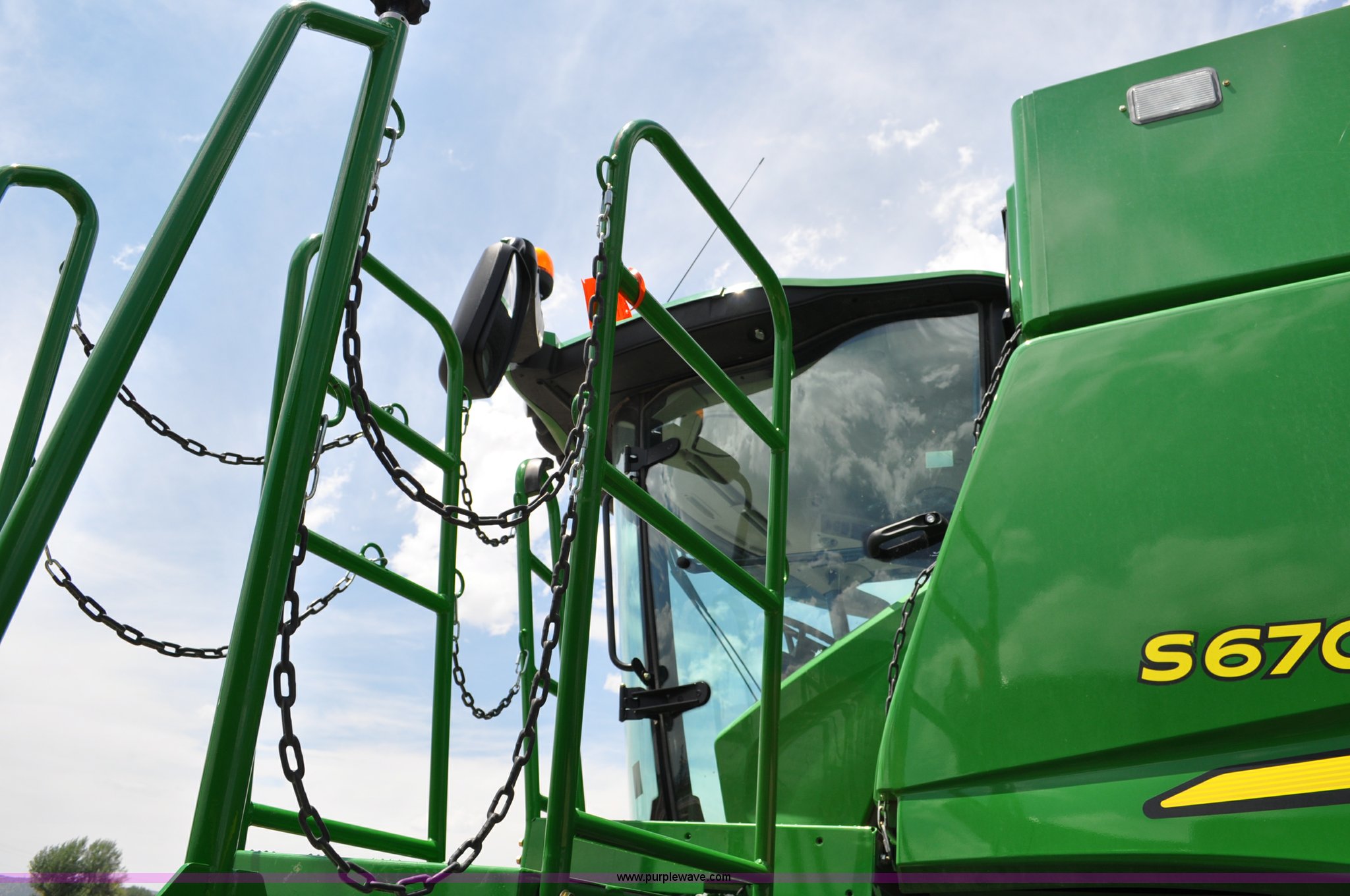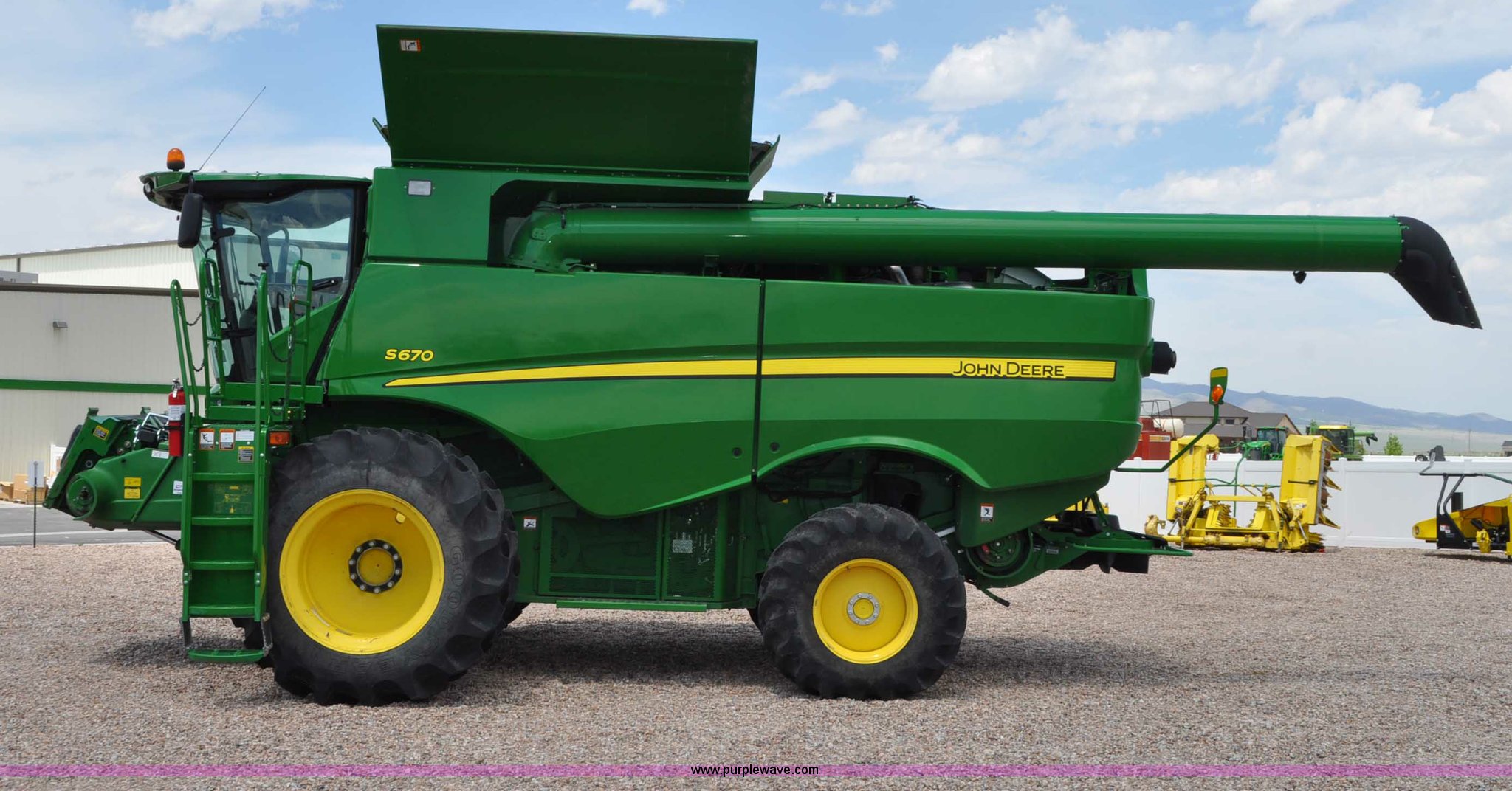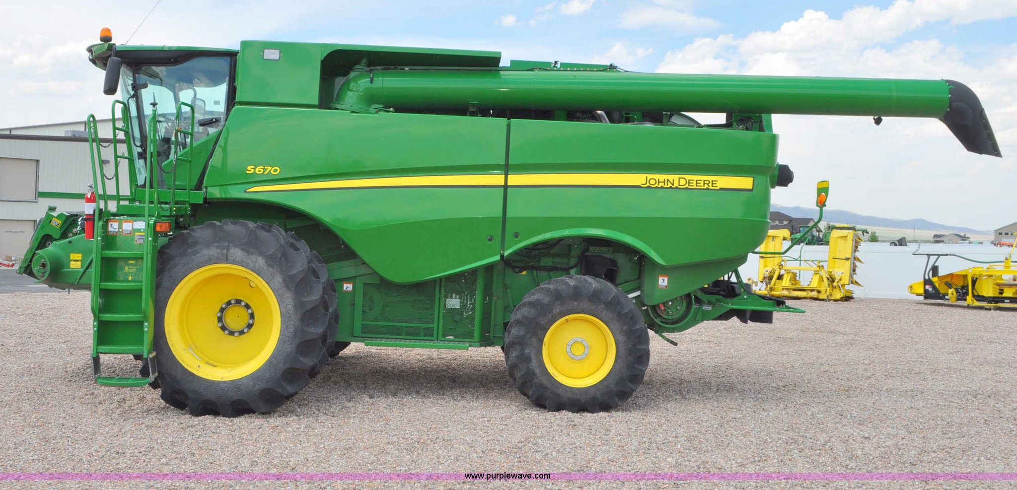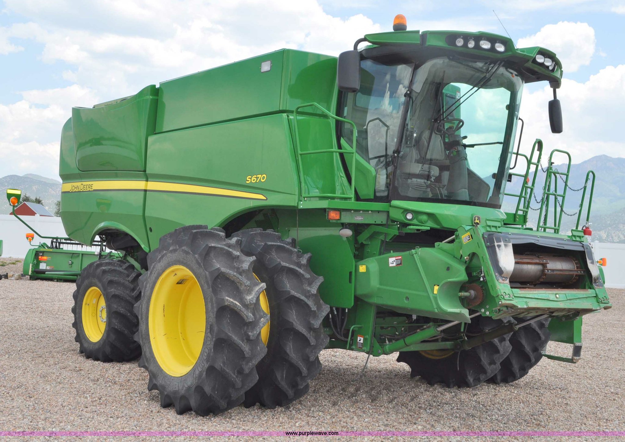 Purple Wave is selling a used Combine in Utah. This item is a 2012 John Deere S670 combine with the following: 615 engine hours on meter, 389 separator hours on meter, John Deere 6090 six cylinder diesel engine, 373 HP, Serial RG6090R017942, ProDrive hydrostatic transmission, 2F-2R gears, Contour Master feeder house, Reverser, Single point hookup, Straw chopper, Differential lock, Premium cab, AC and heat, AM/FM/CD/MP3/XM/weatherband/bluetooth, Air suspension seat, Instructor's seat, Tilt steering wheel, Shades and visors, GS3 2630 mounted on arm rest, Auto trac equipped, No GPS receiver, 12V refrigerator under instructor's seat, Power and heated mirrors, Bin extensions, Work lights, Straw spreader, Greenstar enabled, Yield monitor, Yield mapping, 300 bu. bin capacity, HarvestSmart feedrate control system, Powercast powered tailboard, Small wire concaves, 520/85R42 dual front tires, 600/65R28 rear tires, Operator's manual, Recently replaced batteries, Unit from Mormon Church Farm, Serial 1H0S670SJC0746257, Dealer Tag# U13J0695