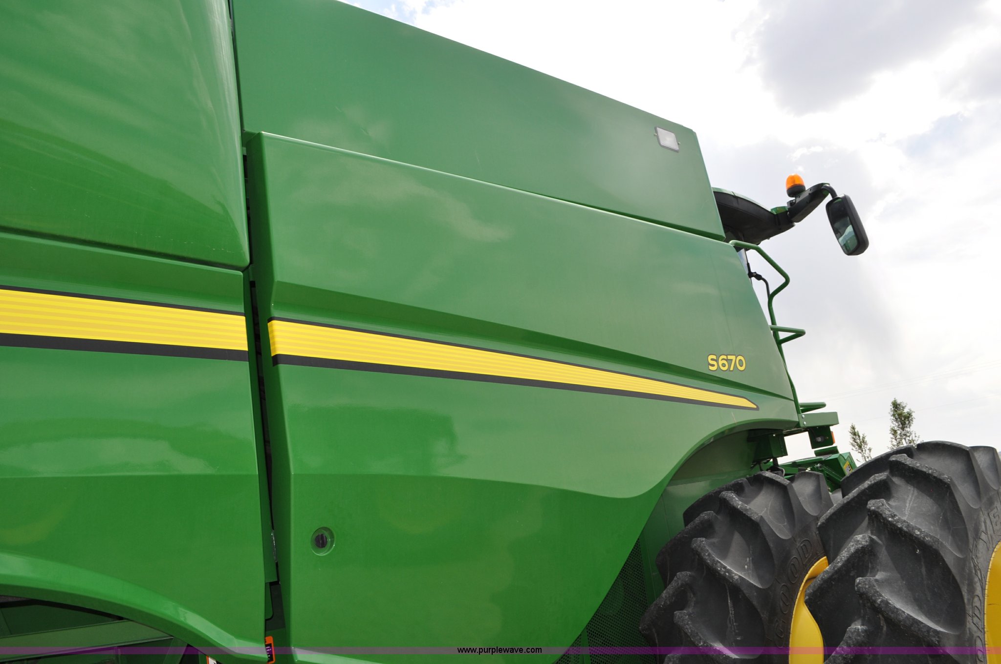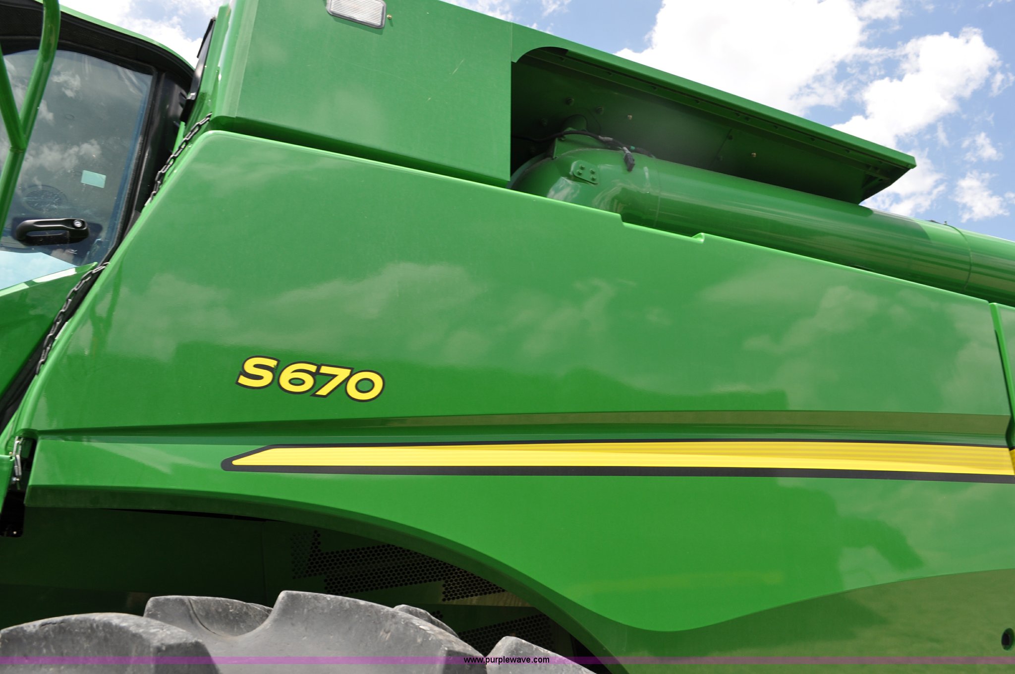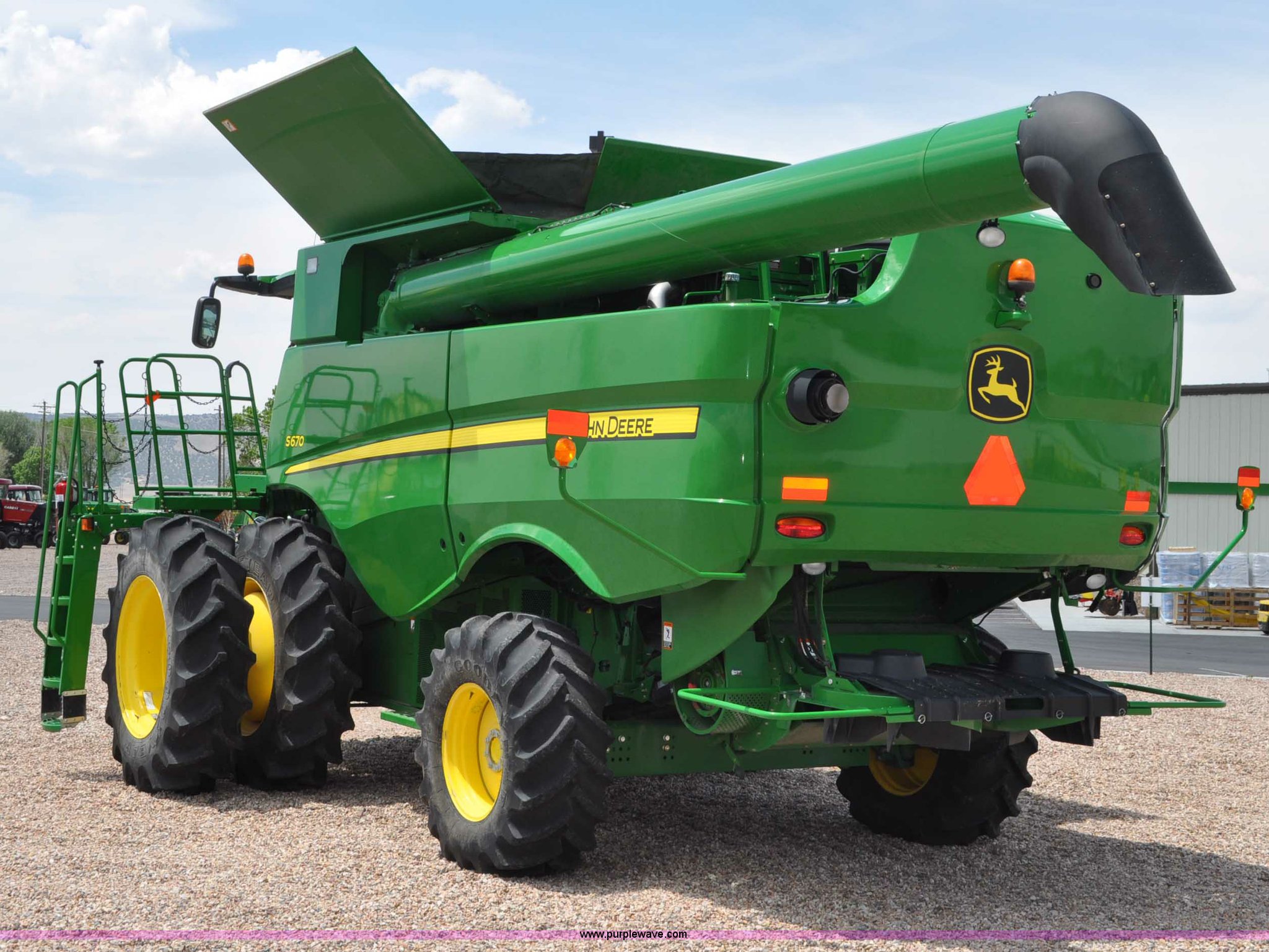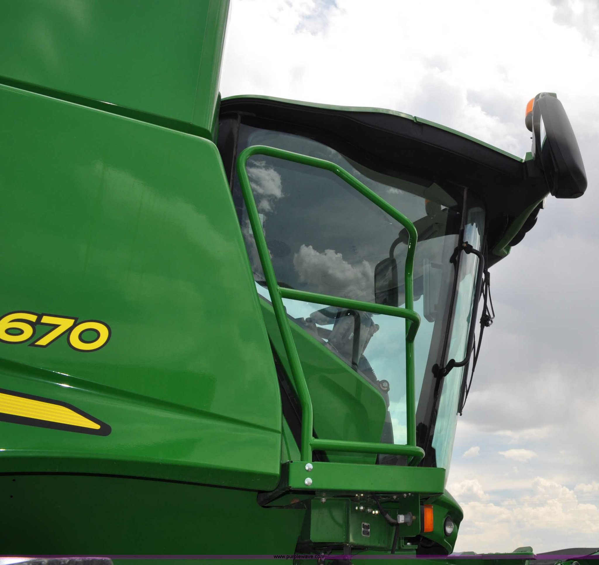 Purple Wave is selling a used Combine in Utah. This item is a 2012 John Deere S670 combine with the following: 615 engine hours on meter, 389 separator hours on meter, John Deere 6090 six cylinder diesel engine, 373 HP, Serial RG6090R017942, ProDrive hydrostatic transmission, 2F-2R gears, Contour Master feeder house, Reverser, Single point hookup, Straw chopper, Differential lock, Premium cab, AC and heat, AM/FM/CD/MP3/XM/weatherband/bluetooth, Air suspension seat, Instructor's seat, Tilt steering wheel, Shades and visors, GS3 2630 mounted on arm rest, Auto trac equipped, No GPS receiver, 12V refrigerator under instructor's seat, Power and heated mirrors, Bin extensions, Work lights, Straw spreader, Greenstar enabled, Yield monitor, Yield mapping, 300 bu. bin capacity, HarvestSmart feedrate control system, Powercast powered tailboard, Small wire concaves, 520/85R42 dual front tires, 600/65R28 rear tires, Operator's manual, Recently replaced batteries, Unit from Mormon Church Farm, Serial 1H0S670SJC0746257, Dealer Tag# U13J0695